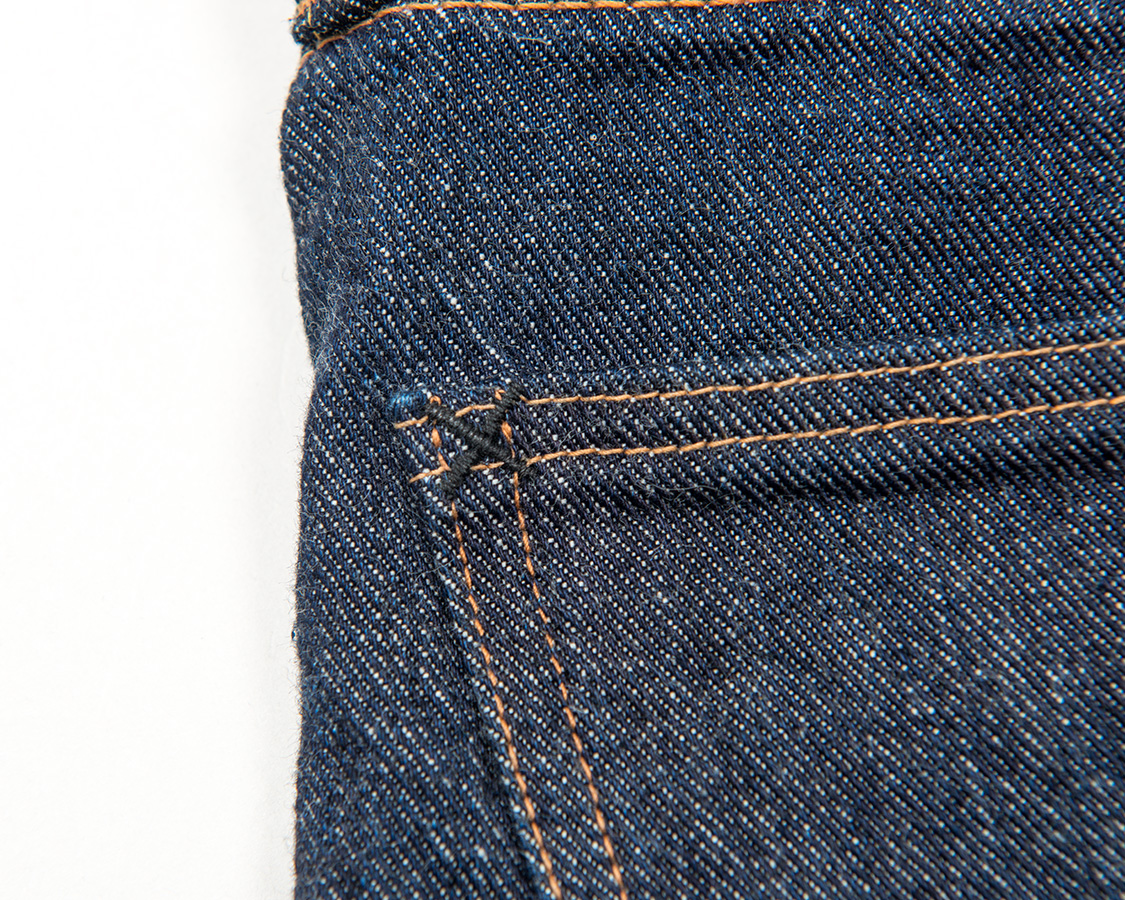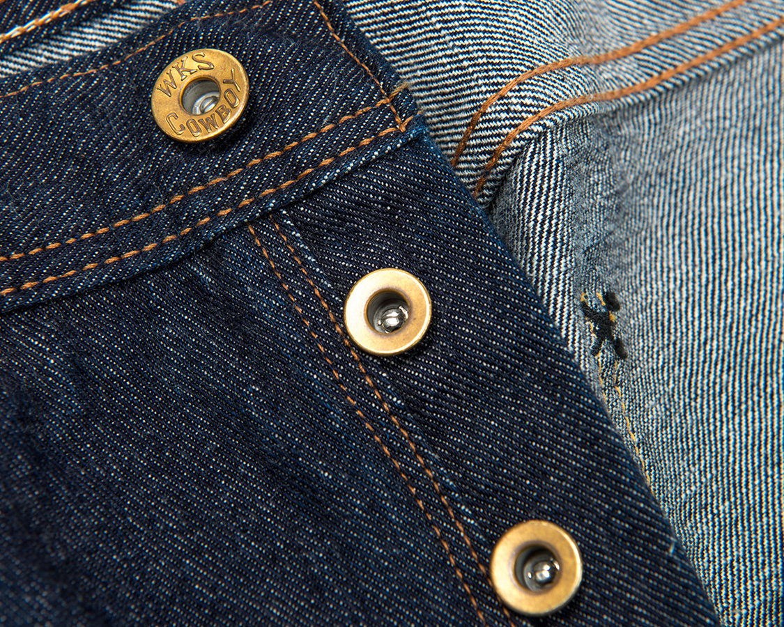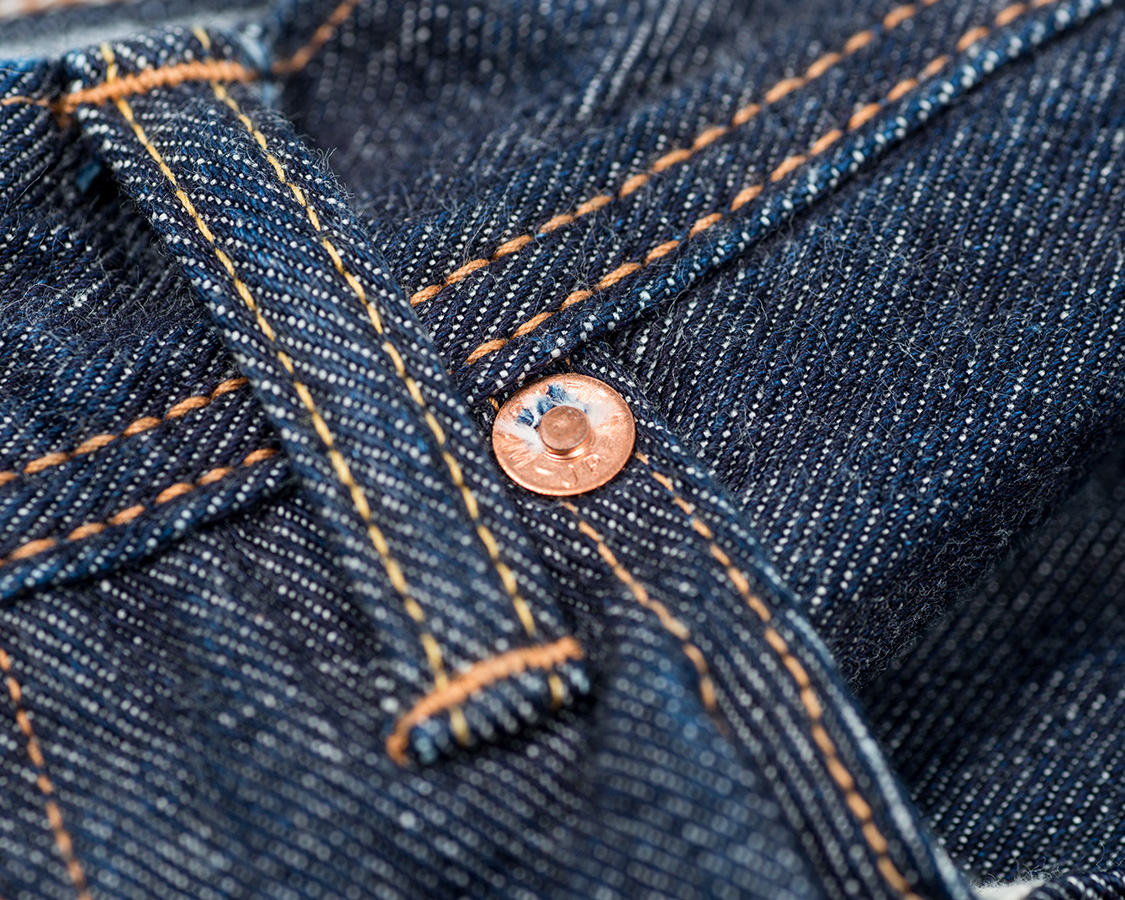 カンザスのカウボーイウェア的にはUFOリベットが正解なのですが、ここはあえて、サンフランシスコ的に打ち抜き。それも、極初期に見られたハンマー叩き潰しリベットをモチーフに、現代の技術でリベットをつぶします。YKKの技術力、百発百中でリベットをつぶす仕組みがあるのです。(内緒ですが、YKKに聞けばわかります)