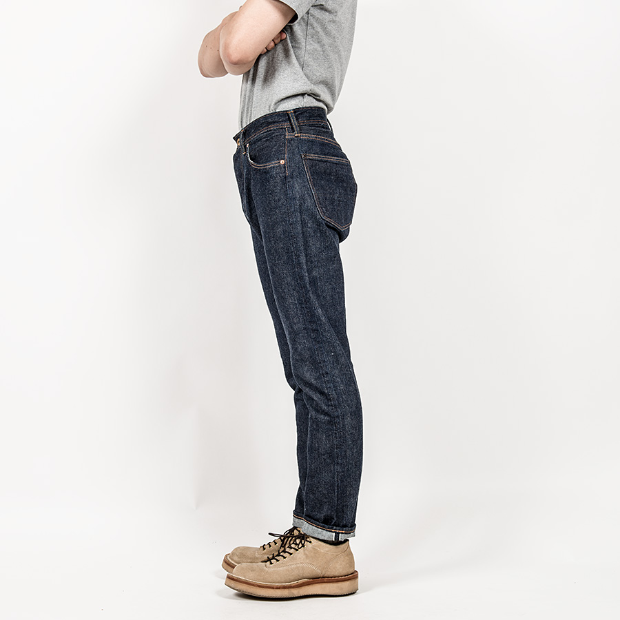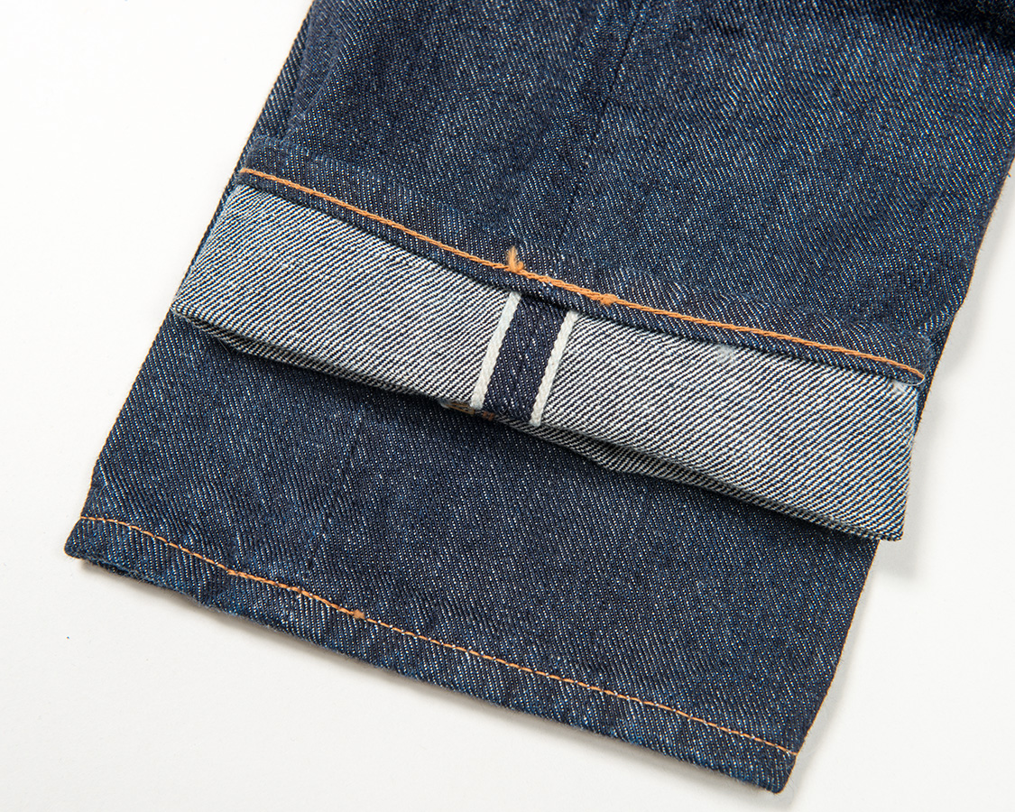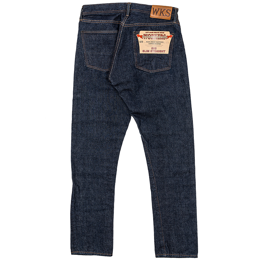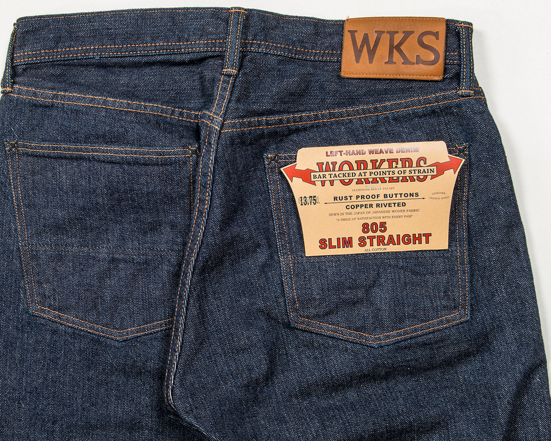 フラッシャーがちょっと光ってしまいましたが、LEFT-HAND WEAVE DENIM、左綾であること。品番の805、シルエットを表すSLIM STRAIGHT。一目で805とわかるよう、フラッシャーをデザインしています。