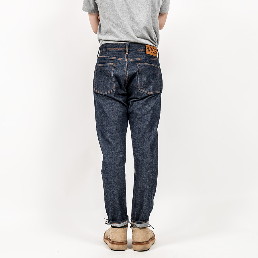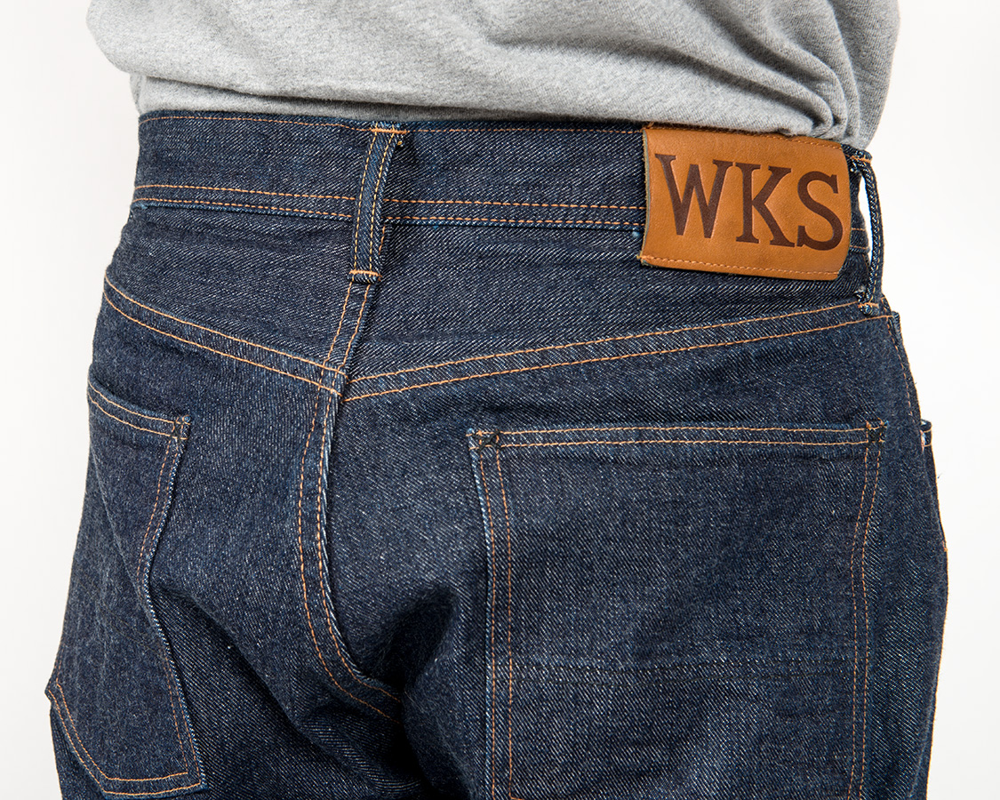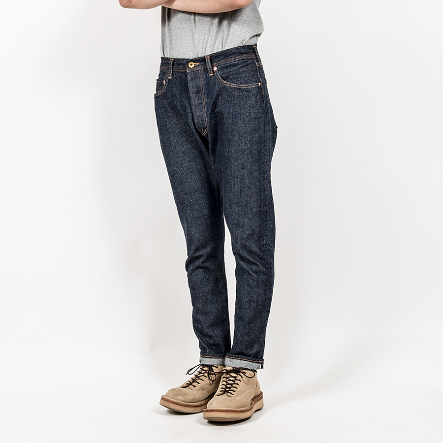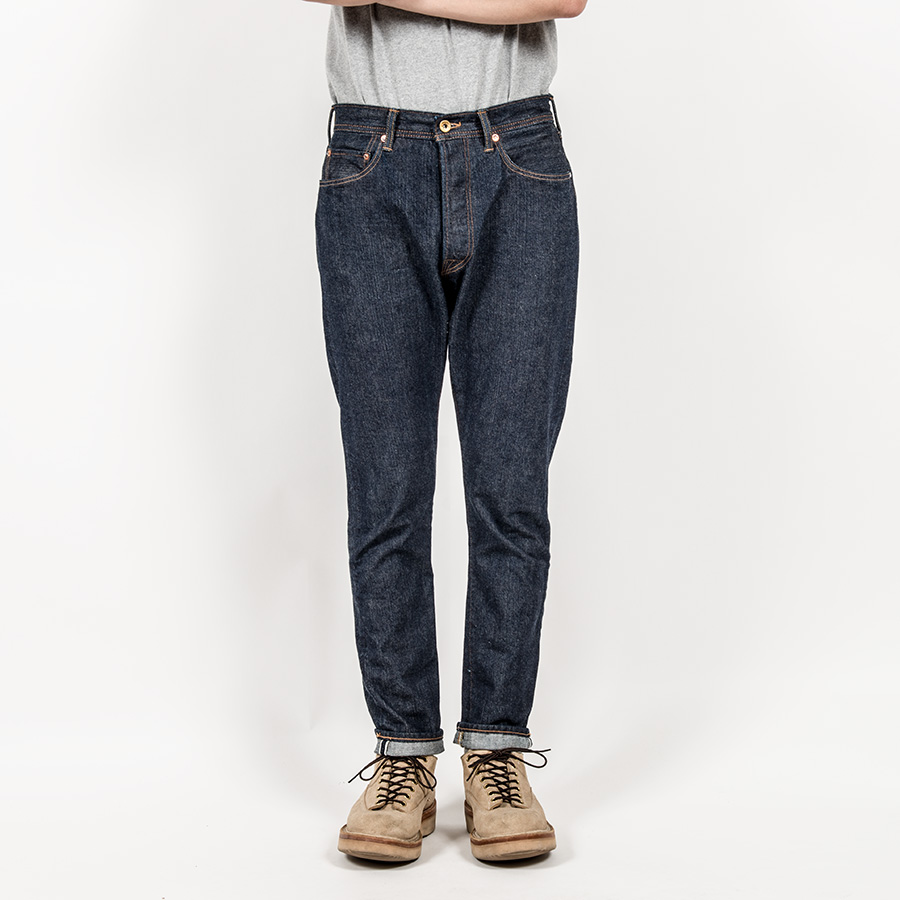 フラッシャーがちょっと光ってしまいましたが、LEFT-HAND WEAVE DENIM、左綾であること。品番の805、シルエットを表すSLIM STRAIGHT。一目で805とわかるよう、フラッシャーをデザインしています。
