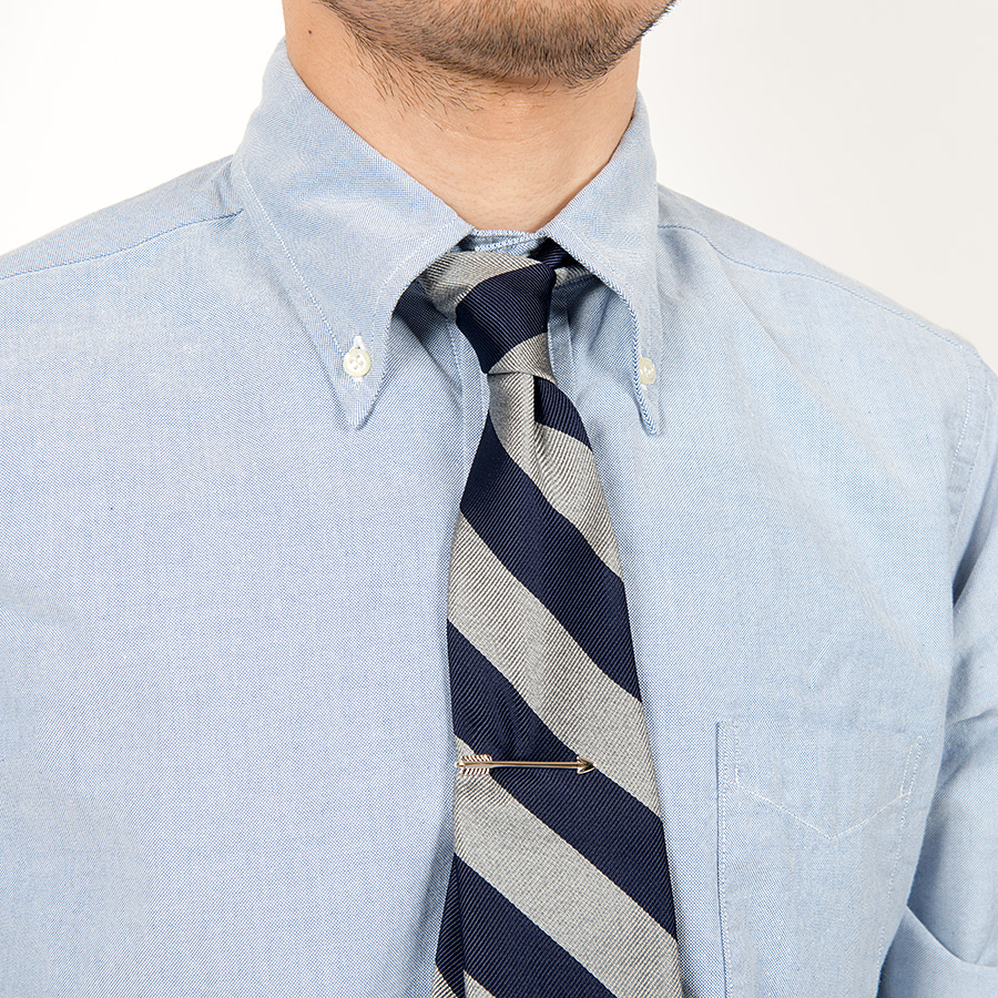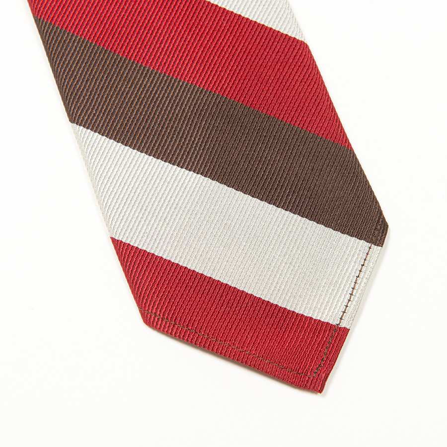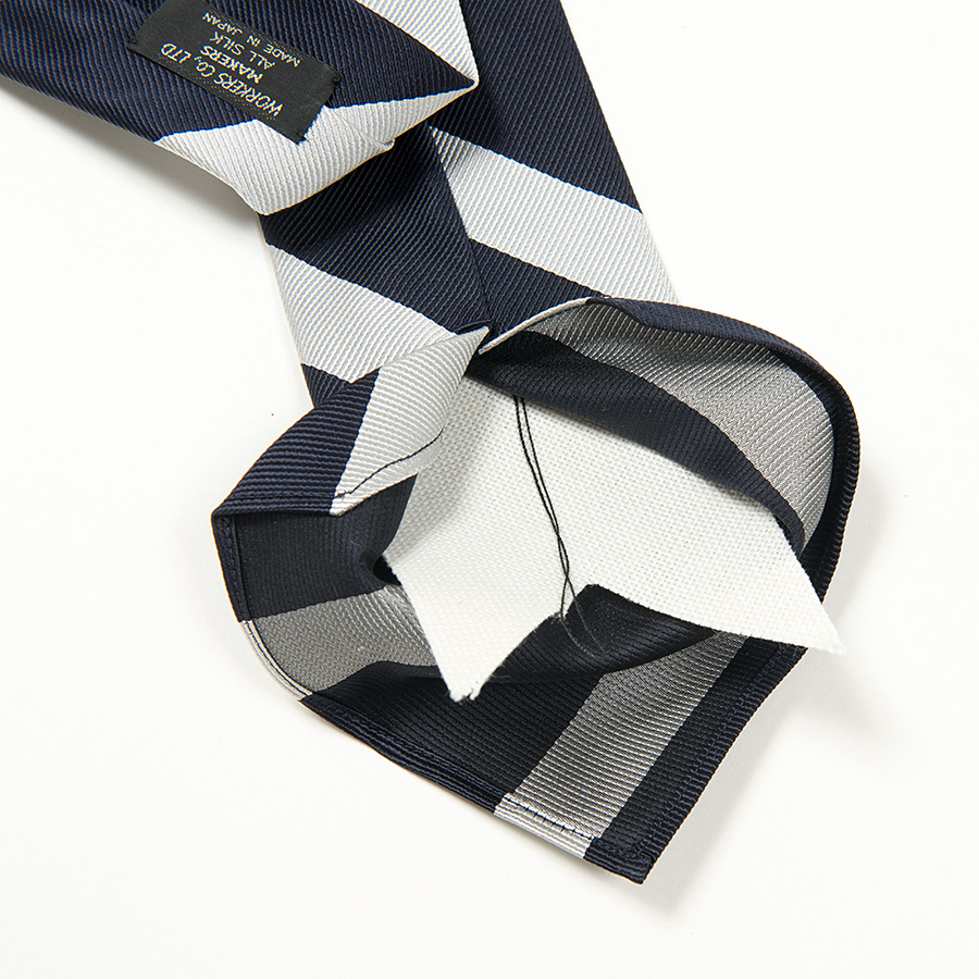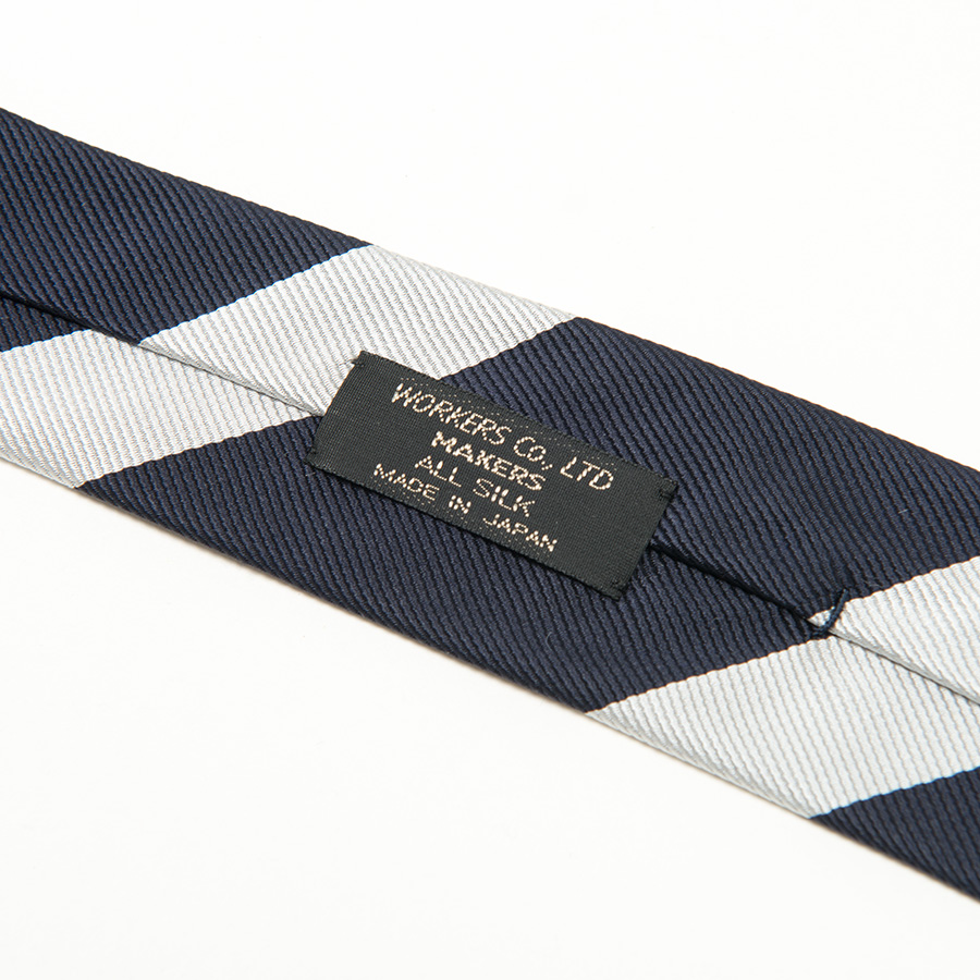 レジメンタルタイ、柄の流れはアメリカ式に左上から右下に流れるよう、裁断。 縫製はあえてミシンステッチで剣先を三つ巻き。剣先に裏地がつかない分、軽 やか。 いわゆる「現代のトラッドな服」、品質はとてもよいのですが、どこか重く感じる。一方、ビンテージで見るそれはある意味チープな部分がありつつも、軽やか。そんな軽い仕様を取り入れたWORKERSのRepp Tie。時間とともに変化を感じることができます。 |