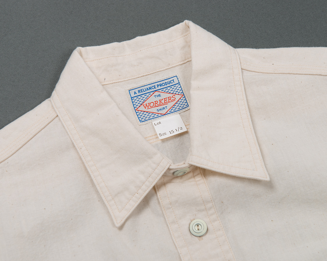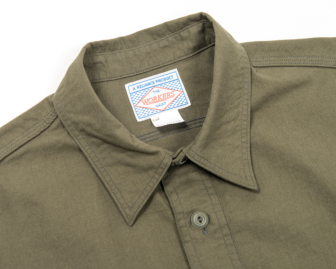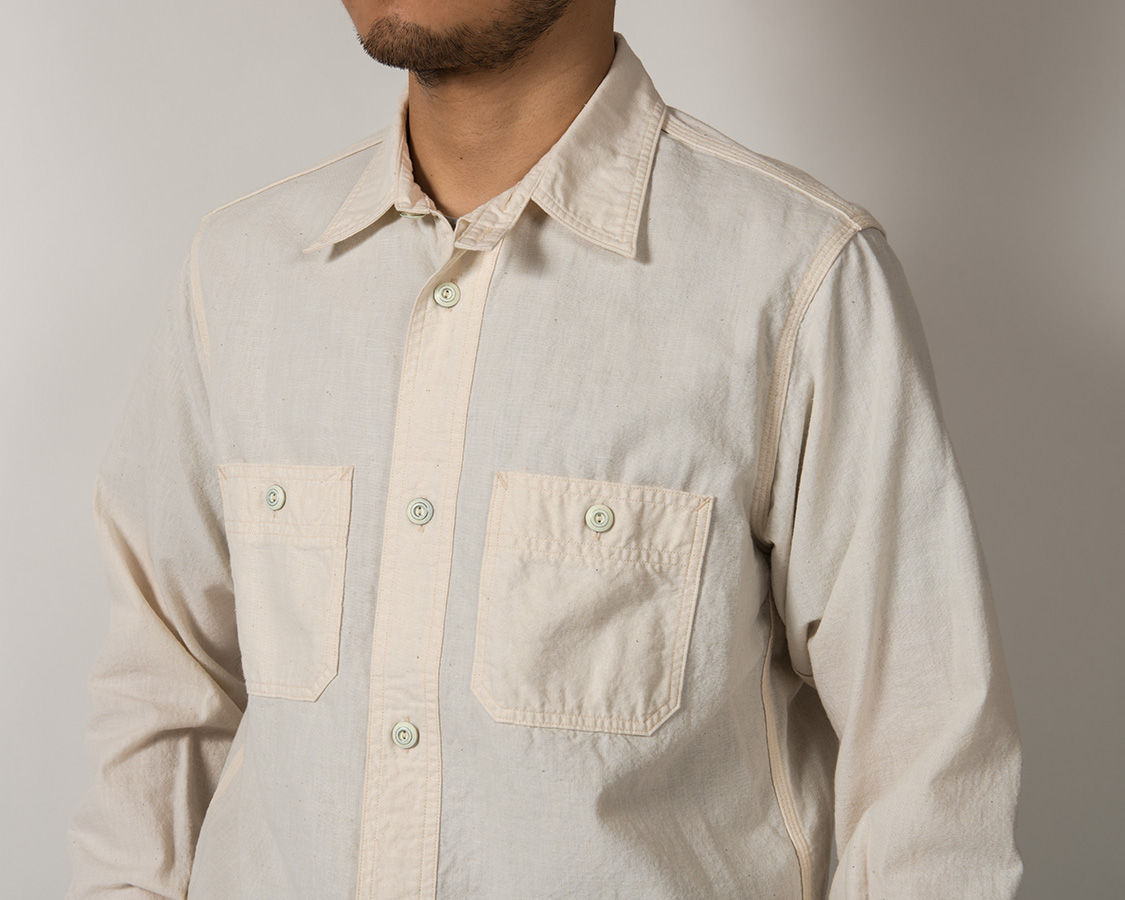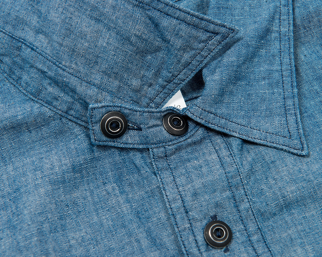 台襟にチンストラップ付。羽襟は長すぎず、かつ、襟先に向かってRもつけていないシンプルな物。やはりこのワークシャツのポイントはメタルボタン。塗装してからバレルに入れて加工、塗装をはがした雰囲気が本当に良く似合います。