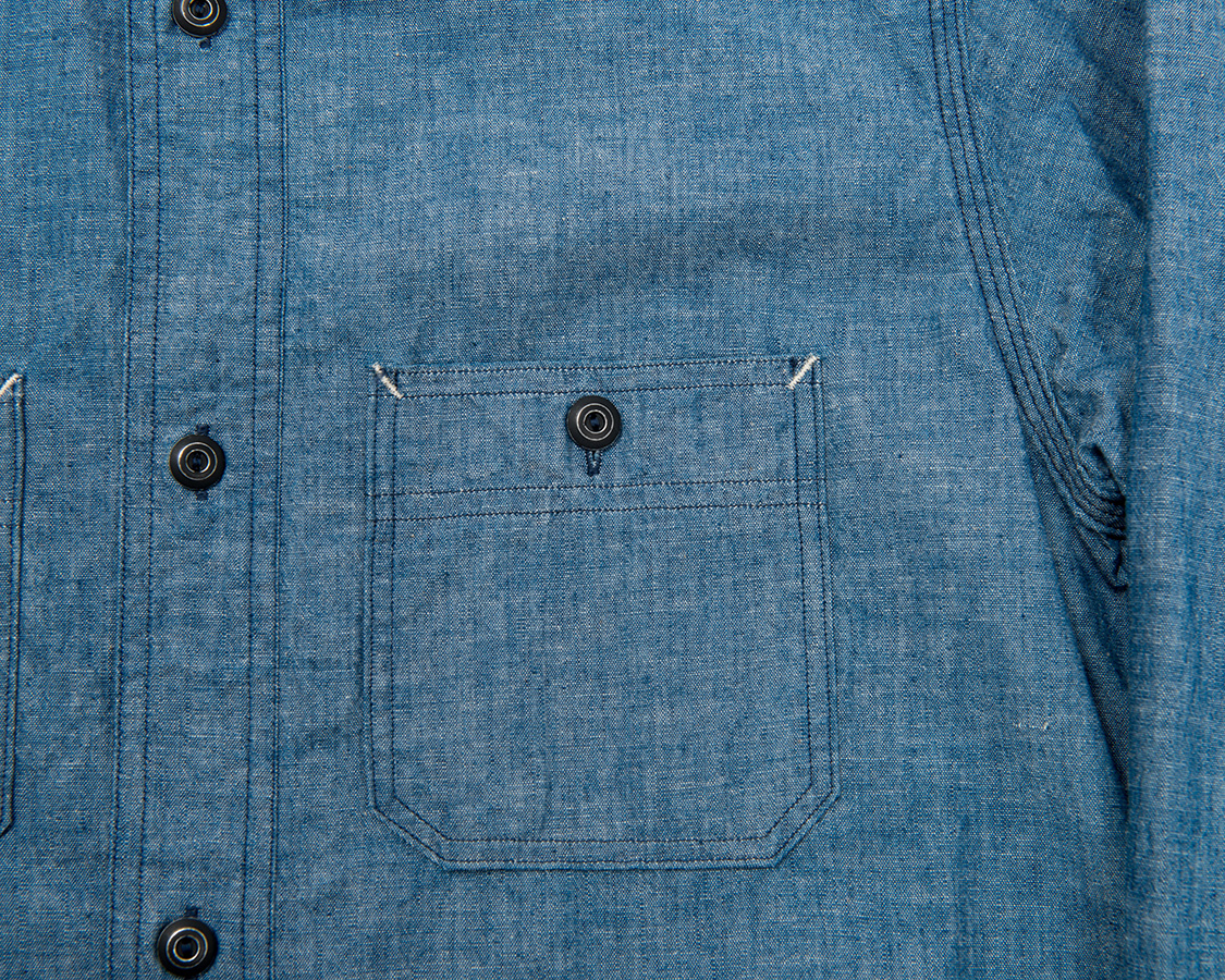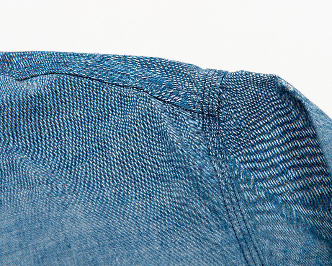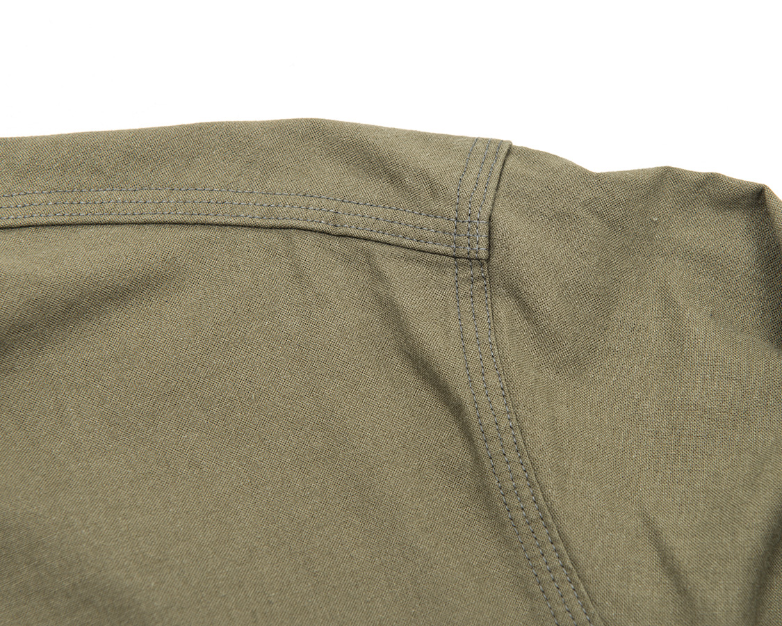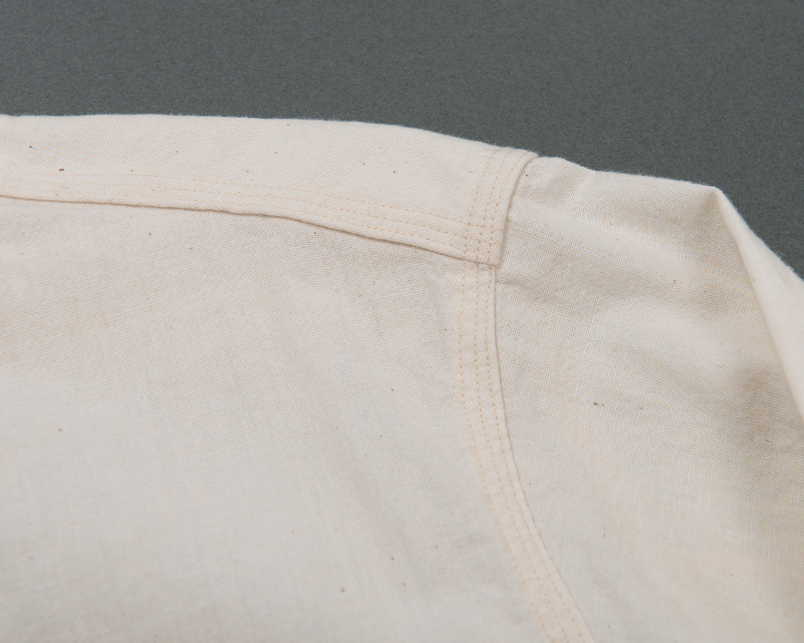 もっと、太い糸・太い針で縫えば針のぶれは少なくなるのですが、そうすると、もっと現代的なシャツに成ってしまう。細い糸で縫うために細い針に、その結果、針がぶれて若干ステッチがよれる。これは、昔のワークシャツを再現した結果です。