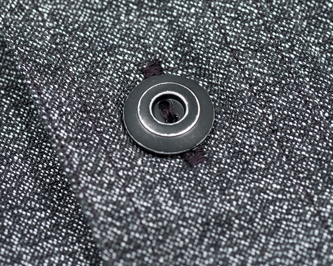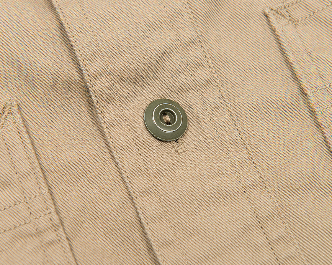 ボタンのクローズアップ。不均一な塗装のはがれ具合、Covert Clothのごま塩感が良くわかります。