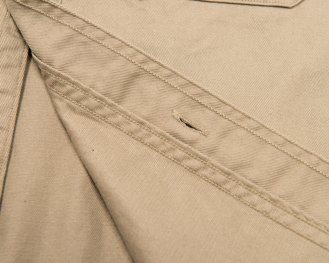 フロントはZ型に生地を折り、多本針ミシンで縫います。アメリカンワークシャツでおなじみの、あの多本針ミシン。通称「コイコイ」で、ルーパーが前後に動くのでこの名前が。余談ですが、良く似たミシンでジーンズやワークパンツの帯もつけますが、こちらはルーパーが横に動きます。