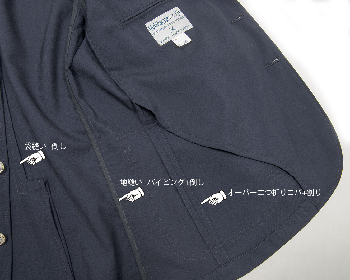 本体は前身・脇・後身の三面。見返しが大きく、肩まであります。背裏は無く、袖ぐりはパイピング。