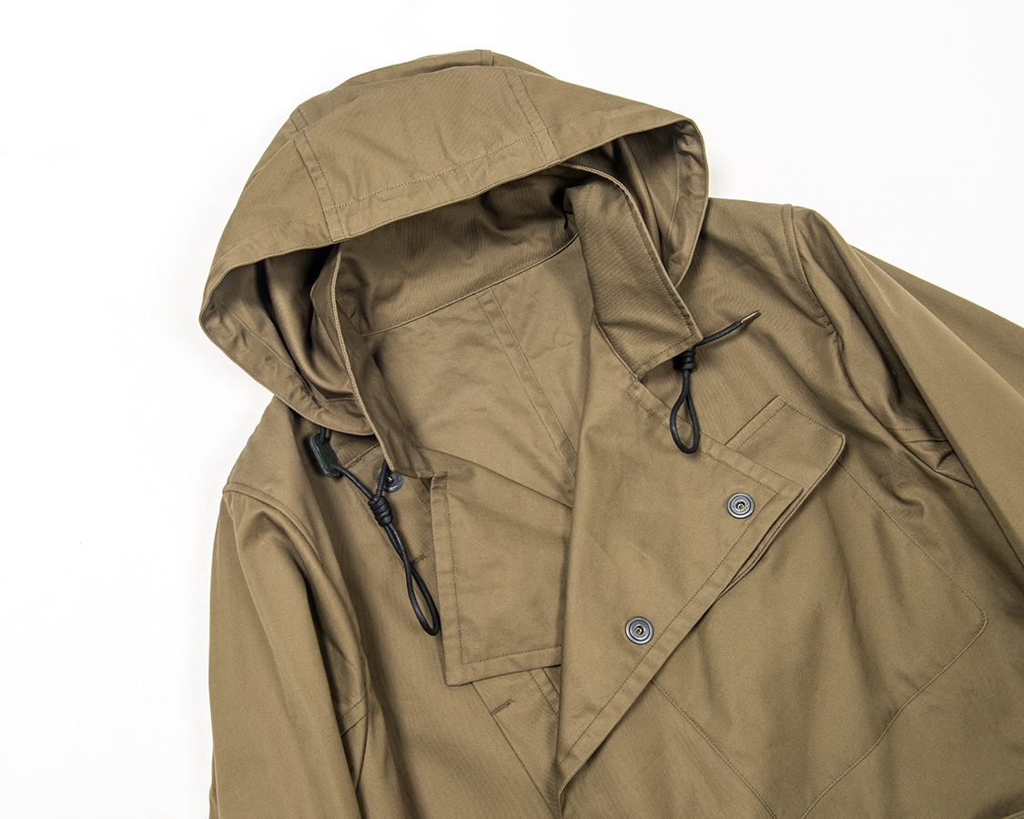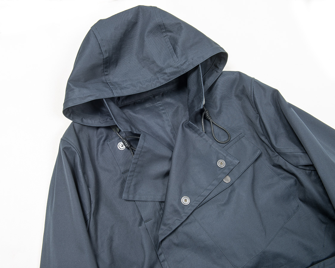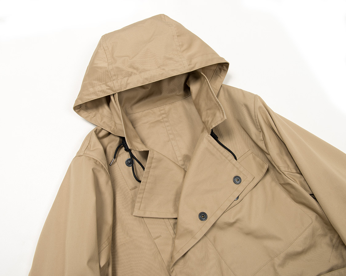 結果は大成功。スタンドカラーを立てても良いですし、少し折ってもおさまりが良い。フードも首回りのボリューム感を出していてコートらしさがあり、かつ、機能性もある。