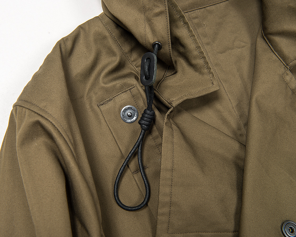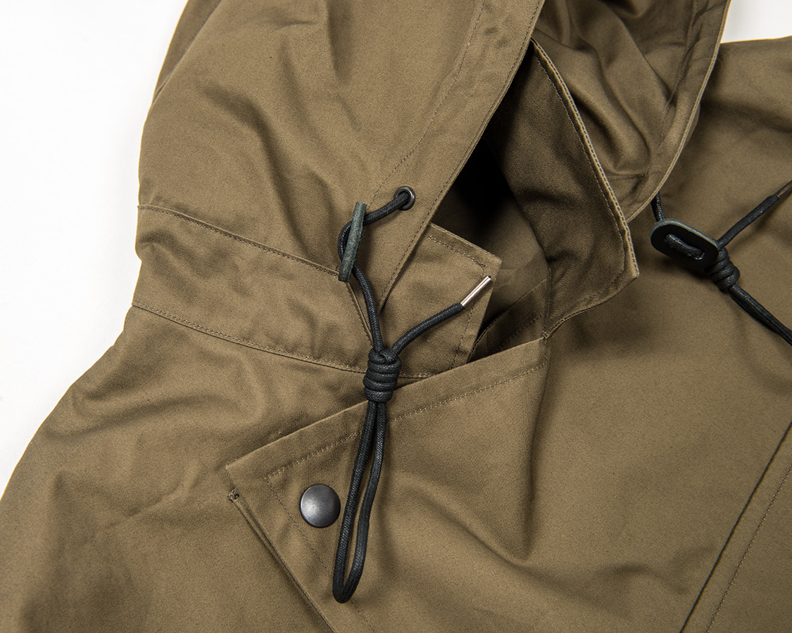 フード口を絞るドローコード。革のアジャスターもつけて、よりクラシックな雰囲気に。