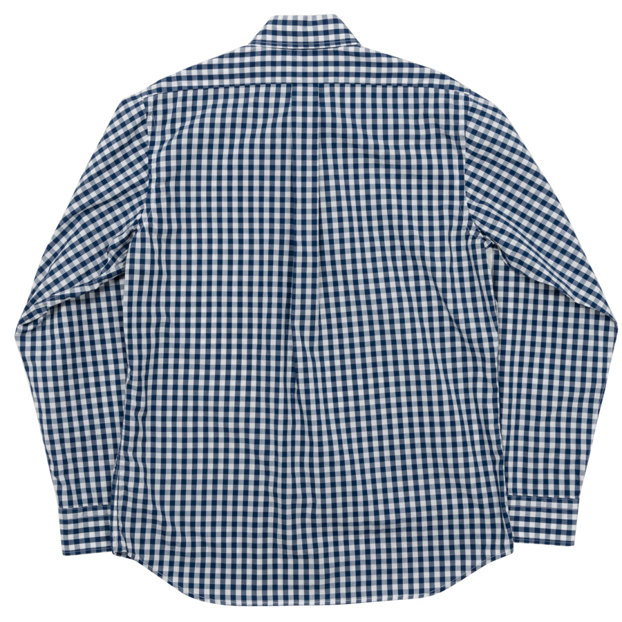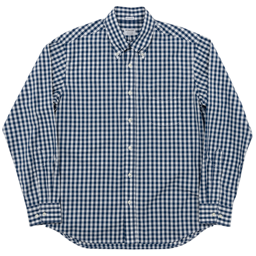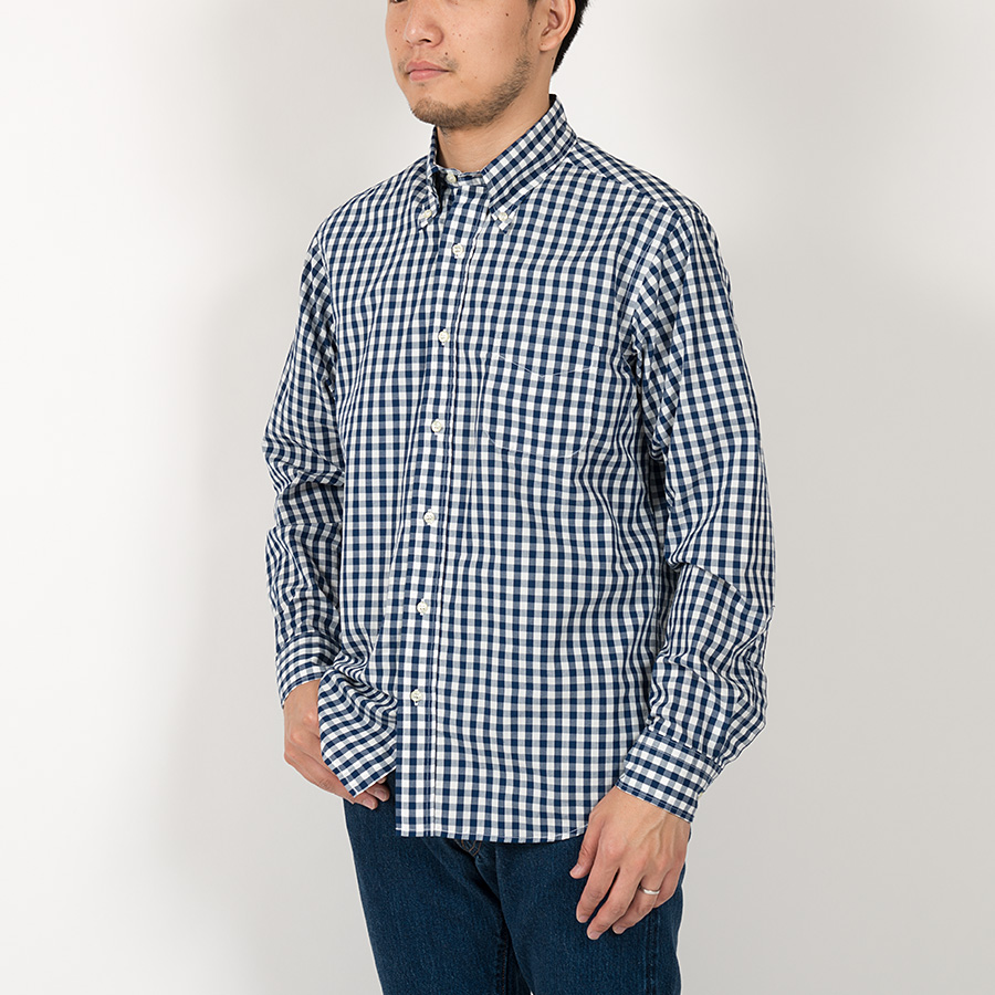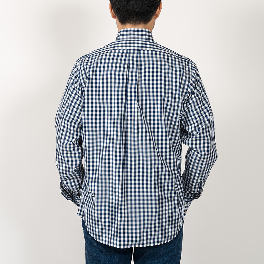 ギンガムはタテヨコ50番糸、3.5 オンスのブロード。オックスより糸が細く、厚み薄い。手触りもつるっとして、しなやか。袖をまくれば真夏でも着られます。