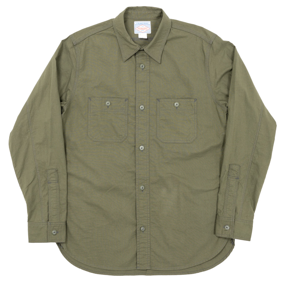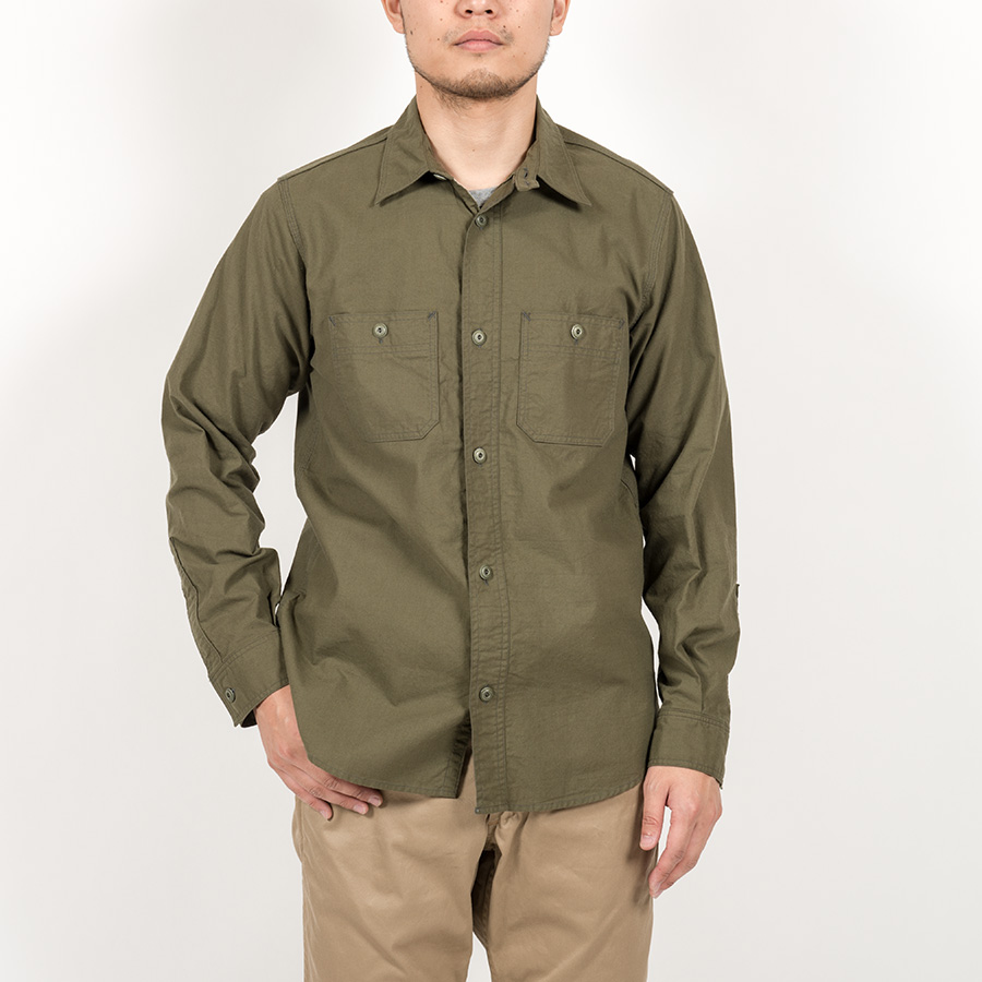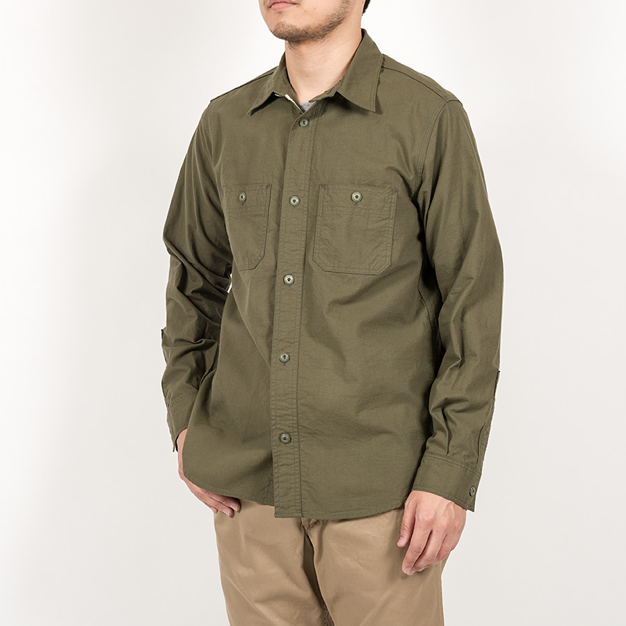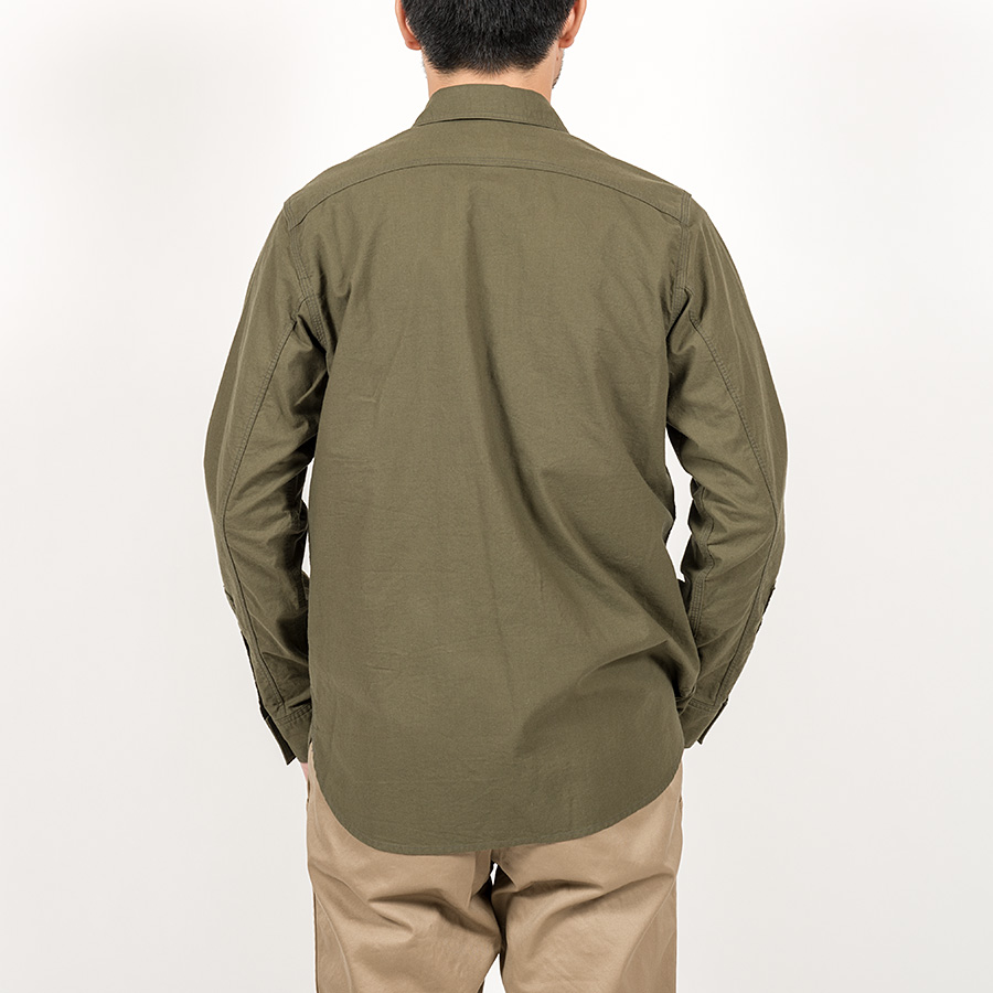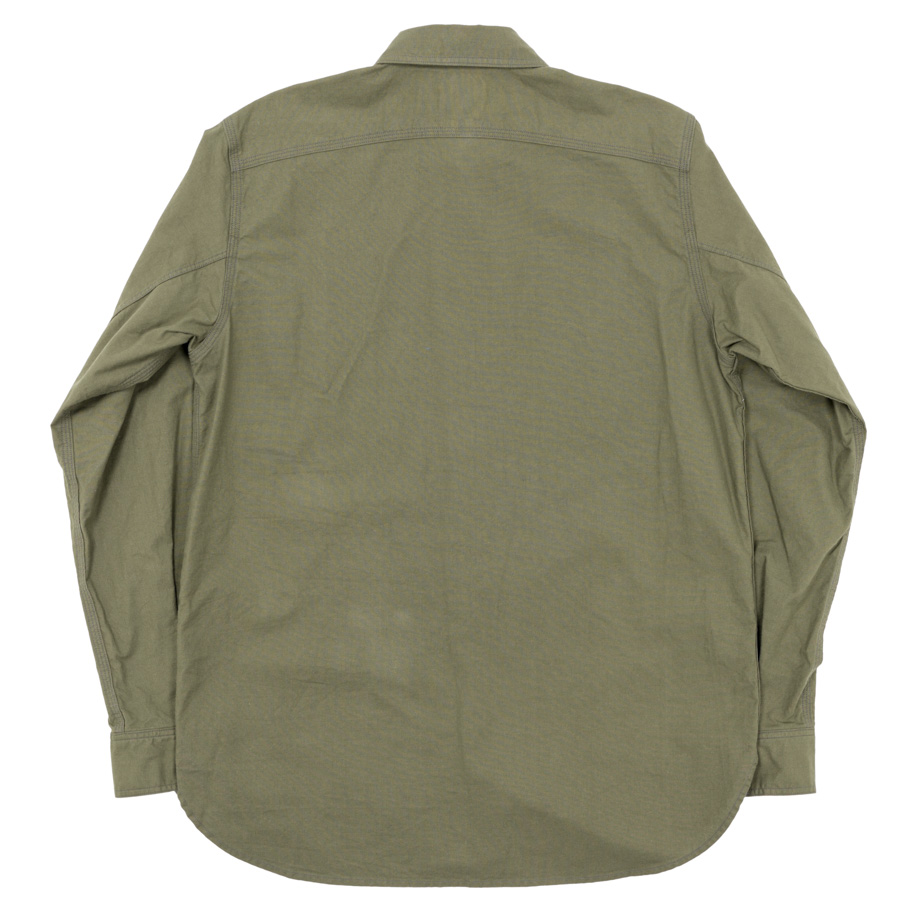 便宜上「オリーブシャンブレー」としてますが、厳密には反染なので「シーチング」に近いでしょうか?糸の太さ自体はシャンブレーと同じ、打ち込みが少ない分厚みはわずかに薄い。反染した生地で、ビンテージでもあるよな・・・というラフな平織生地。