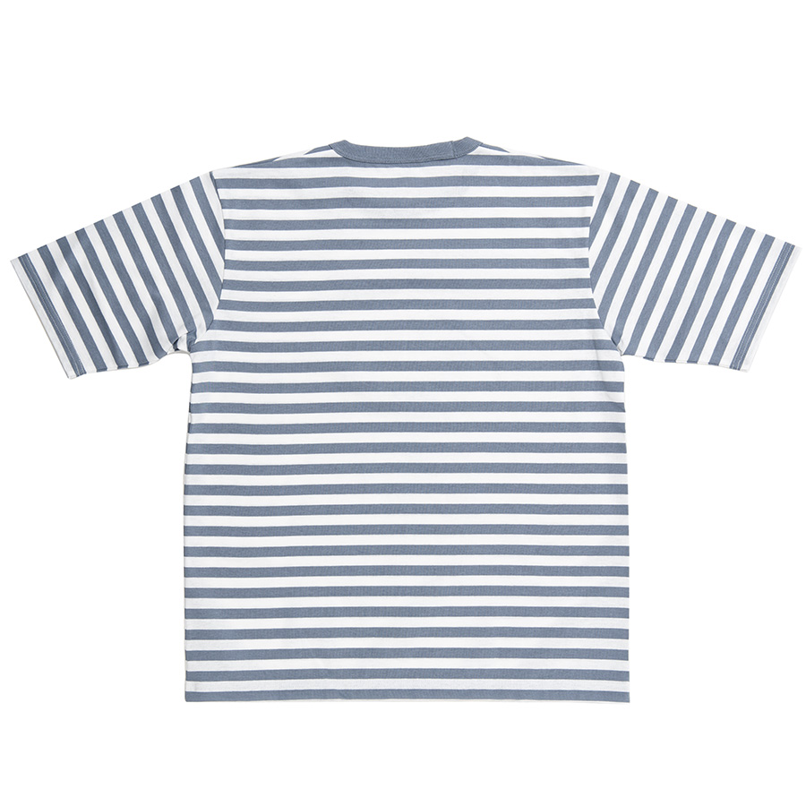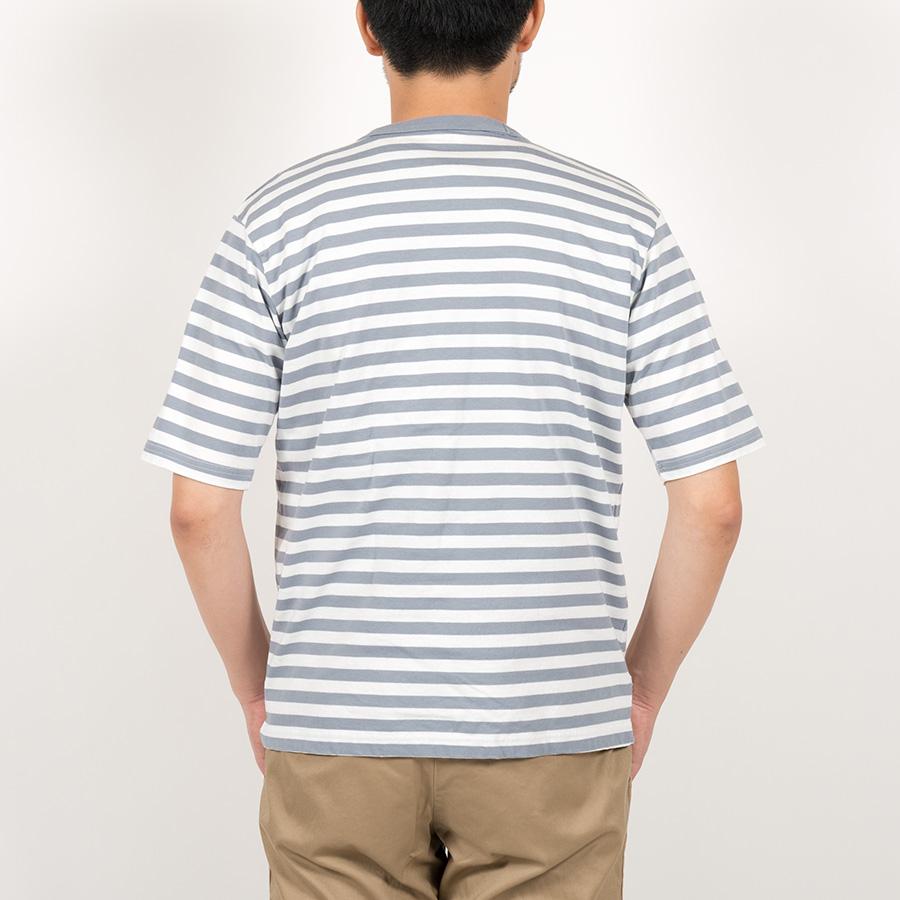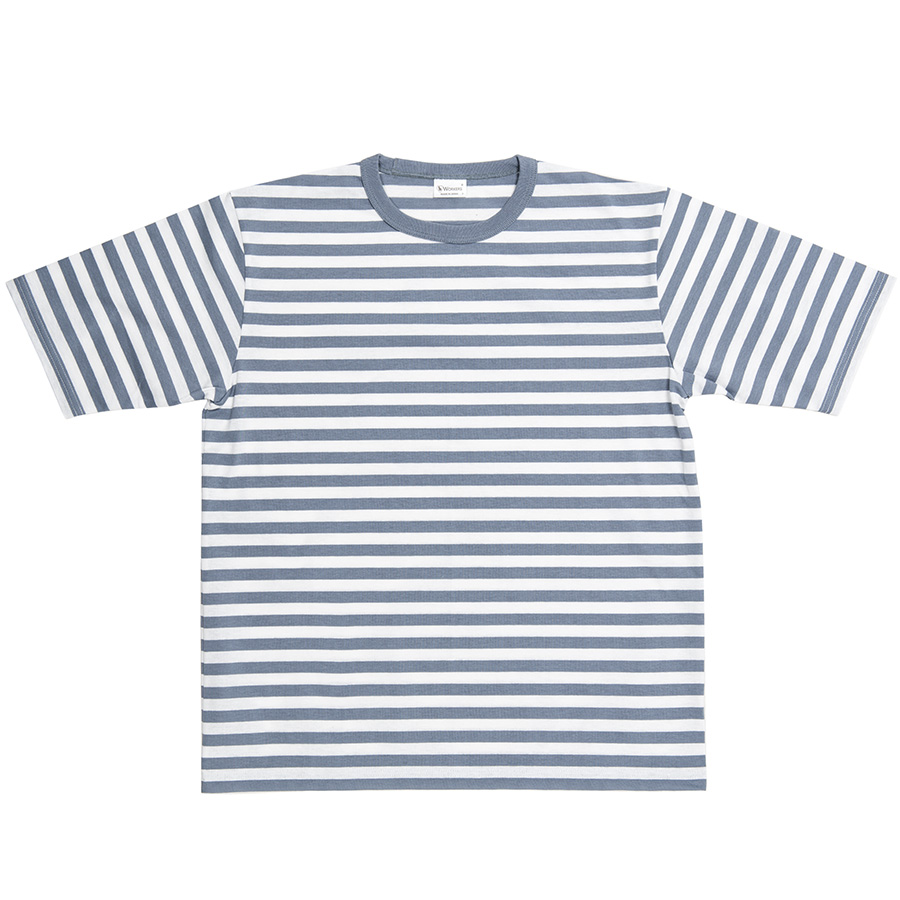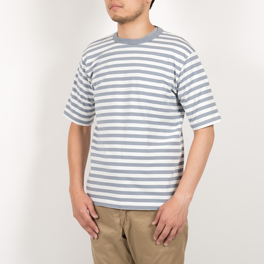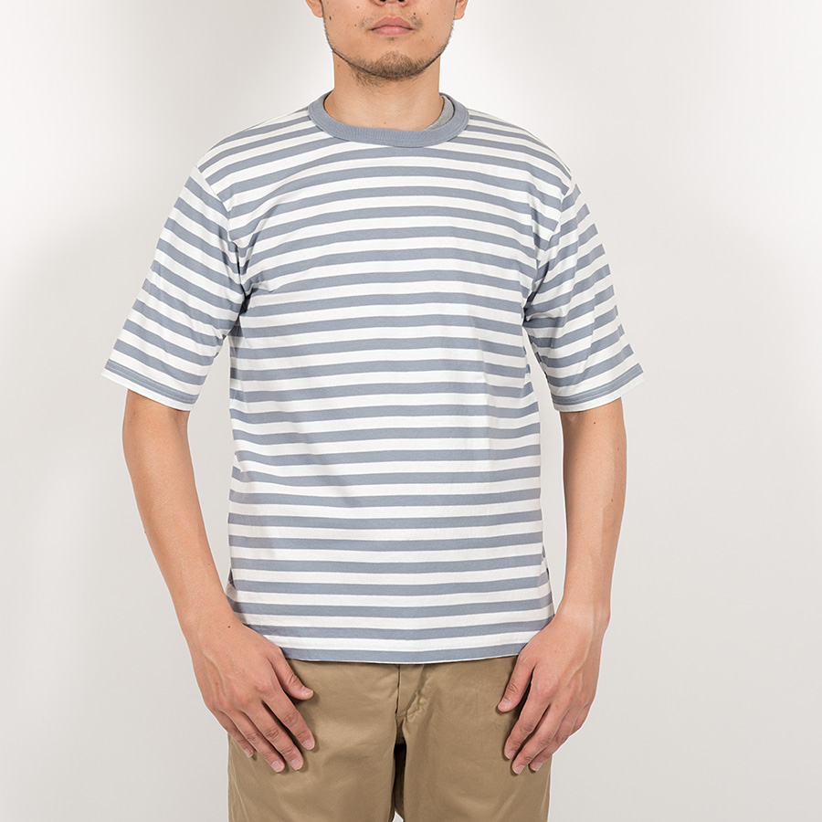 細ピッチボーダー、数多くのメーカーが作る激戦区ですのであえてWOREKRSで作るか悩みました。ただ、細かい事を言うとこの14番空紡糸・超度詰めのヘビー天竺で作っているメーカーは中々無いのです。コストの問題なのか、もっとがさっとした生地(良く、生地業界ではバルキーとか言う風合い)が主流。その手の生地であれば既製品もあるのですが、そこはあえて、この糸を使いたかったので毎度の別注で作りました。