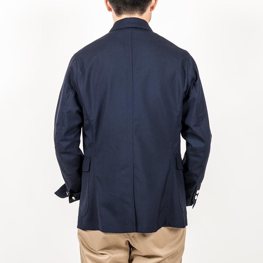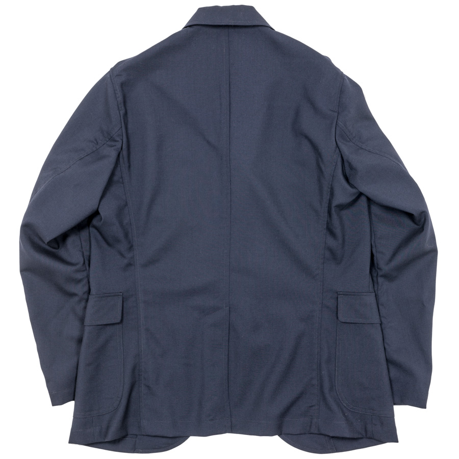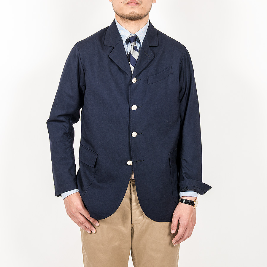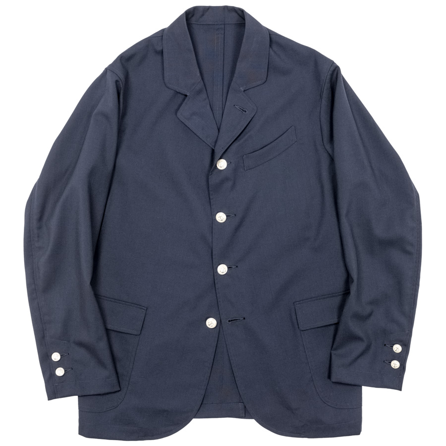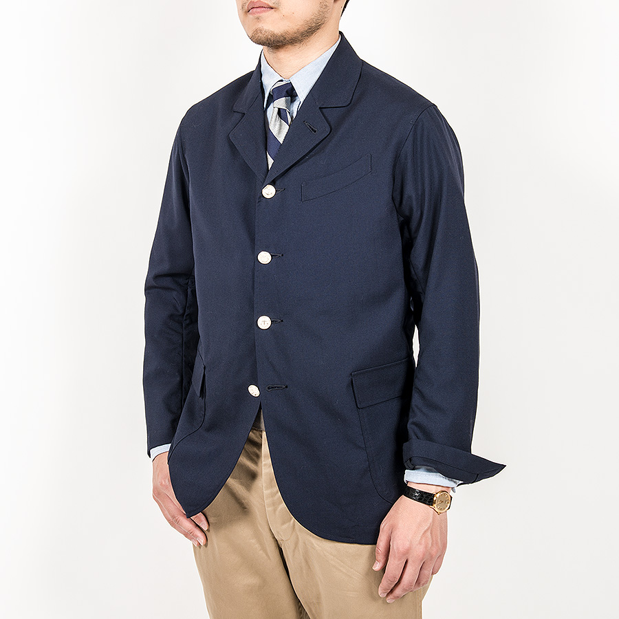 Jacket をデザインソースに胸ポケットはゆるくカーブした形状、腰ポケットはパッチ&フラップ。袖裏無しで、袖口に開き。