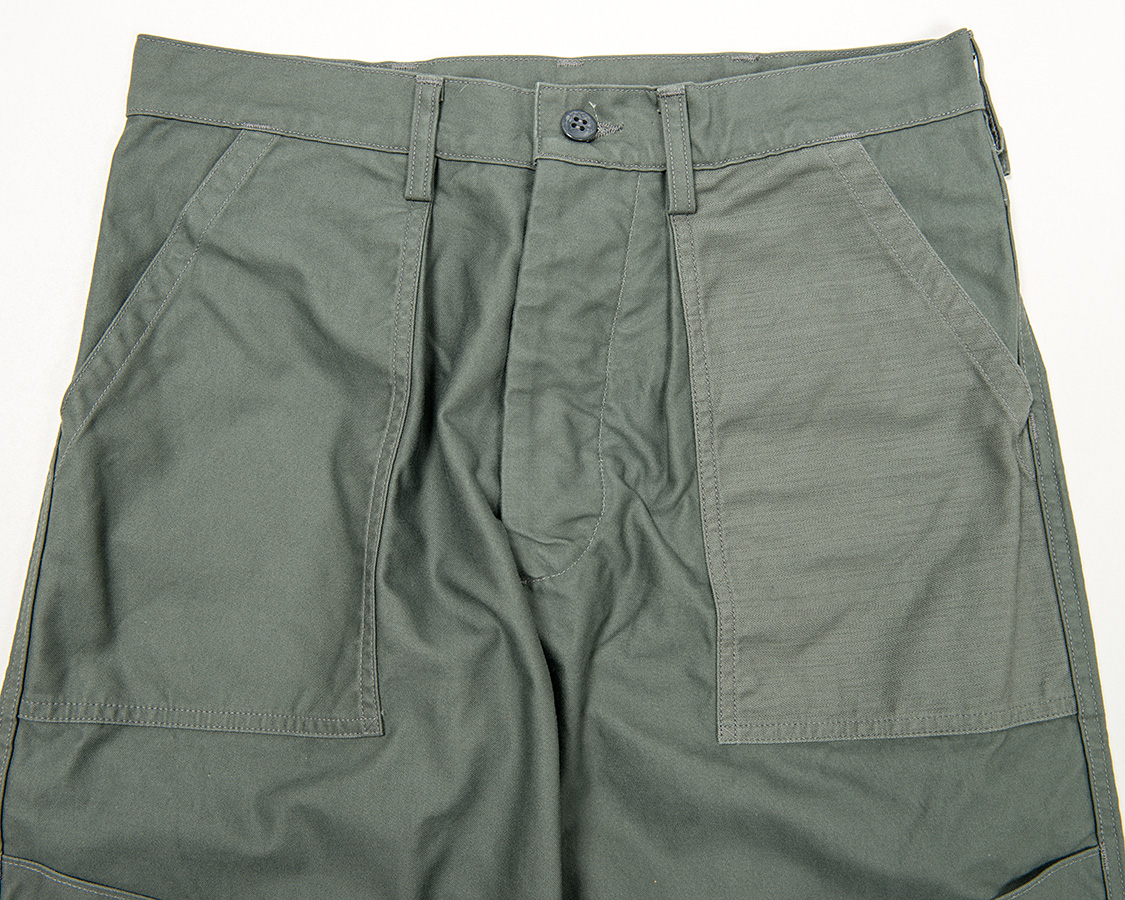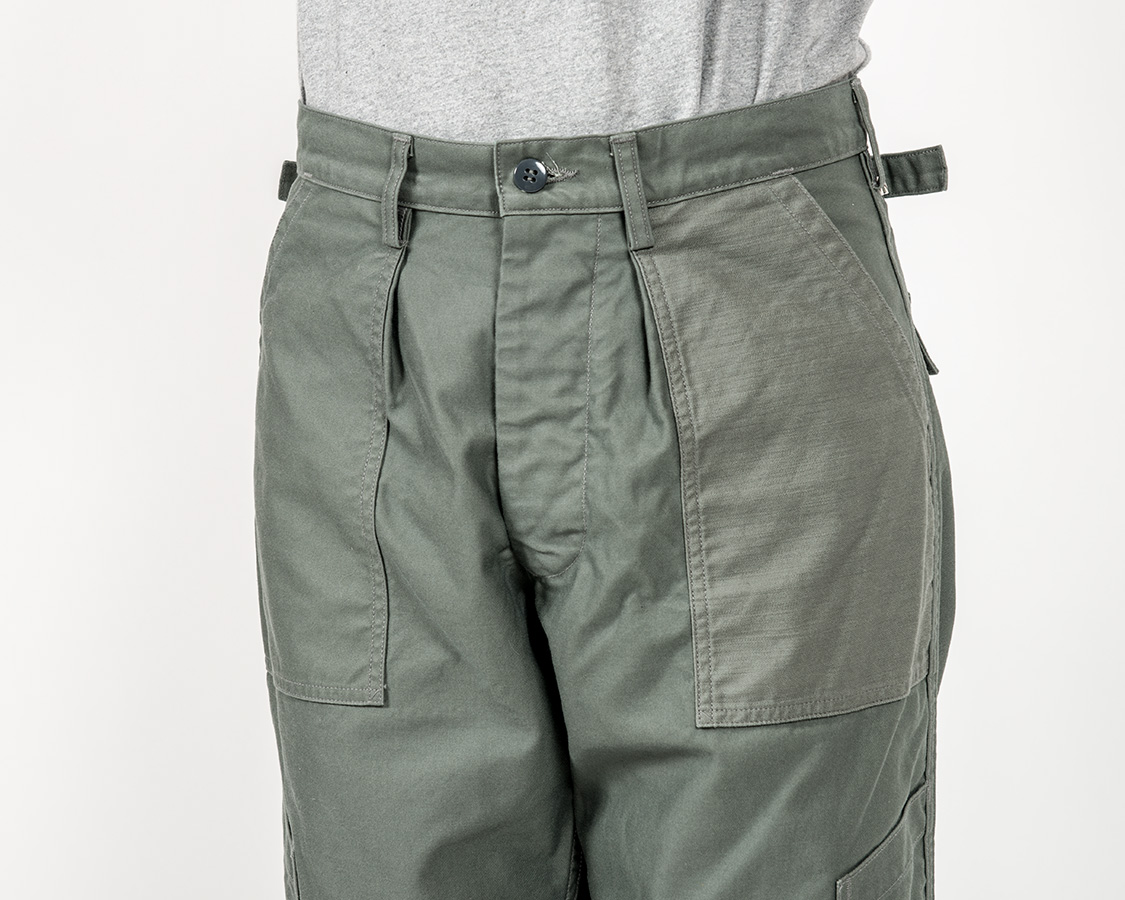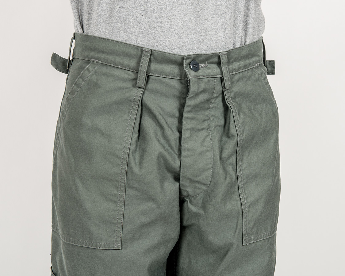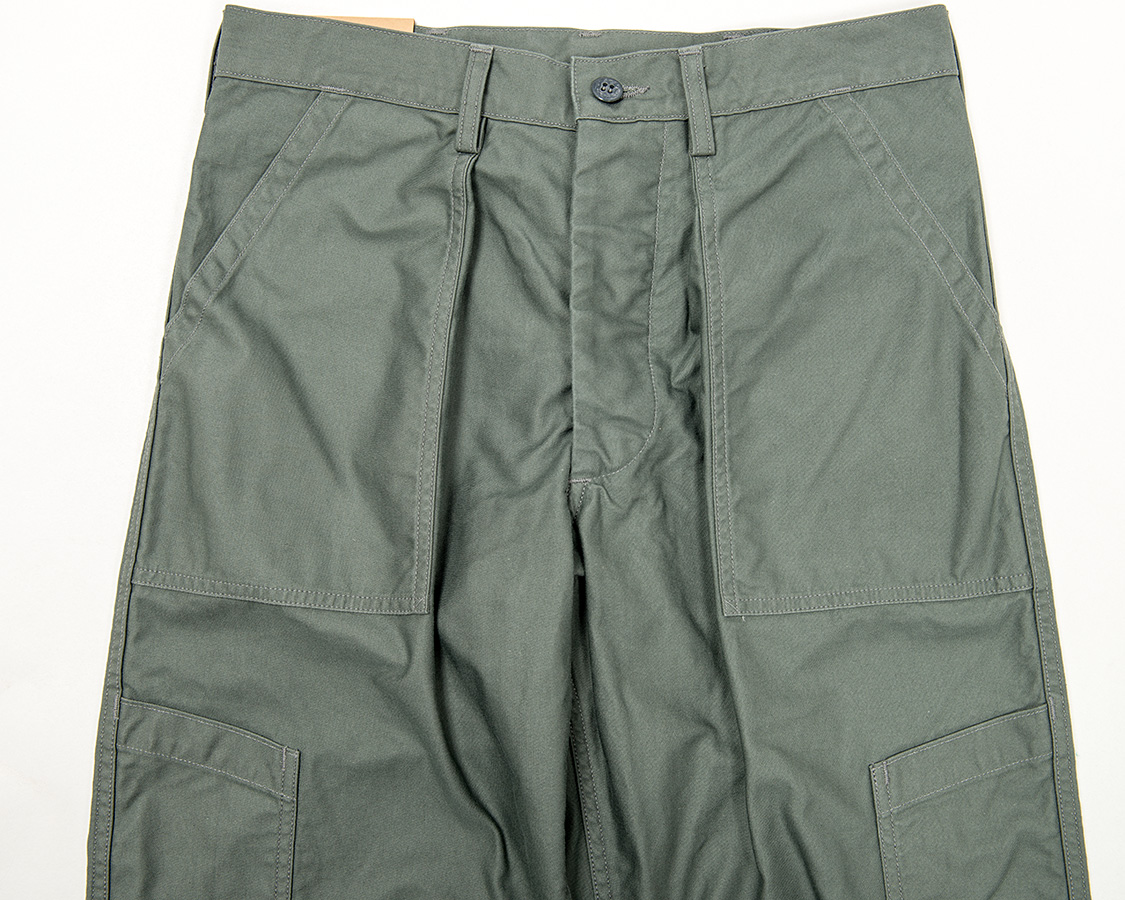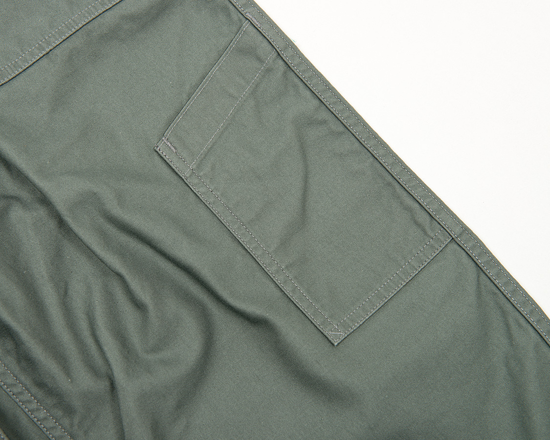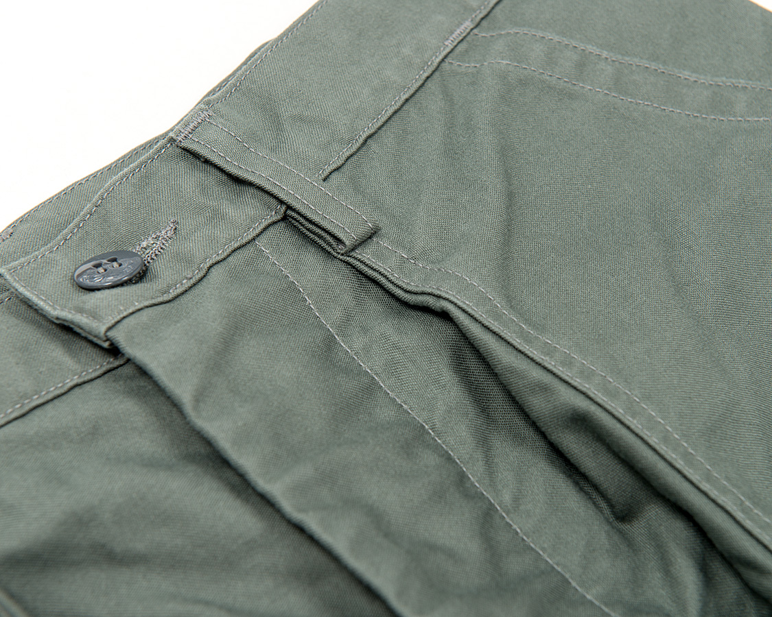あらかじめポケットをつけ、そこをタックを取り、さらにループをはさむ。これが厚みもりもりで地味に帯付けがしづらい!おそらく、こういう変に手間かつ作りづらい部分があるので、後に、エアフォースのベーカーパンツ(しつこいですが俗称)も、色味がSAGE GREENなだけで形自体は、他軍と同じに集約されていったのだと思います。