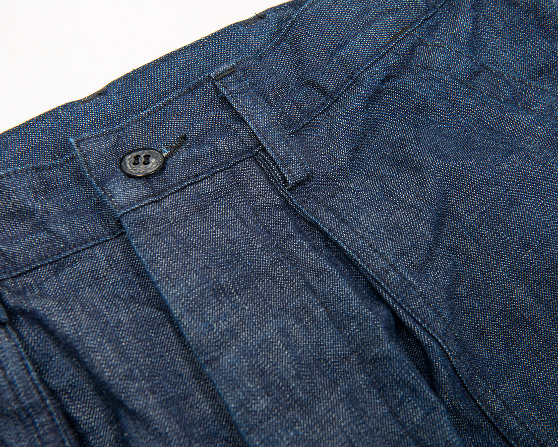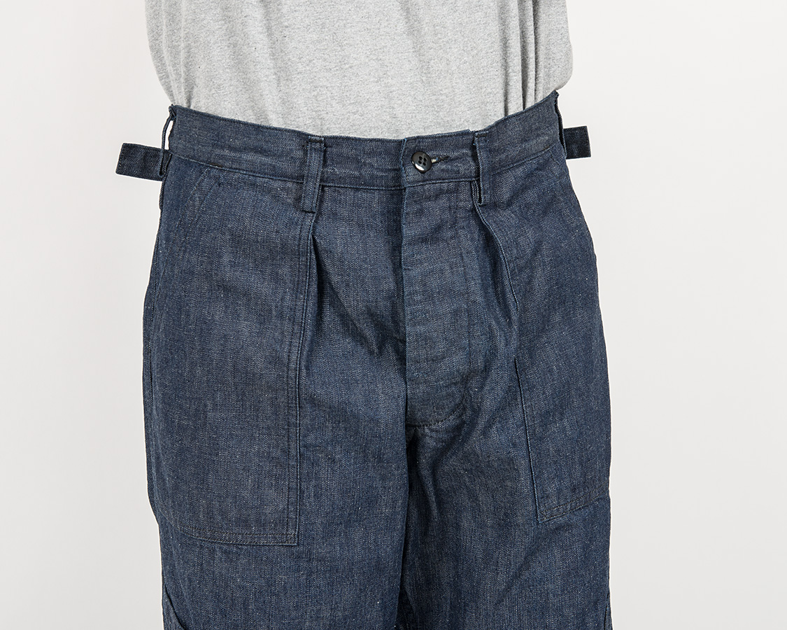 ウェストに入ったタック、これがヒップ周りのゆとりを出す。さらに、そのタックにあらかじめ乗せているポケット。帯も別帯。さらに、フロントポケット下に左右、いわゆりワークパンツのツールポケットのようなものがつきます。