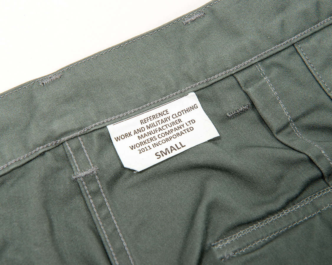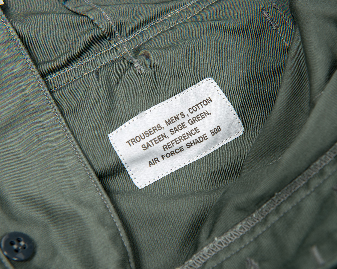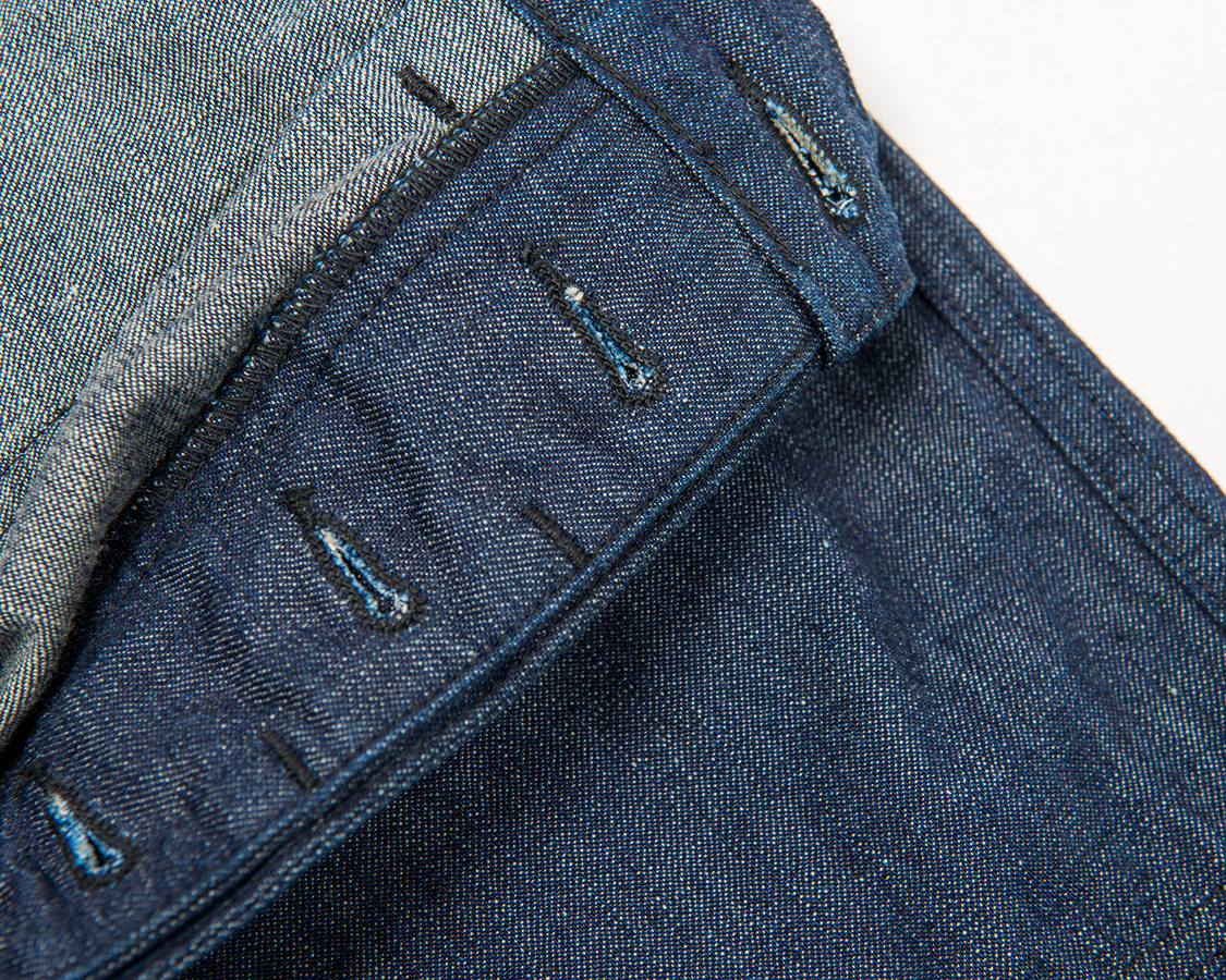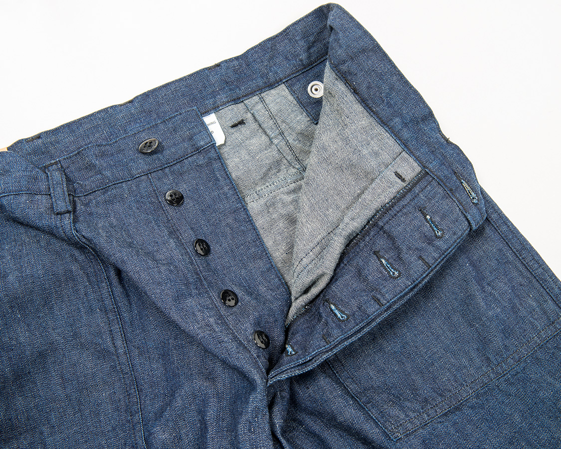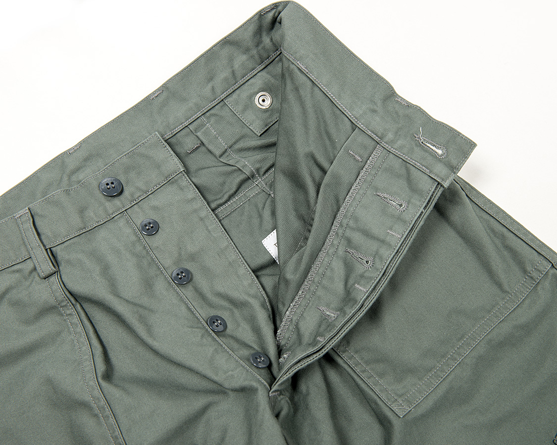 フロントはボタンフライ。ここもミリタリーウェアではおなじみ、ヒヨク留めカンヌキが入ります。