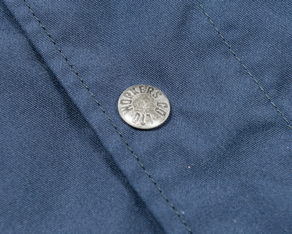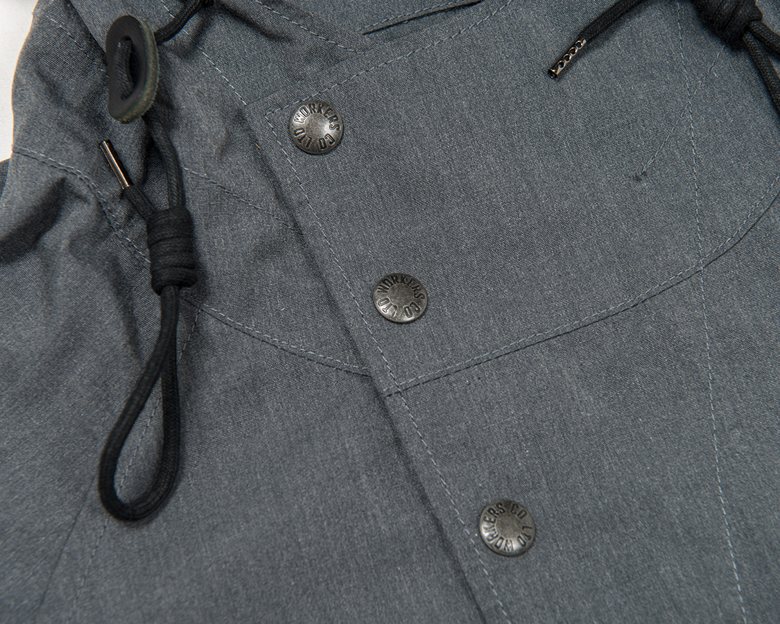 このおかげで、フロントの重なり部分が広がり、上までスナップを閉めたとき独特のボリューム感が出ています。機能面でも、前の打ち合いが深く重なるので、風の進入を防ぐ意味合い、スナップを締めるとき、体の中心から少しずれるので締めやすいといった点があります。
