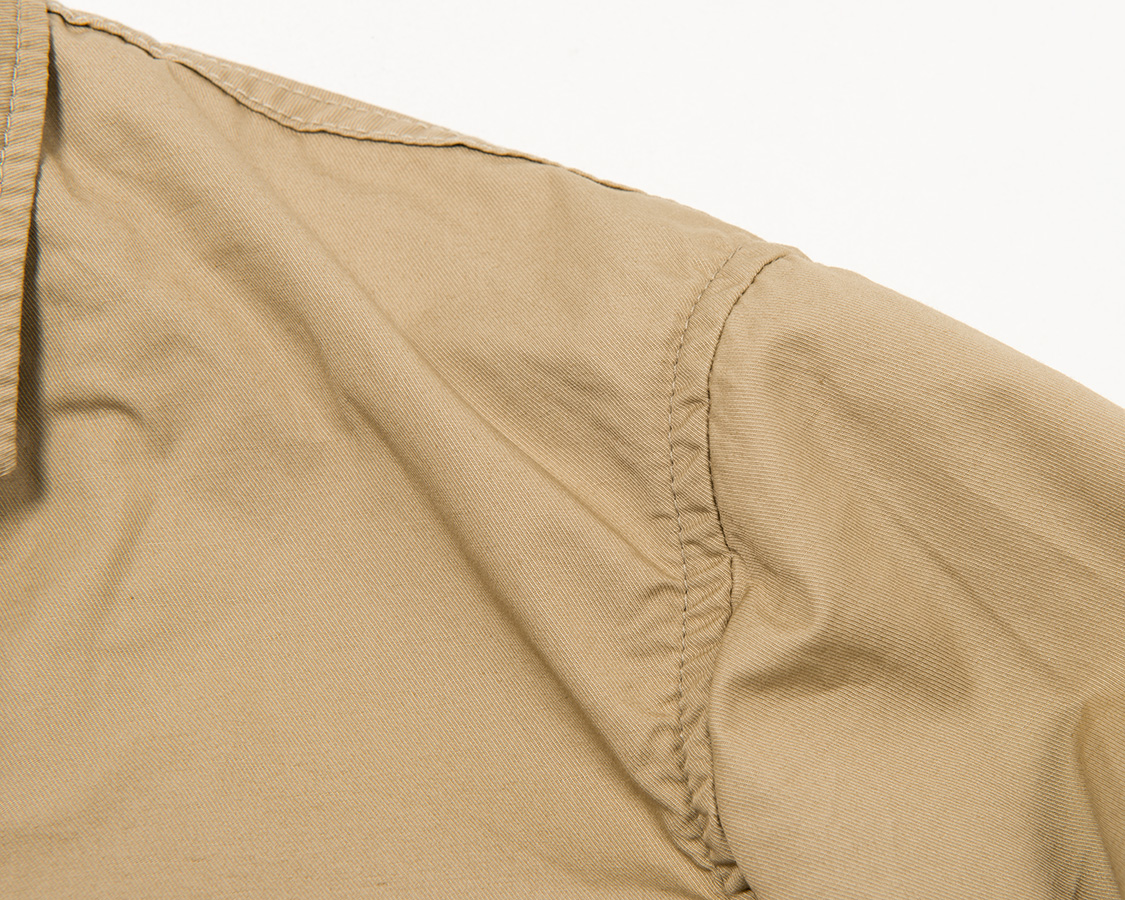 袖ぐりはパイピング+倒し。ベージュ・オリーブの綿麻は特にパッカリングが出やすい生地なので、あらゆる縫い目に立体感あるデコボコが出来ています。