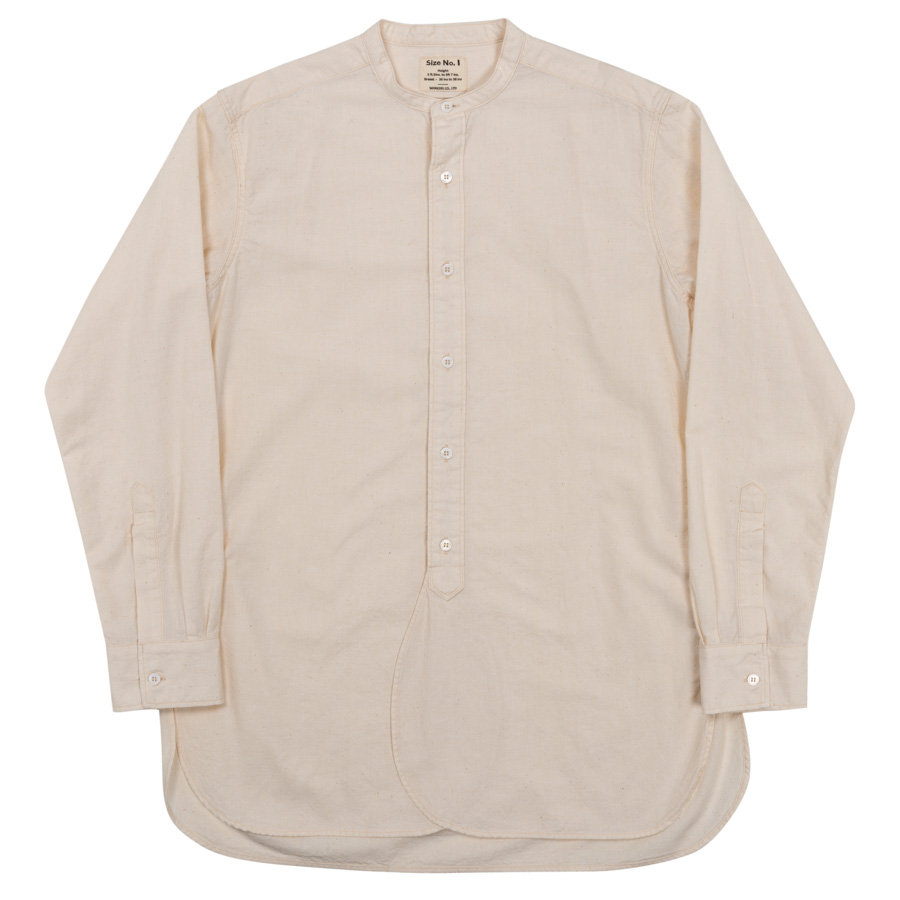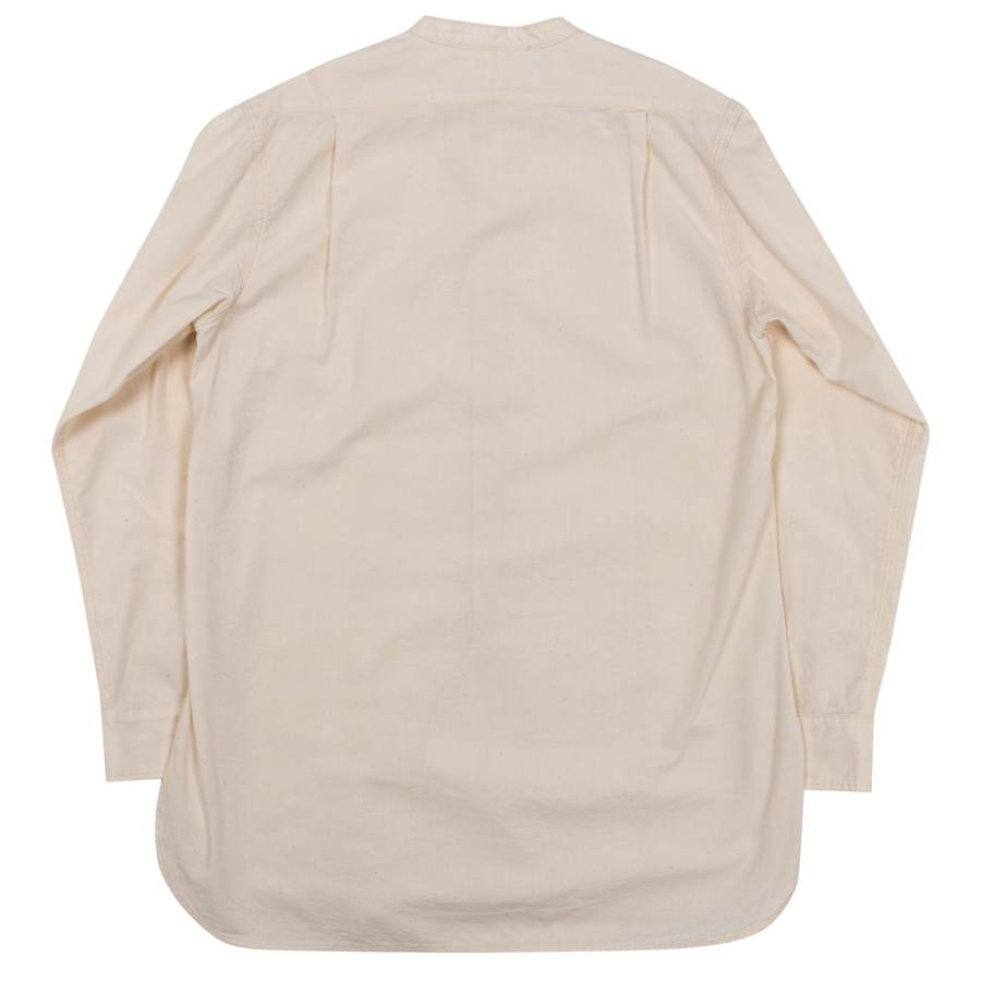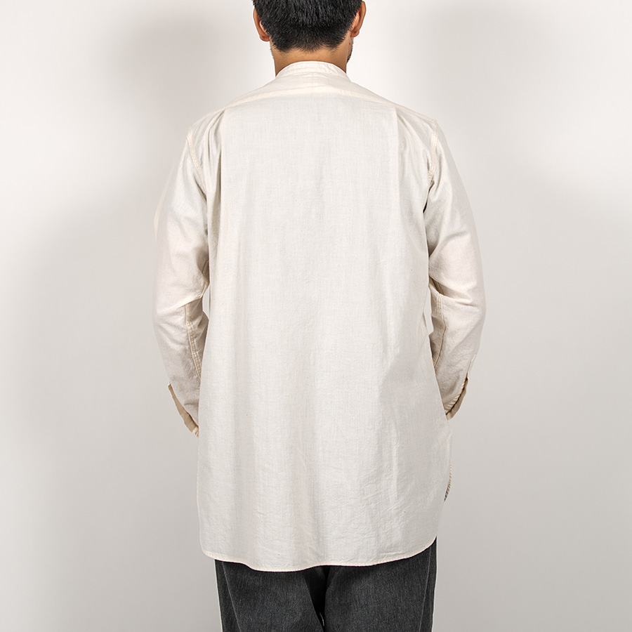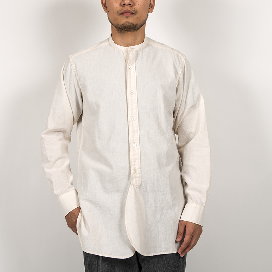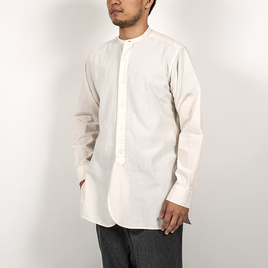 ビンテージのおそらく、イギリスミリタリー物と思われるバンドカラーシャツから着想を得て作りました。 再現したポイントはシルエット。着丈をビンテージそのままの長さに。その分、フロントから脇に向かう切れ上がりの線が深くなっています。 本来、パンツ(ズボン)の中にシャツの裾を入れる。長い方がたくしあがらない。だから、着丈が長いのですが、現代は丈の長いシャツをあえて裾出しで着るのがファッション的かなと思います。