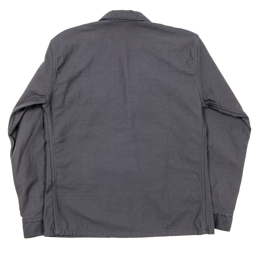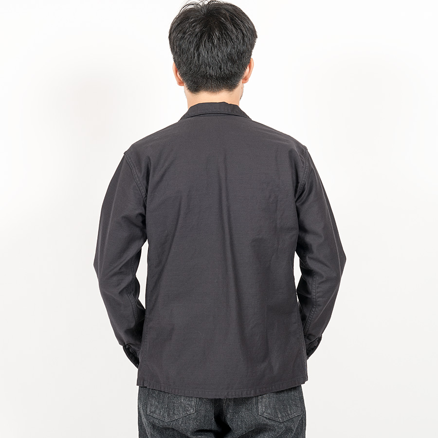 素材はシャツというよりは、カバーオールに近い8.5オンスのバックサテン。WORKERSでは定番のベーカーパンツに使い続けている、あの太番手のバックサテン(18FWのAir Force Bakerは違います)。硫化染めで、洗うごとに色落ちして徐々に柔らかくなる素材。今回はODに加え、より都会的なブラックもラインナップしました。下もブラックデニムで、中はグレー系のカットソー。モノトーンまでいかない、ブラック・グレー系の無鮮色でトーン違いが私は最近好きみたいです。
