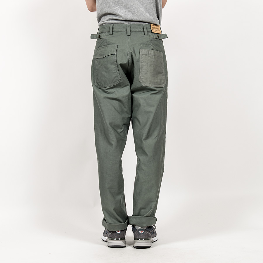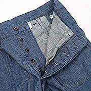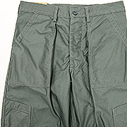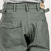 ちょっと違ったベーカーパンツを作ってみたい・・・と思い、俗に「エアフォースベーカー」と呼ばれる、空軍のラベル がついた古着を元に作りました。デザインが凝っていて、フロントポケットの下にタック。さらに、フロント膝上には左 右ポケット。背面、左身頃のポケットがフラップ+ ヒヨク止め。後ろ身頃はダーツも入り、そこにウェスト調節用のタブ がつき、スナップ打ち部分には補強布。さすがミリタリーウェアと言えるやりすぎ感です。作るのは、6 ポケット(軍パン) に準ずるほど難しい!だからか、エアフォースラベルの付くいわゆるベーカーパンツ(本当はTrousers, Cotton Sateen だと思いますが)もこのデザインの後によりシンプルな物に変わって行ってしまいました。