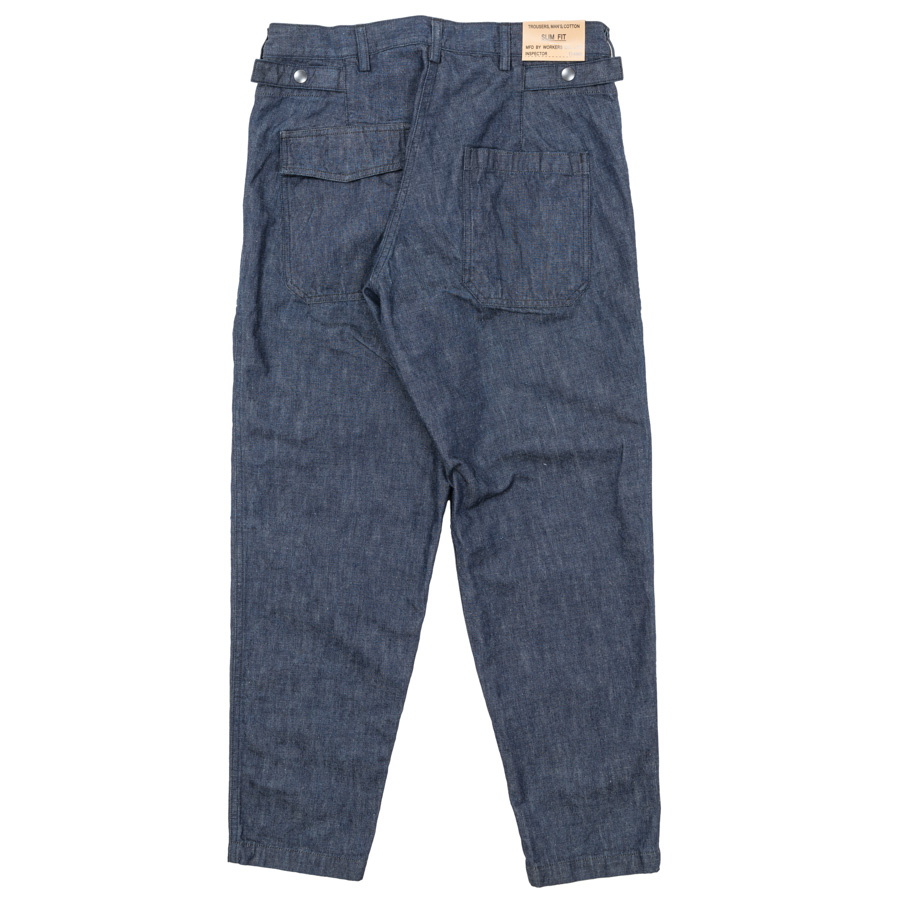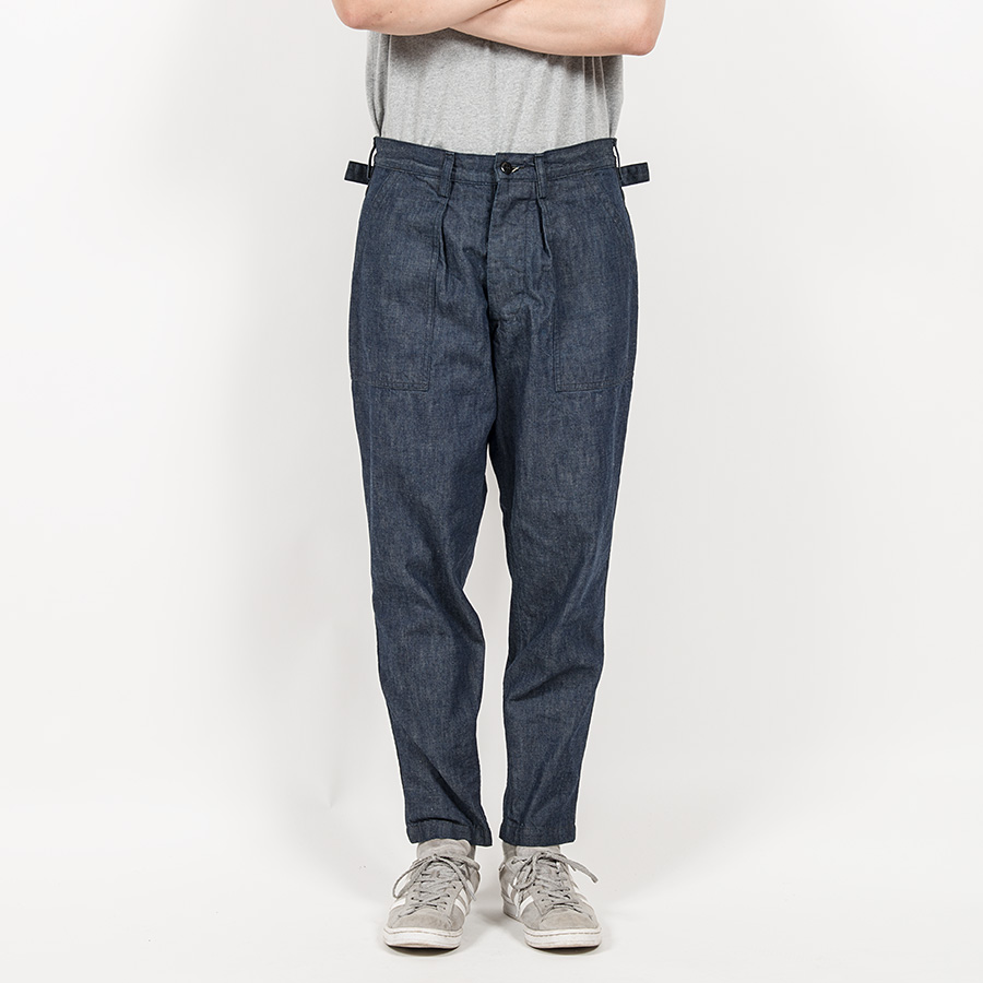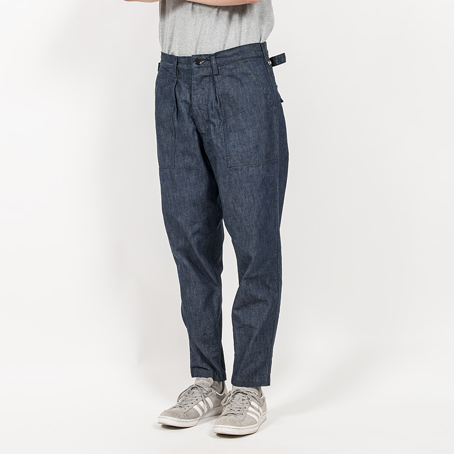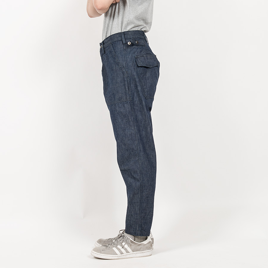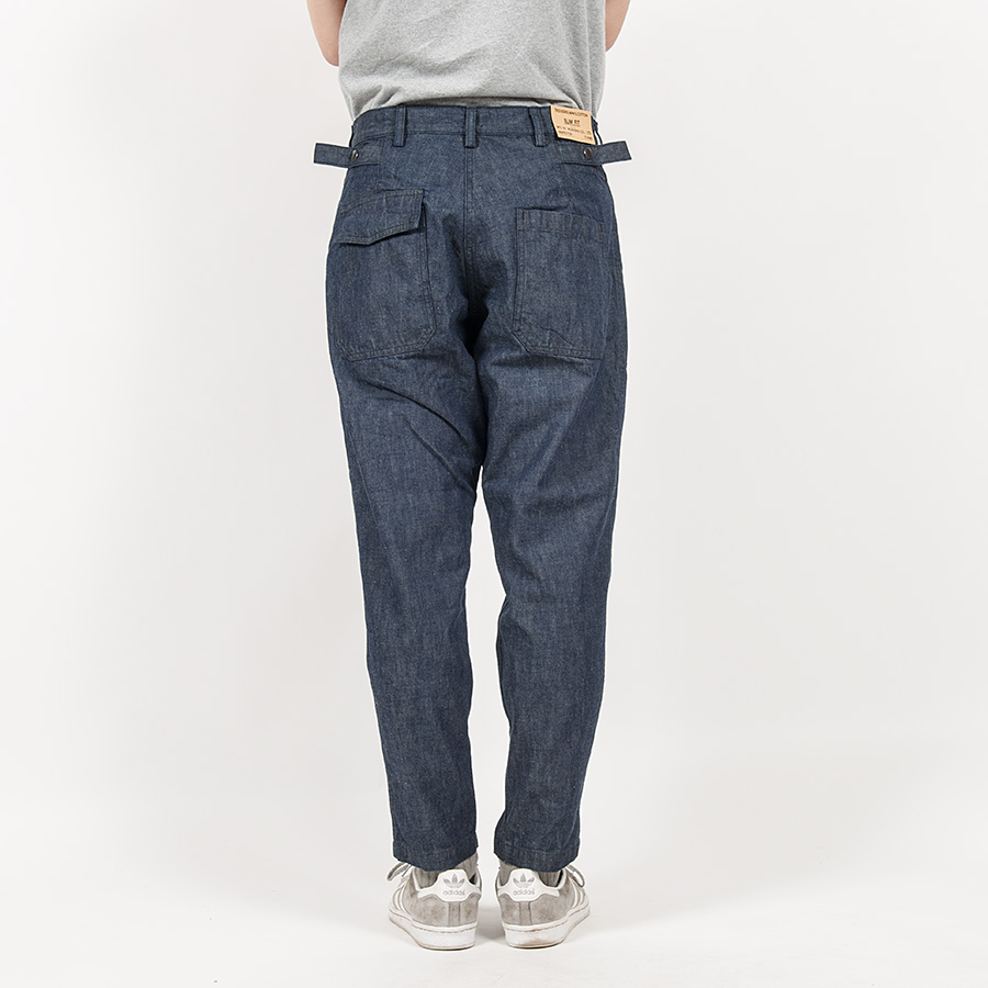素材は最近好きな、ミリタリーのデザインにあえてデニム。それも、ヨコ糸に薄く色がついて沈んだトーン。これに黒系のステッチ。デニムが色落ちしていくと、ステッチの黒が後から落ちていくので表情が出てきます。