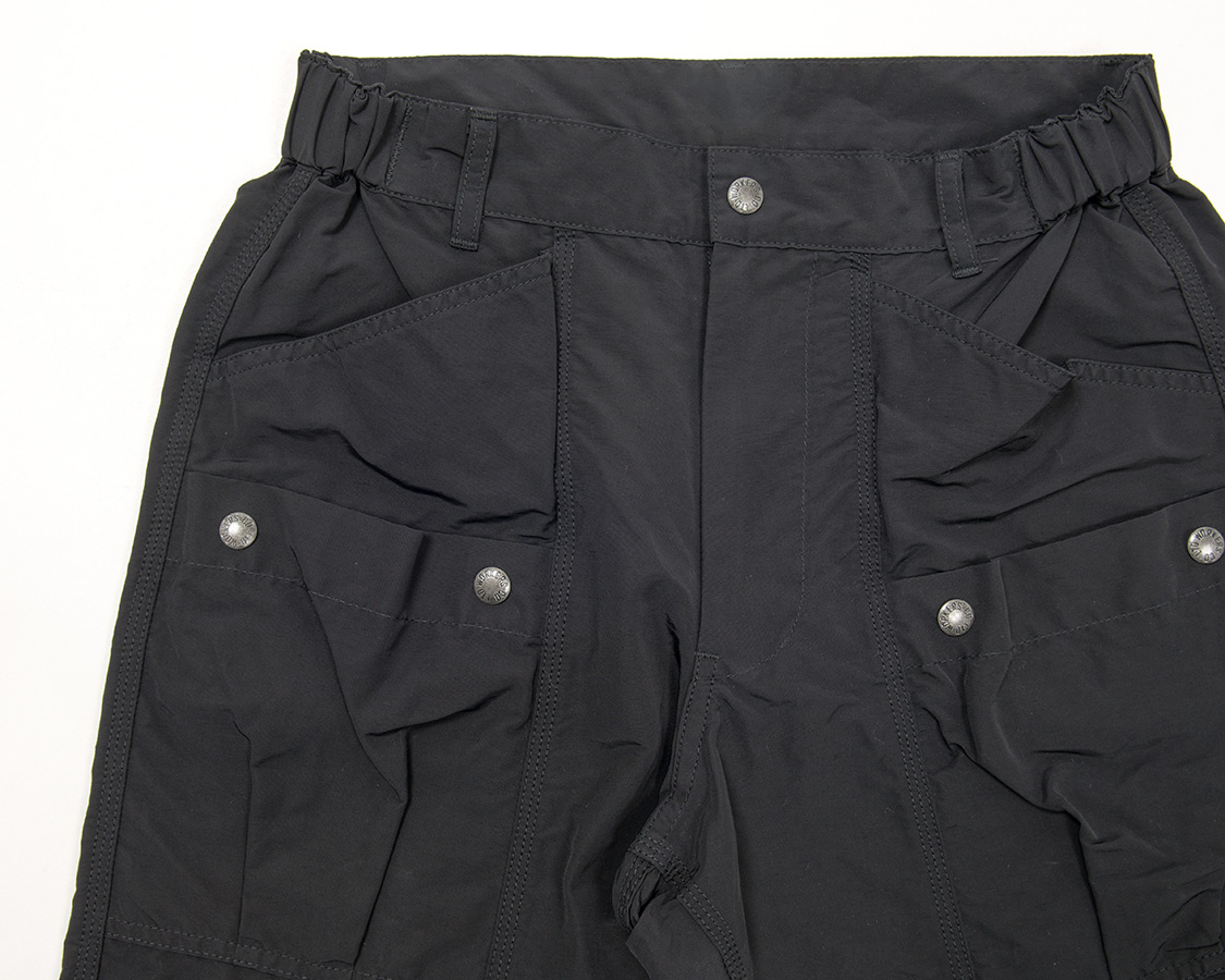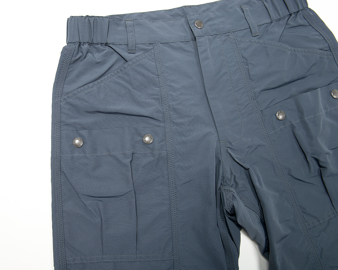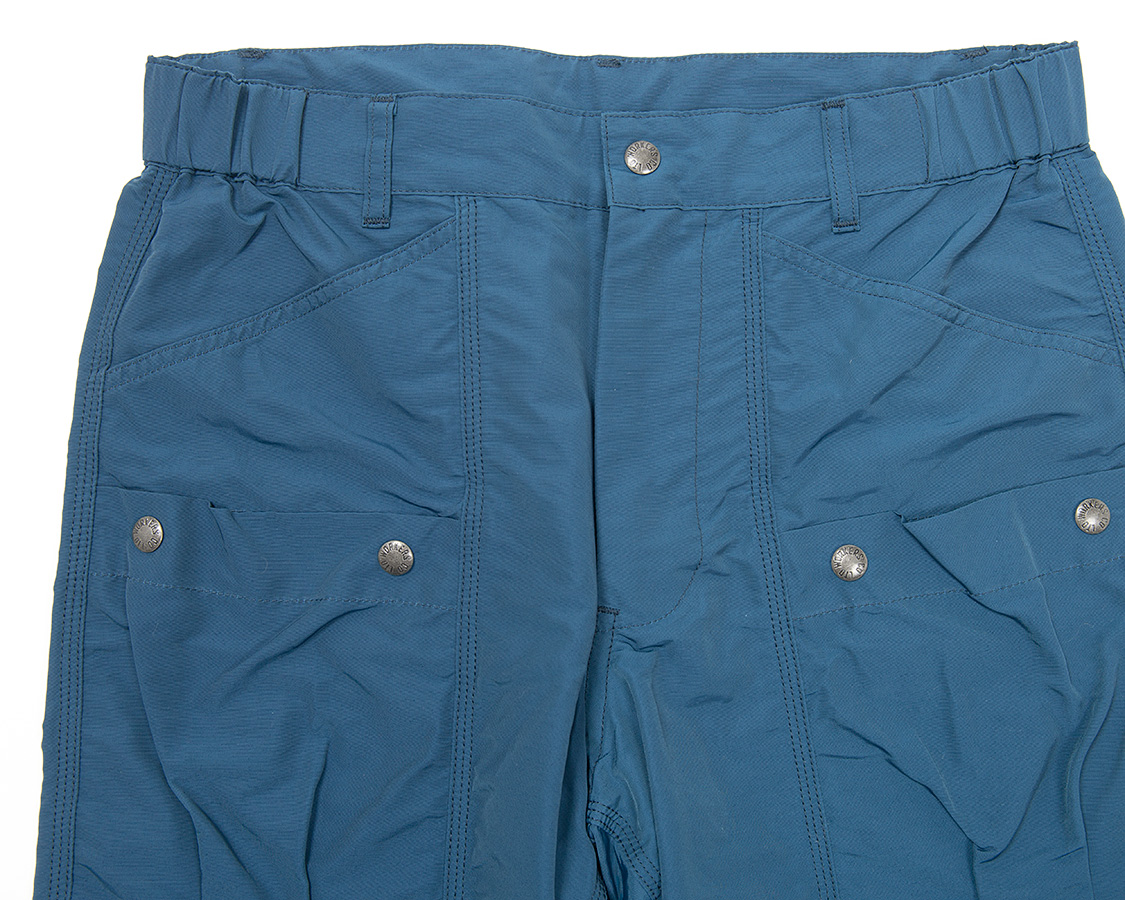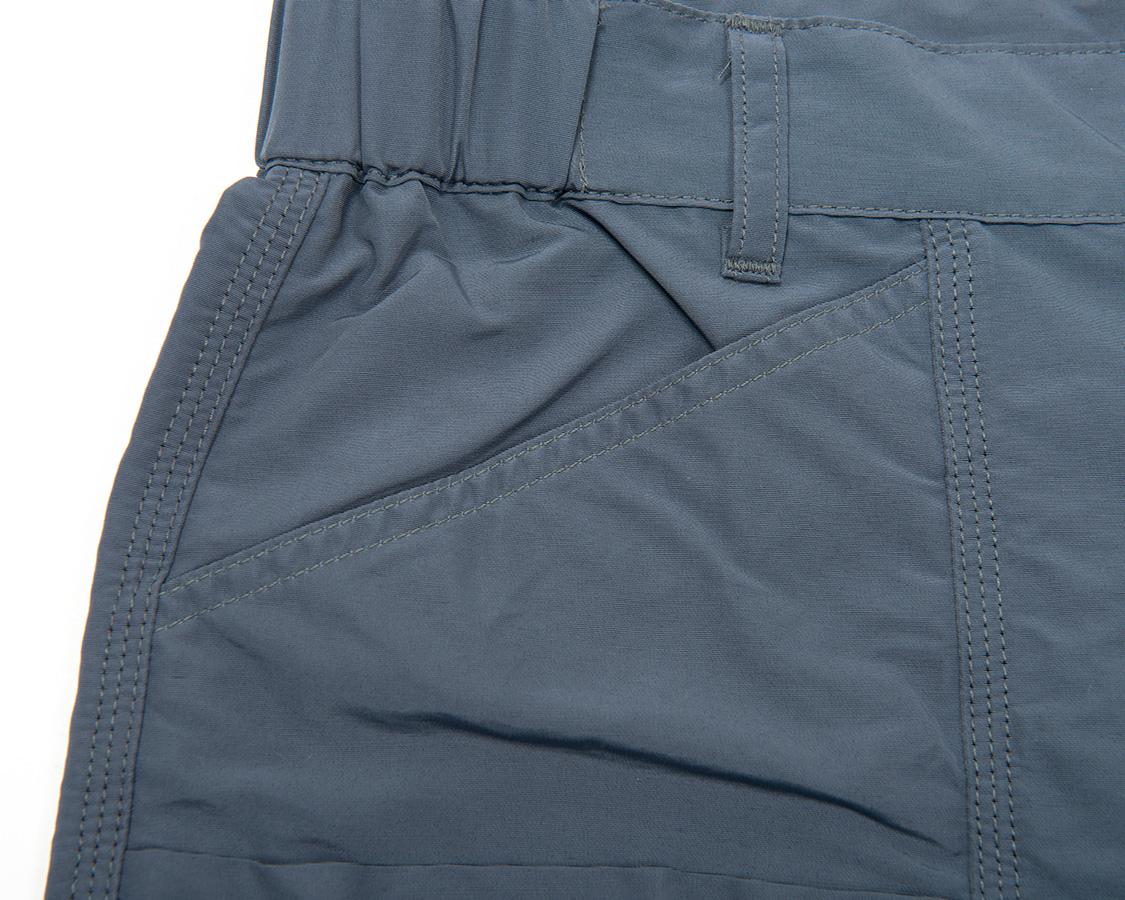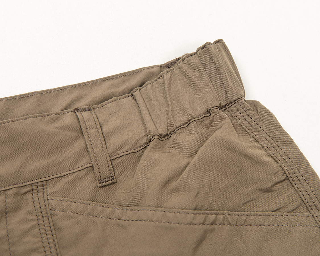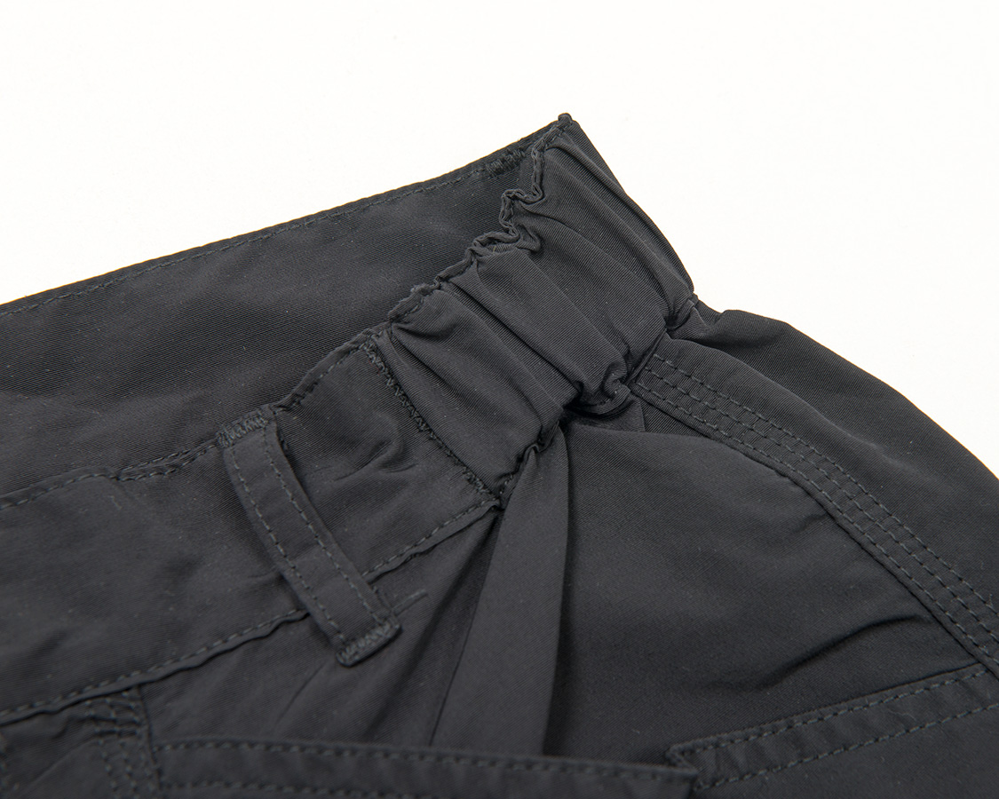 ウェストにゴム入り。フロントポケットは上段・下段ともに少し浮きをつけて手が入れやすいように。その分、浮きはヒダ状になります。