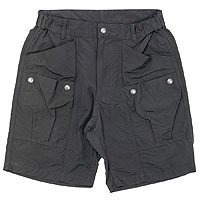 単純なベーカー ショーツでは面白くない。昔見た、カナダ製のスポーツウェアデザインを元にアレンジしています。 フロントは二重ポケット。通常のポケット+ その下にスナップボタンポケット。タックをつけて物が入る容積をかせいでいます。