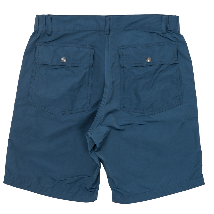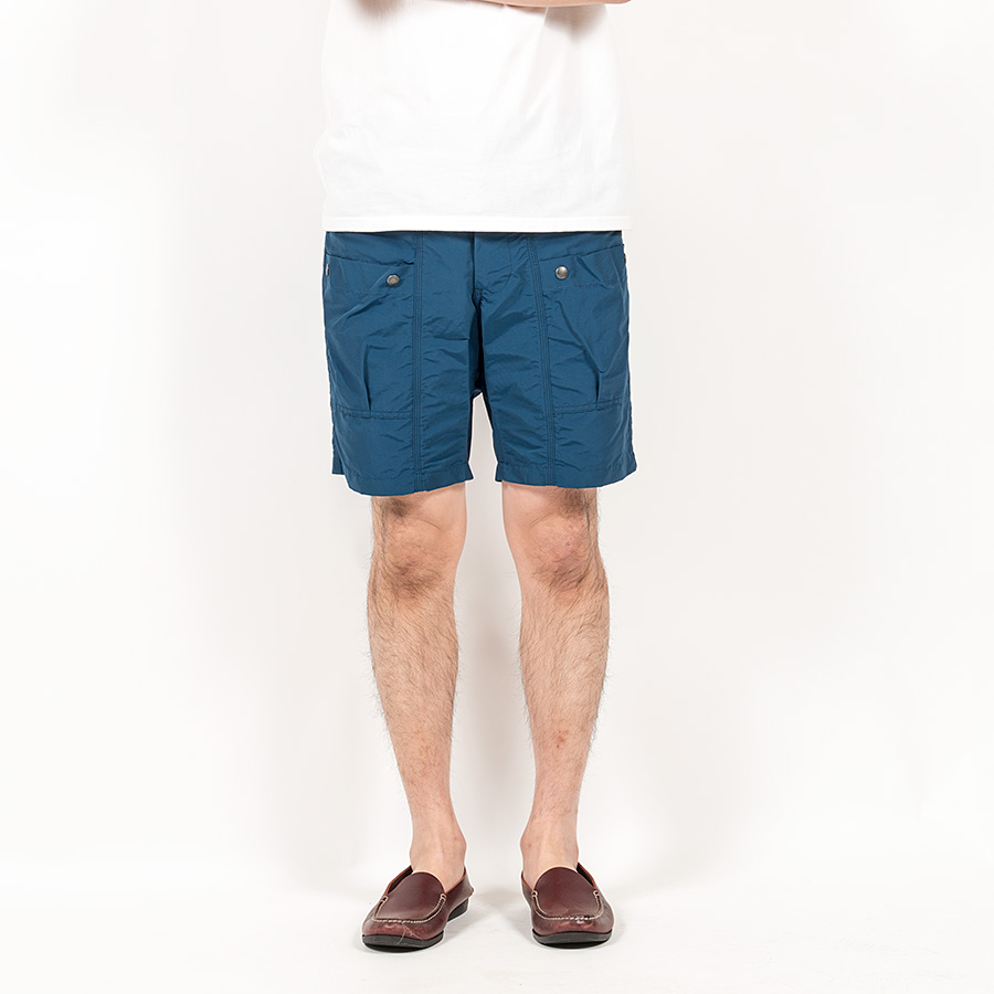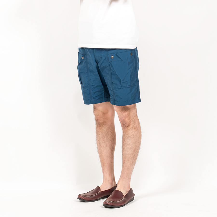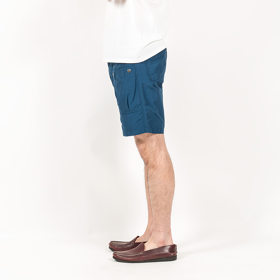 単純なベーカー ショーツでは面白くない。昔見た、カナダ製のスポーツウェアデザインを元にアレンジしています。 フロントは二重ポケット。通常のポケット+ その下にスナップボタンポケット。タックをつけて物が入る容積をかせいでいます。