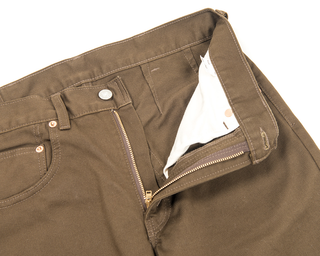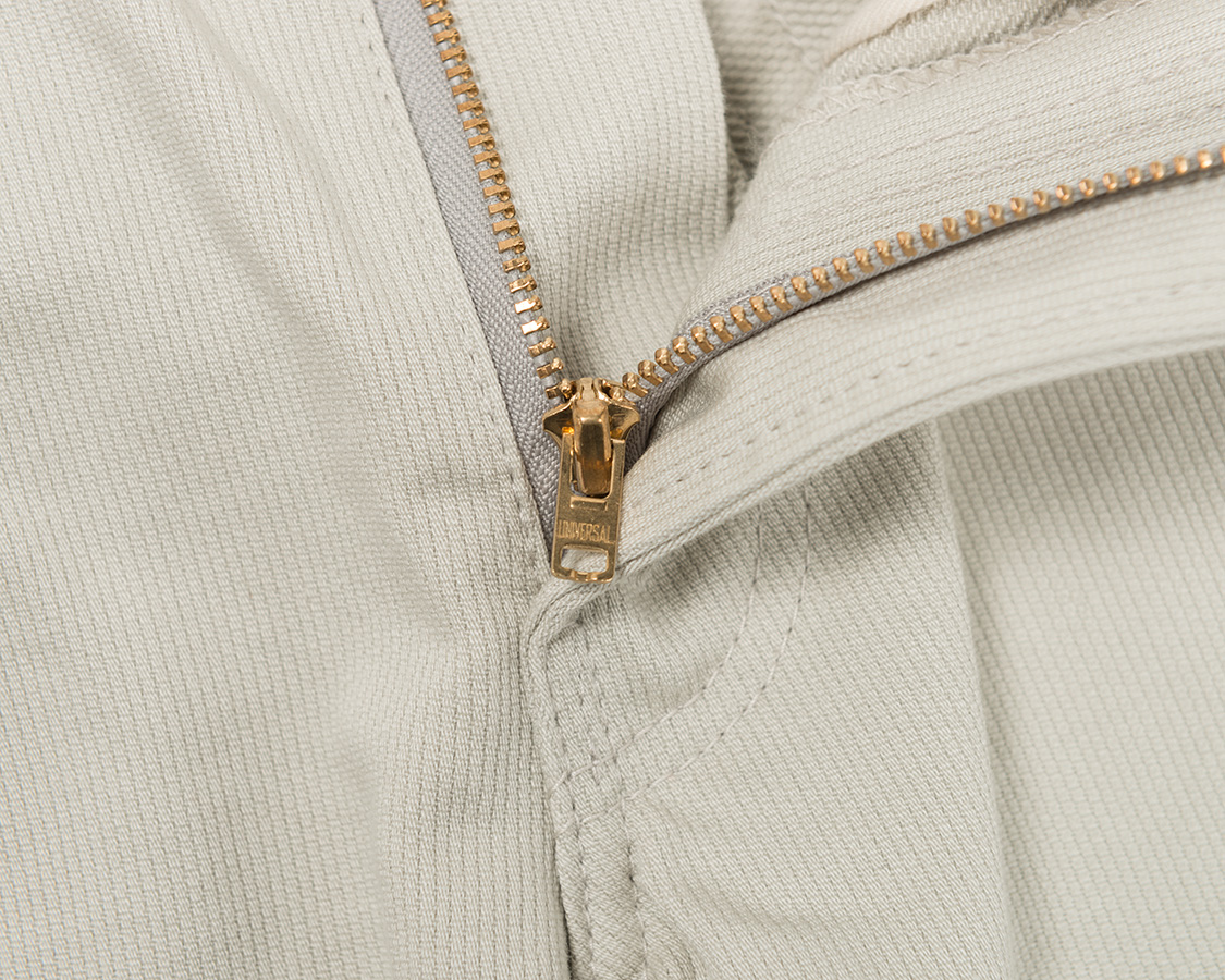 フロントファスナー。クラシックな形をしたUNIVERSAL刻印・YKK製。