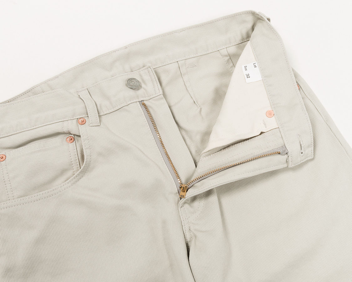 この曲線がチノパンではおなじみのもので、ピケの5ポケットパンツでも、チノパンのような体に沿ったシルエットになります。 |