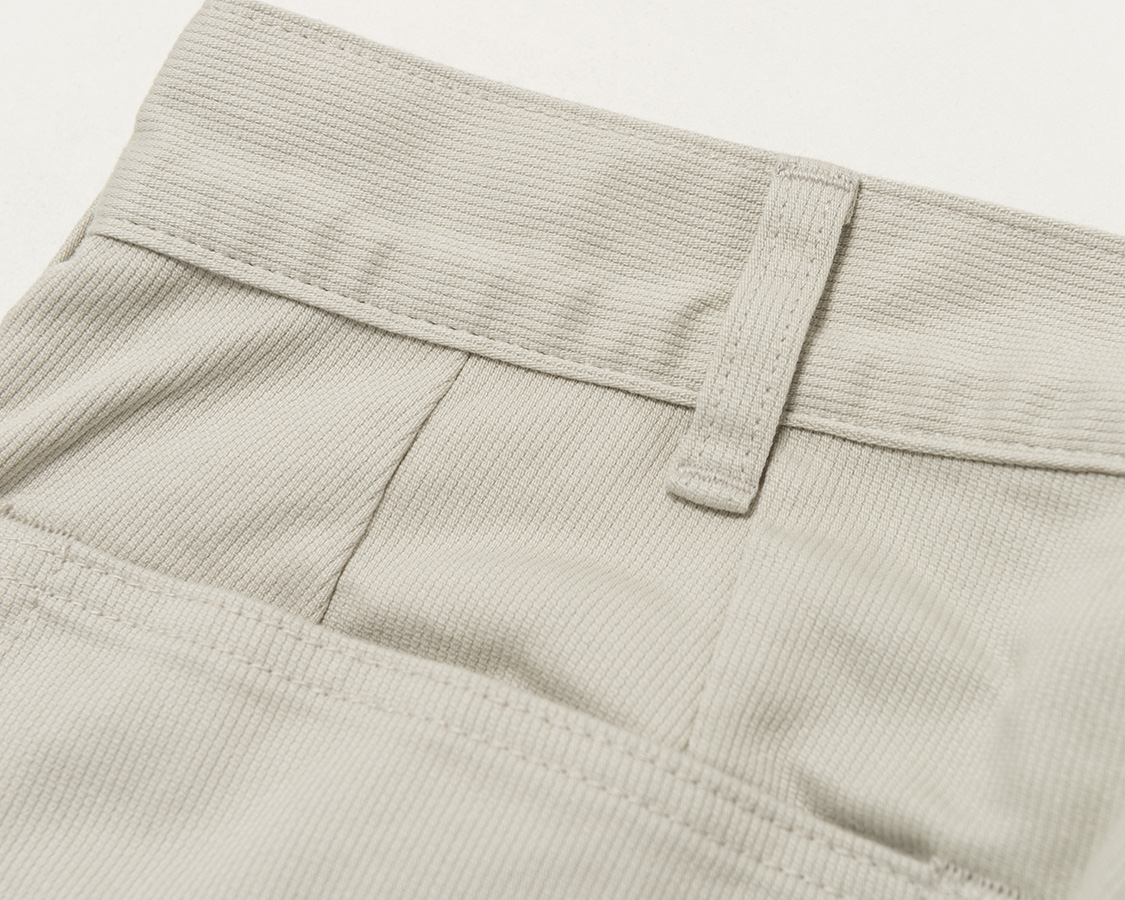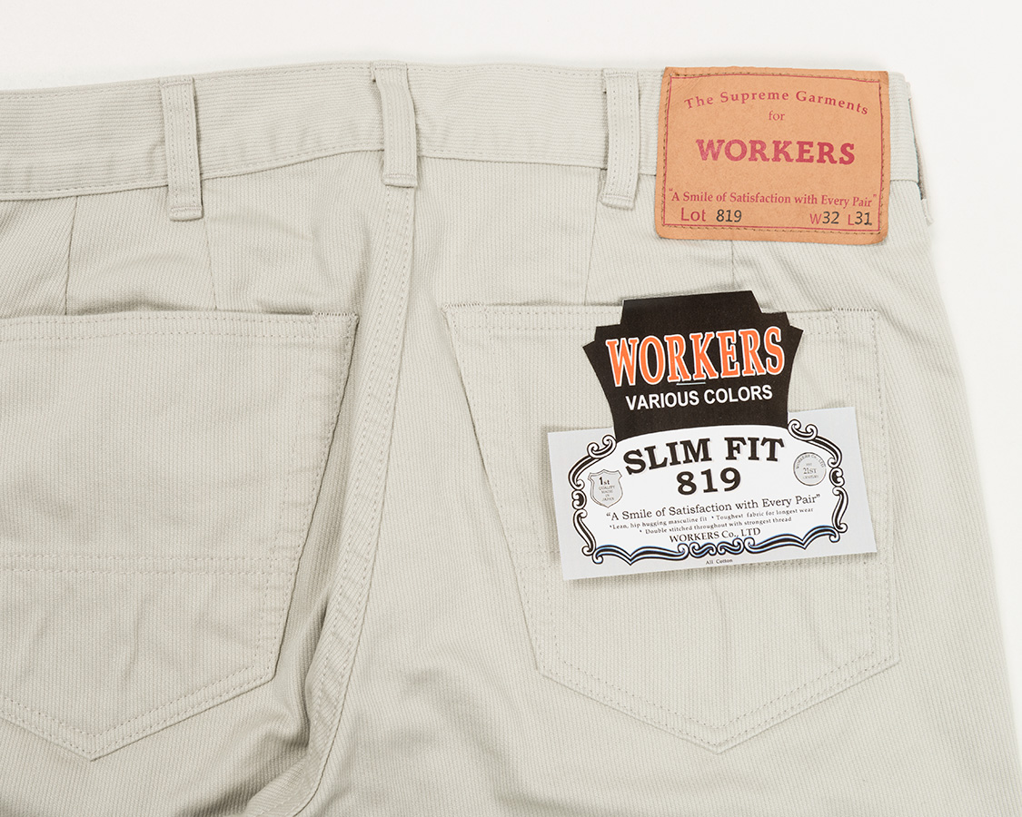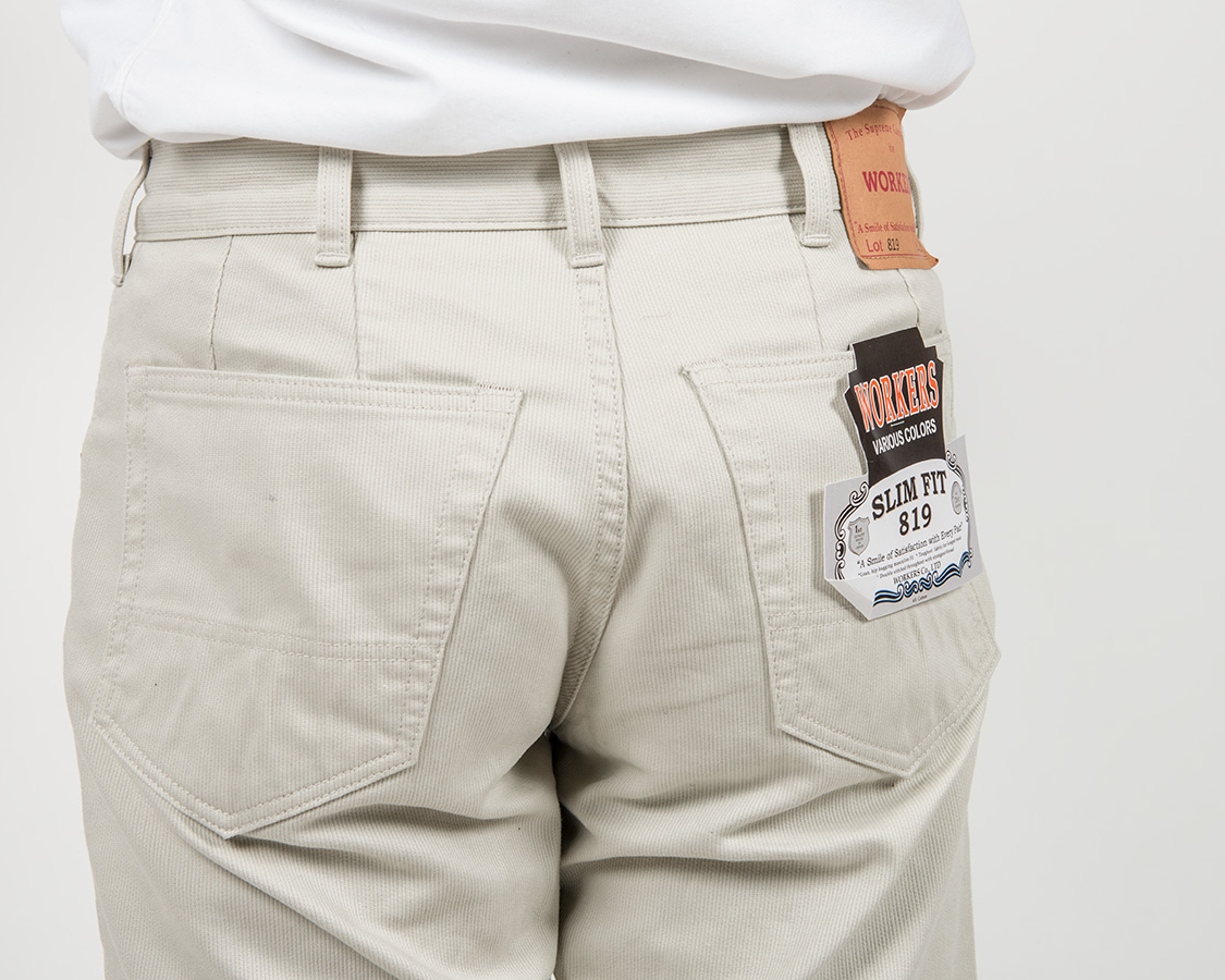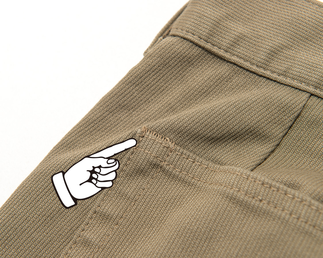 バックから。一番チノパンがもとになっているのがわかる部分。ポケットの上に二本、ダーツがあります。このダーツを使い、ヒップは横方向に十分ゆとりがあり、ウェストがきゅっと絞った体に沿ったシルエットに。ジーンズのヒップがどうしてもきつく、タイトに感じるのに対し、チノパンは体に沿った感じがするのはこのダーツのおかげです。