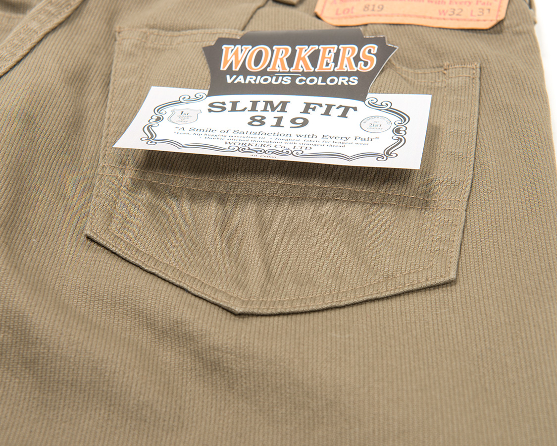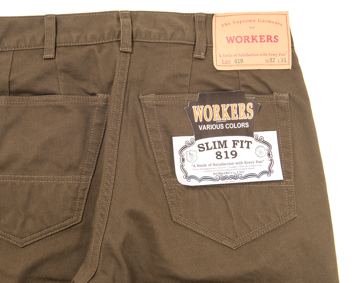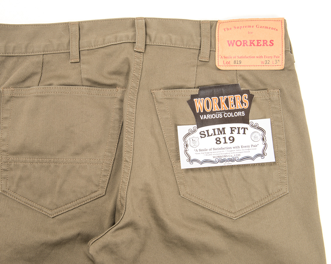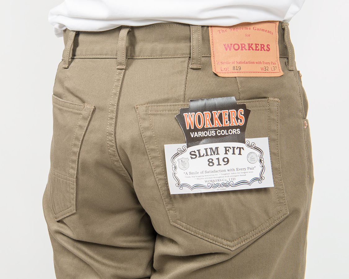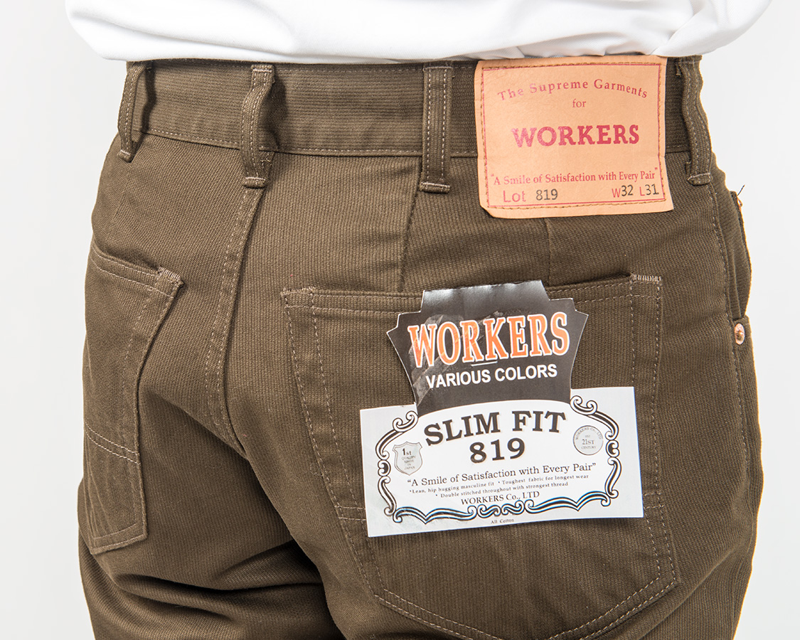 バックから。一番チノパンがもとになっているのがわかる部分。ポケットの上に二本、ダーツがあります。このダーツを使い、ヒップは横方向に十分ゆとりがあり、ウェストがきゅっと絞った体に沿ったシルエットに。ジーンズのヒップがどうしてもきつく、タイトに感じるのに対し、チノパンは体に沿った感じがするのはこのダーツのおかげです。