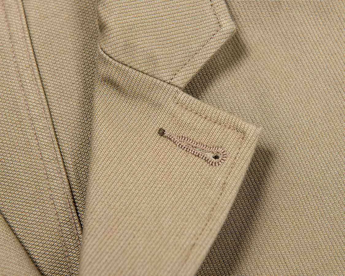 最後、コットンサージは18FW新たに作った生地。17FWで好評だったサージを1ランク薄く、他のチノと同じ10オンス程度に。左綾で、右綾に比べ表面がしなやかなのが特徴。一見ウールのように見えるコットン生地。