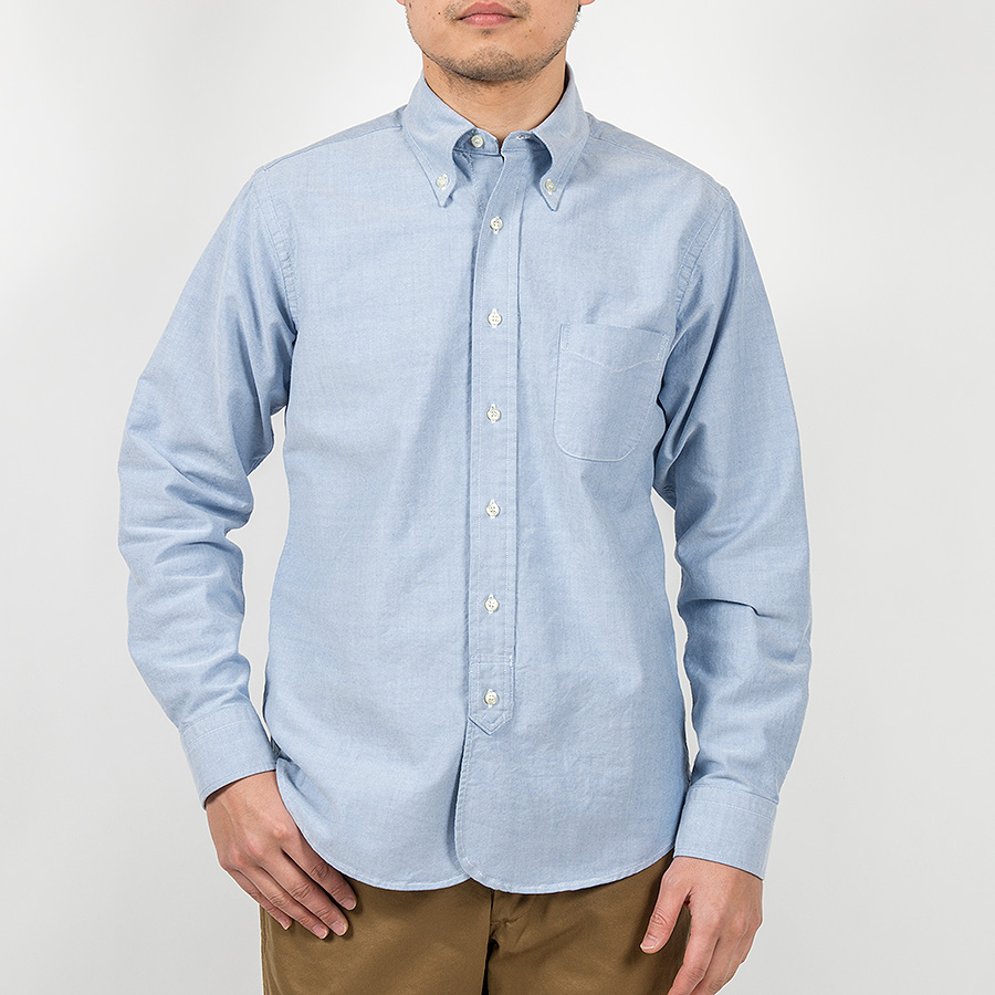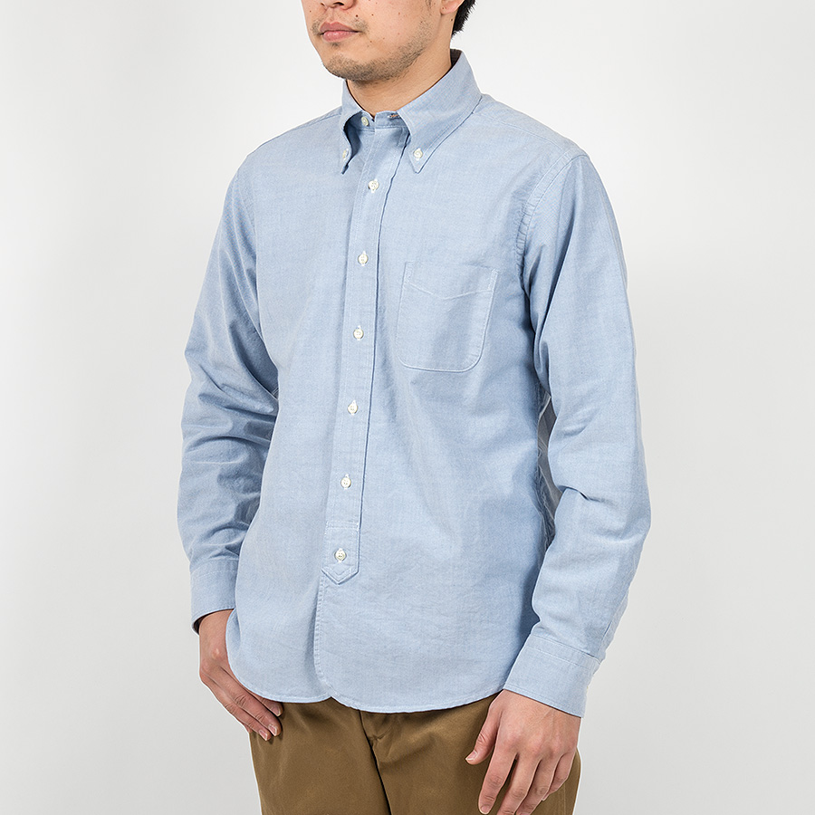 素材はスーピマコットンを使ったオックスフォード。スーピマコットンは、米綿の長長綿。長長綿にありがちな、ドレスウェア過ぎない、ラフながらもどこか高級感があるのが特徴。タテ糸は40番糸の2本引き揃え、ヨコ糸は10番を1本。タテヨコで糸の太さにかなり差があり、それがオックス独特のざらざらした表情を生んでいます。オンスは5オンス程度でシャツとしては中厚クラス。春先から夏前まで。さらに、秋口から冬も通年着られる厚みです。OW済の製品をお送りします。 |