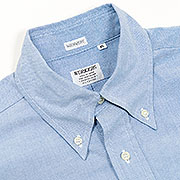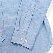 素材はスーピマコットンを使ったオックスフォード。スーピマコットンは、米綿の長長綿。長長綿にありがちな、ドレスウェア過ぎない、ラフながらもどこか高級感があるのが特徴。タテ糸は40番糸の2本引き揃え、ヨコ糸は10番を1本。タテヨコで糸の太さにかなり差があり、それがオックス独特のざらざらした表情を生んでいます。オンスは5オンス程度でシャツとしては中厚クラス。春先から夏前まで。さらに、秋口から冬も通年着られる厚みです。OW済の製品をお送りします。 |