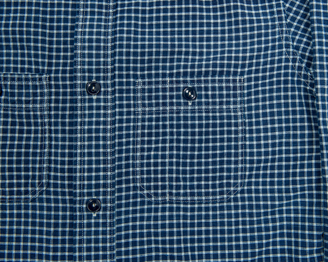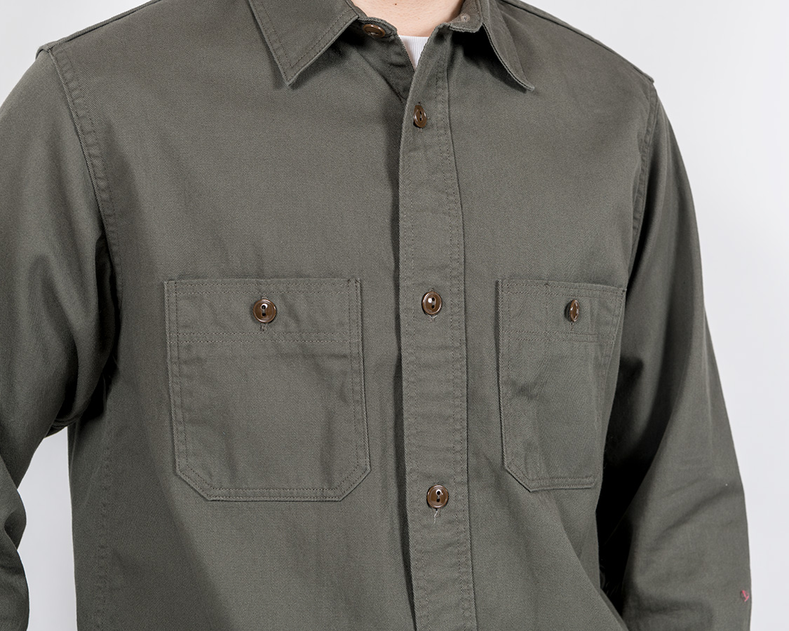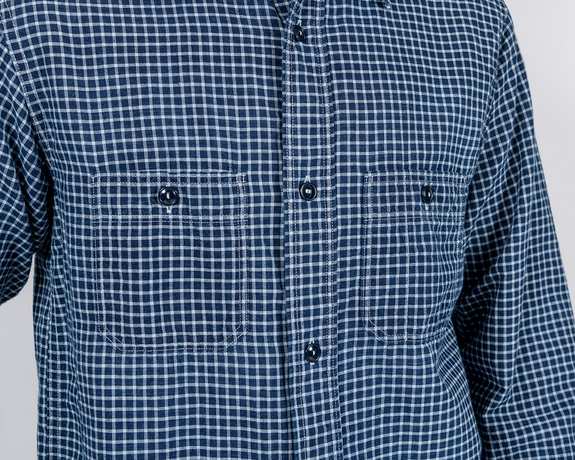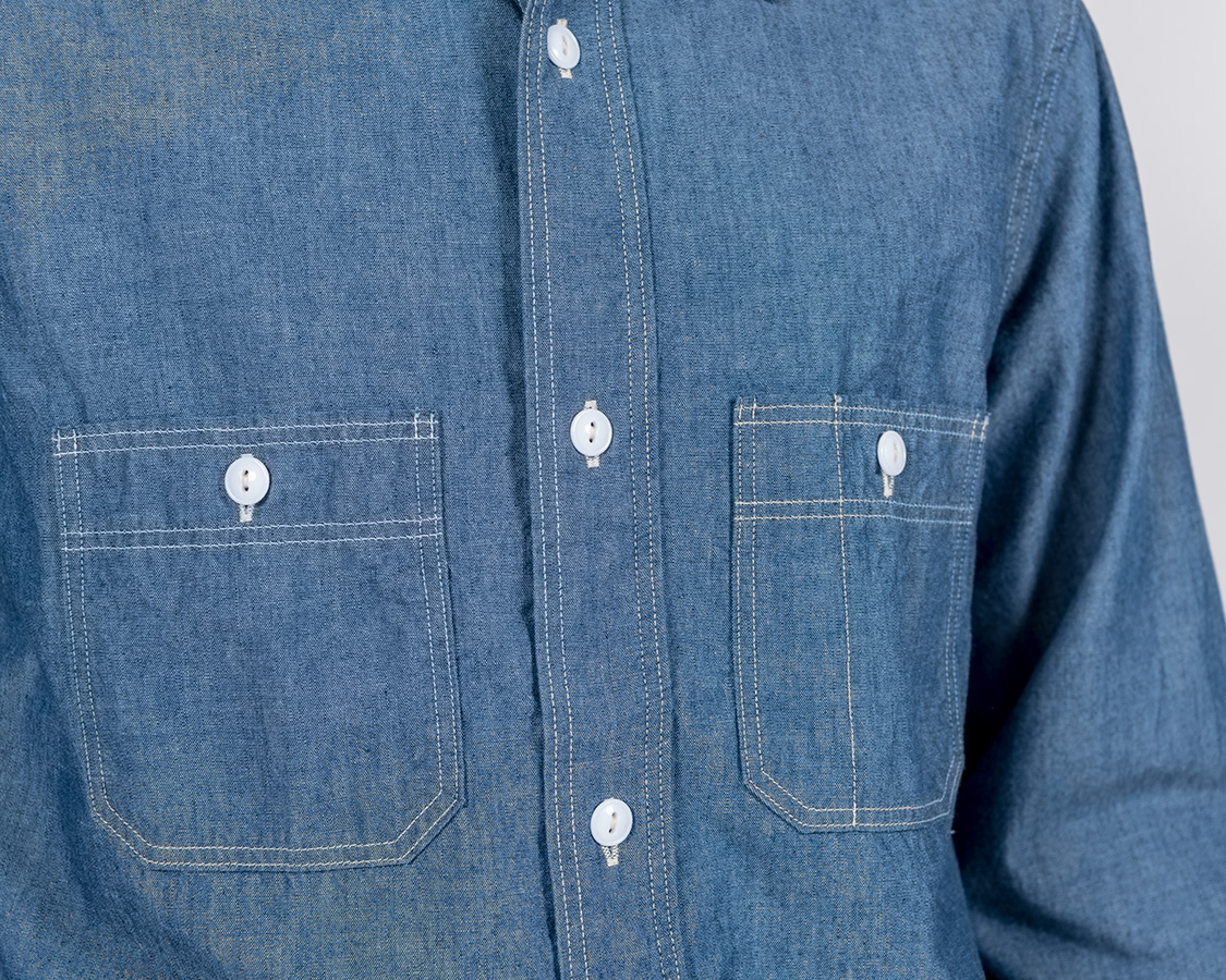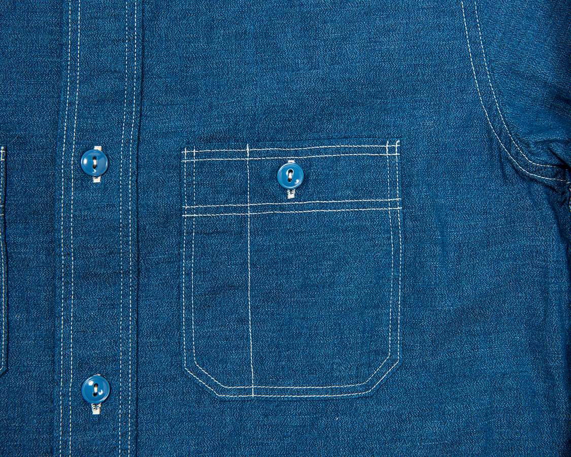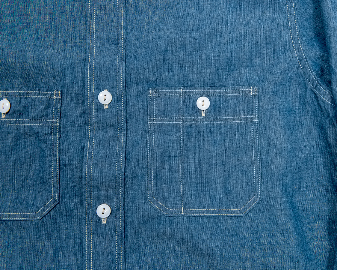 左右、6角形のポケット、ポケット口は前立てと同じ、多本針ミシンでチェーンステッチ始末。このあたりは、いわゆる「ワークシャツの文法」をきっちり守っています。