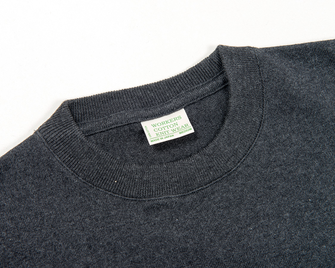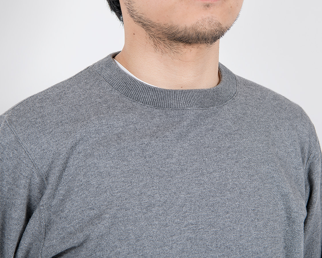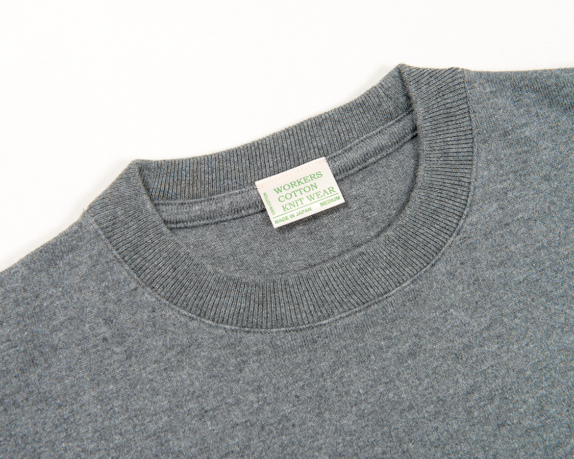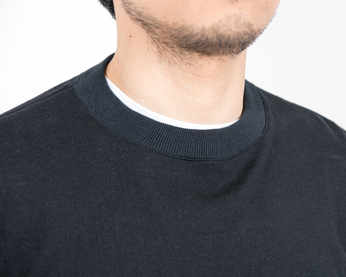 Tシャツの扱いやすさと、セーターのすっきりした雰囲気を併せ持つ製品。首回りはリブを横編みで作っています。ここも丸編み機を使ってリブ(フライス)を編むこともできるのですが、あえてセーター編み機で作って、よりセーターっぽさを強調しています。