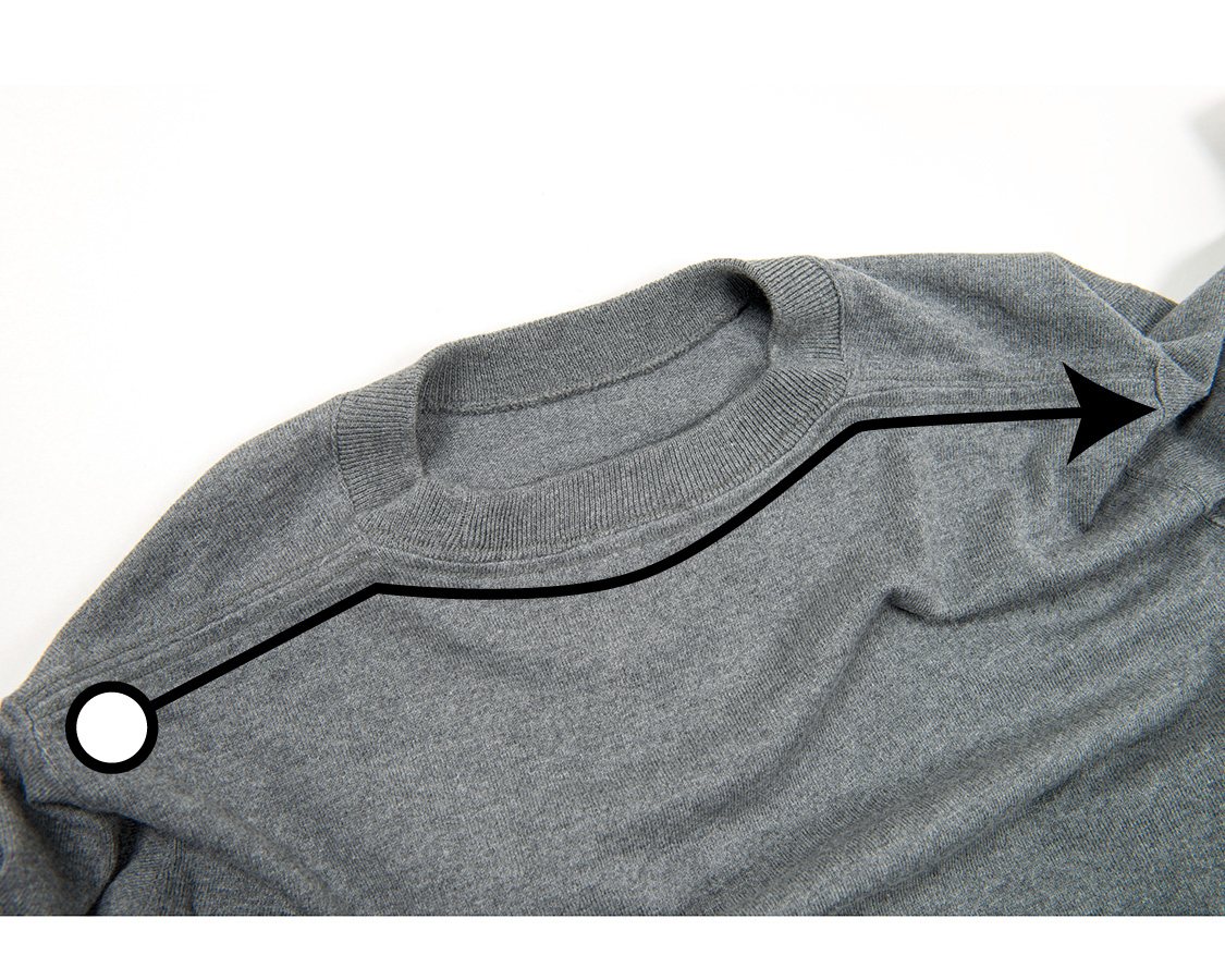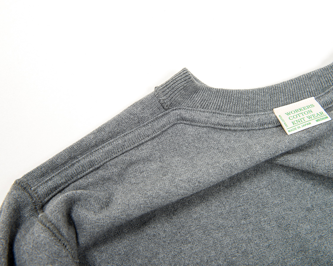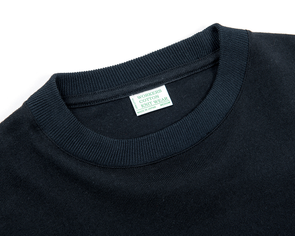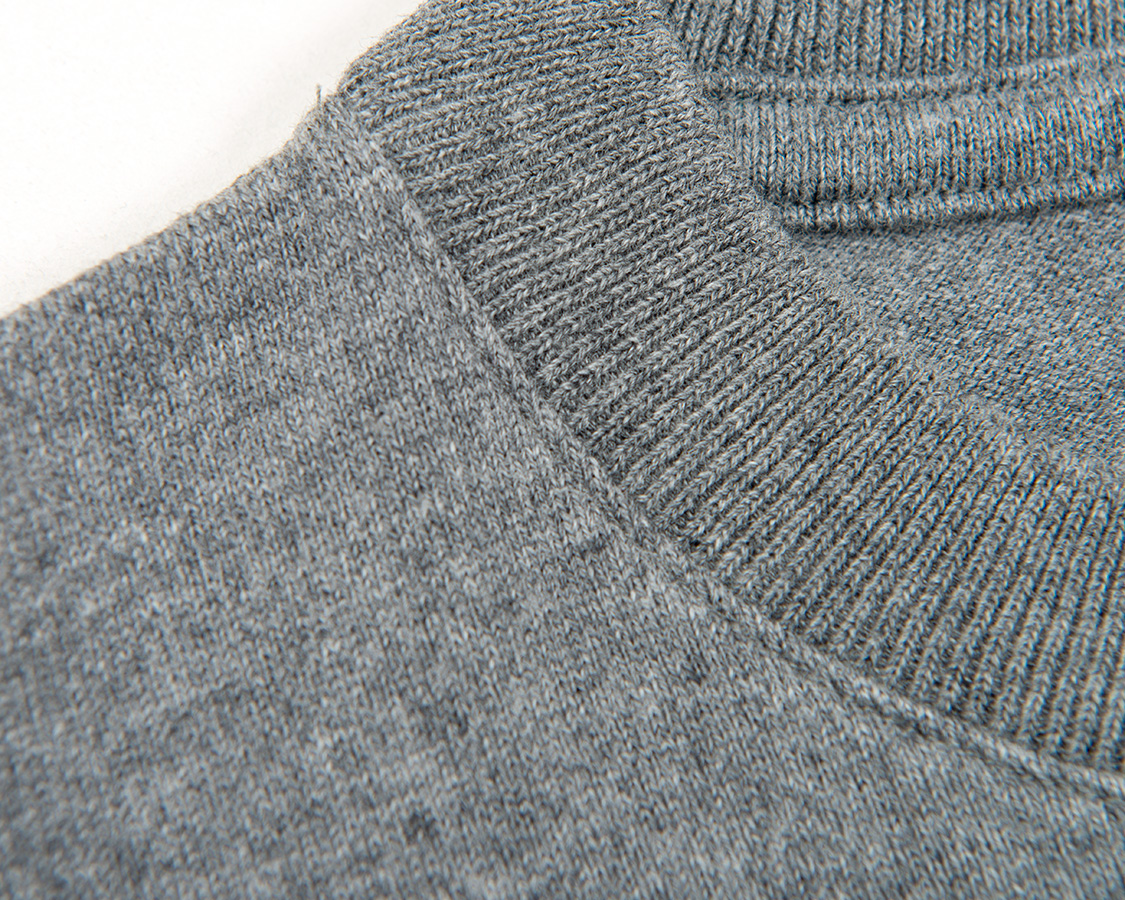 Tシャツの扱いやすさと、セーターのすっきりした雰囲気を併せ持つ製品。首回りはリブを横編みで作っています。ここも丸編み機を使ってリブ(フライス)を編むこともできるのですが、あえてセーター編み機で作って、よりセーターっぽさを強調しています。