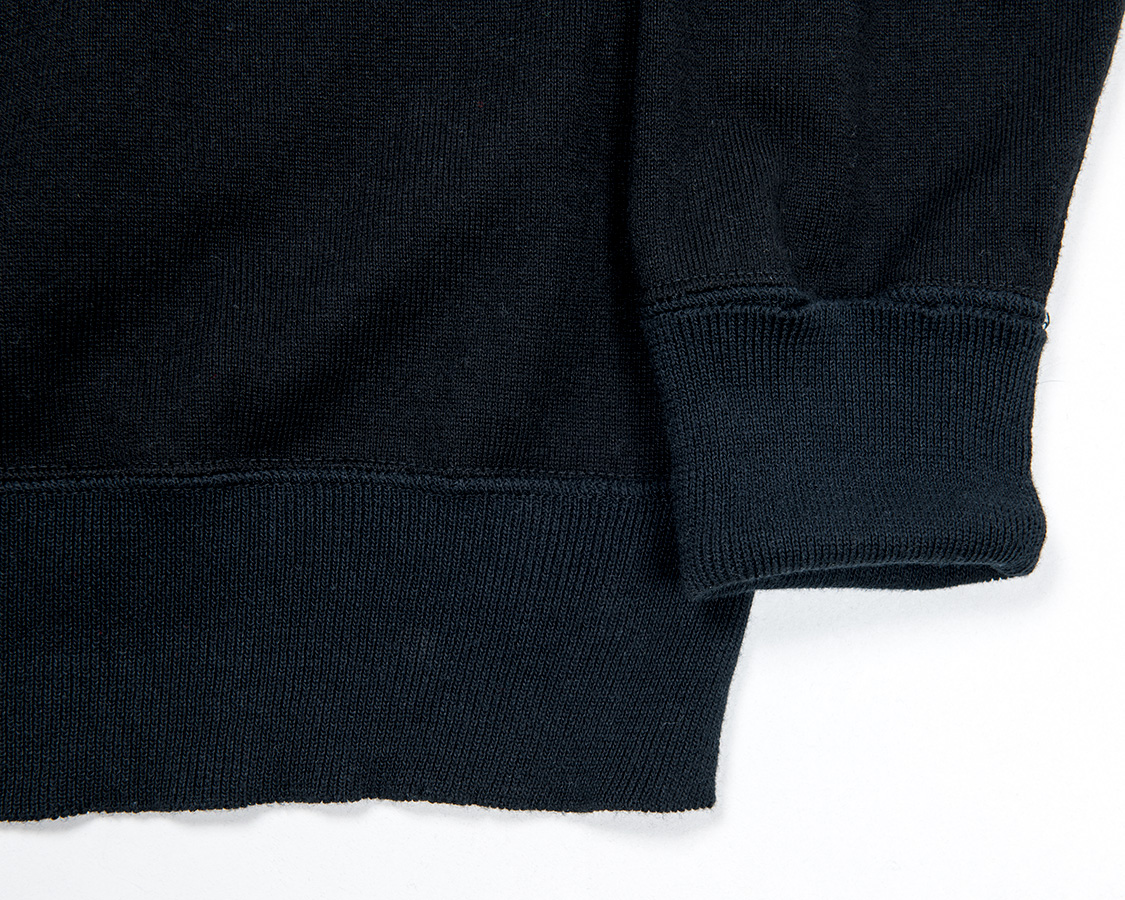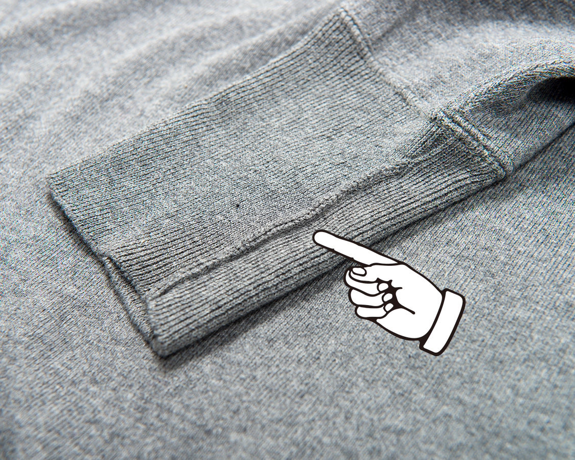 裾と袖口のリブ。セーターの場合、身頃から裾、袖から袖口は一続きで編まれるのに対し、こちらは切れ目があって縫っています。まず、一度地縫いしてから扁平縫いという裏にロック目が出る縫い方で縫い目をつぶします。二度縫うので伸びづらい、強度がある、縫い目が平らになっているので体に当たった感じが弱い。