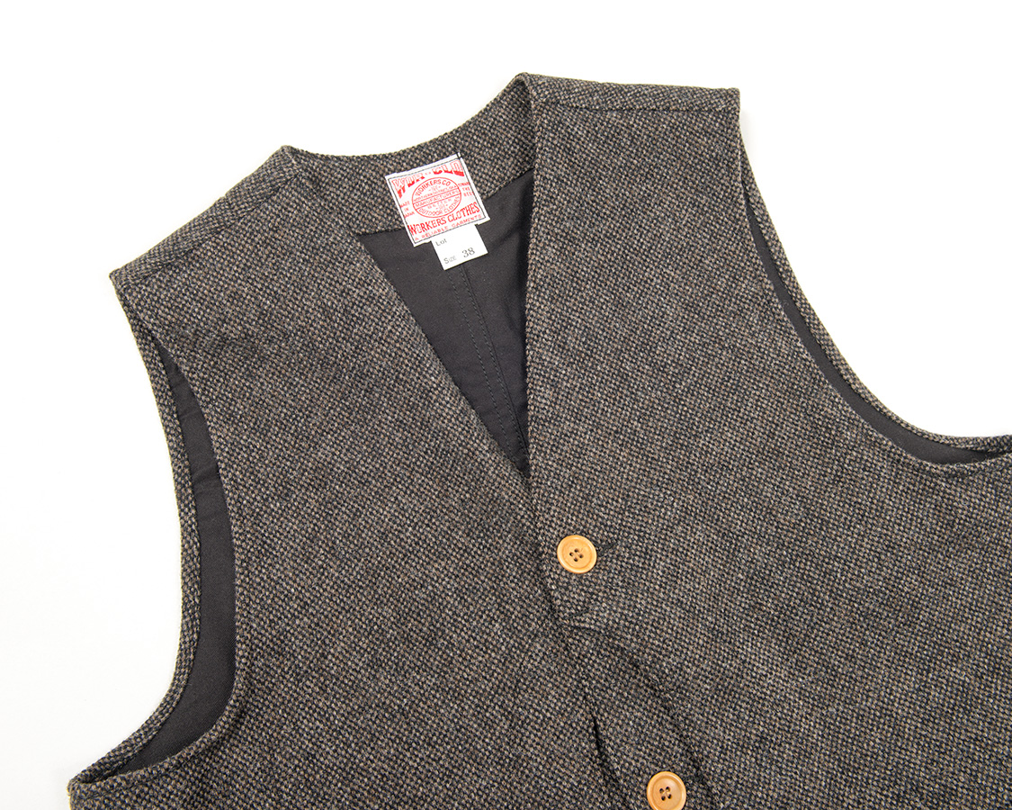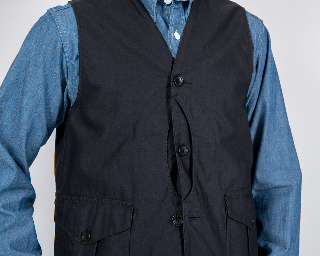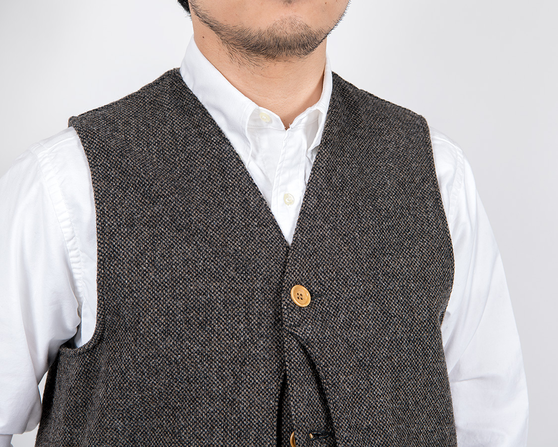 ビンテージのハンティングベスト をアレンジして作りました。まずVゾーン。比較的狭く、かつ直線的。HETTRICKのベスト がバランスとしては近いものがあります。