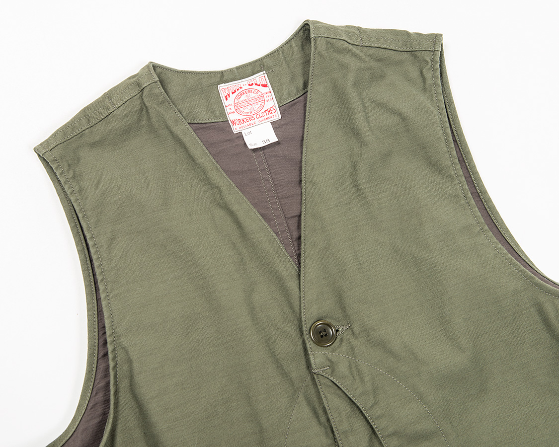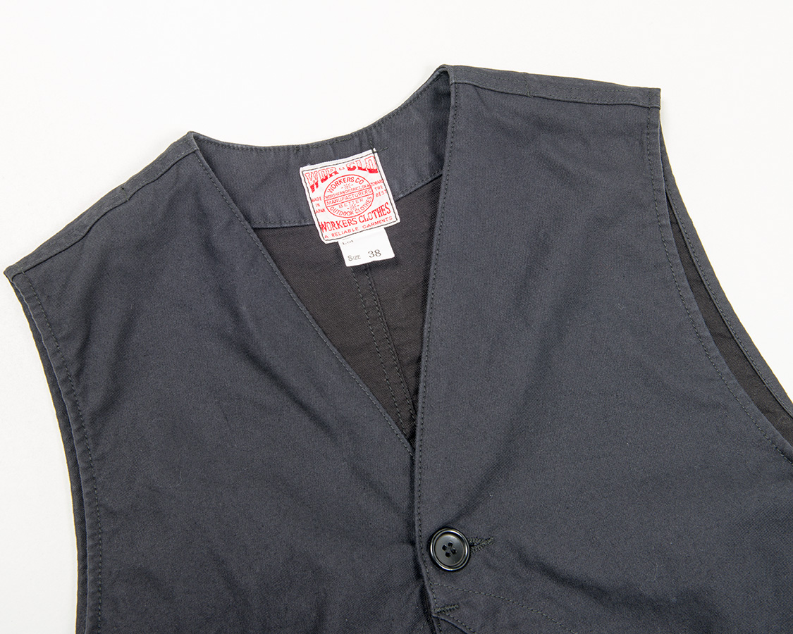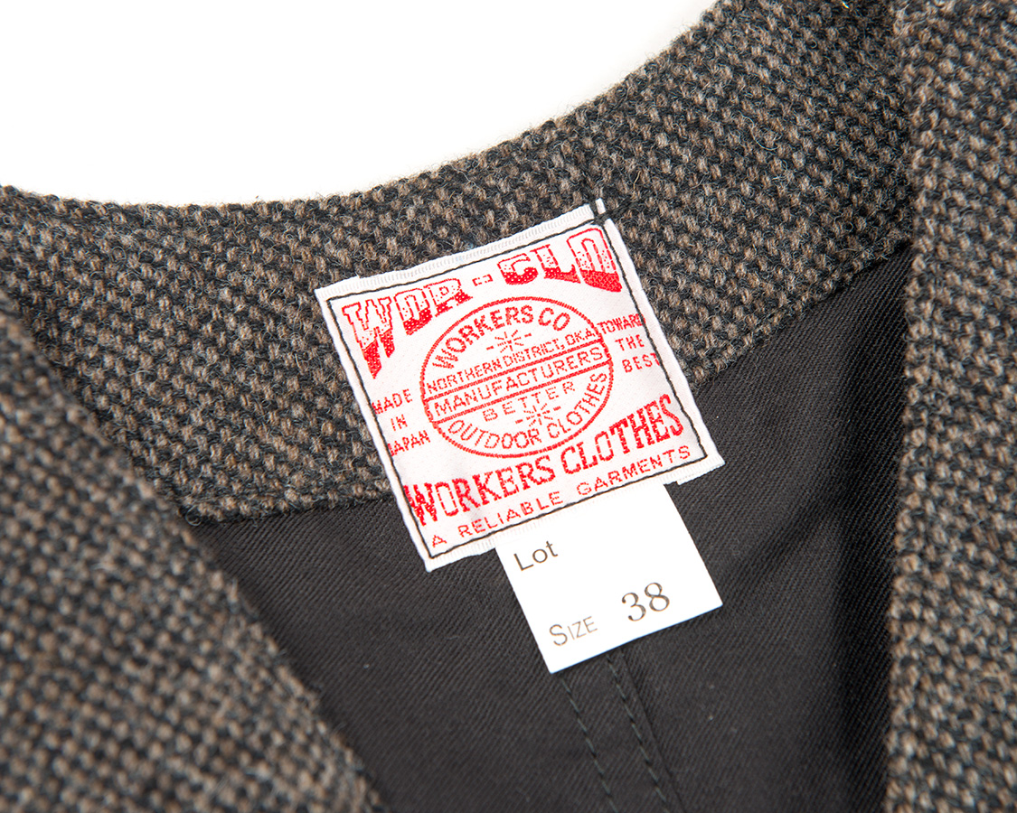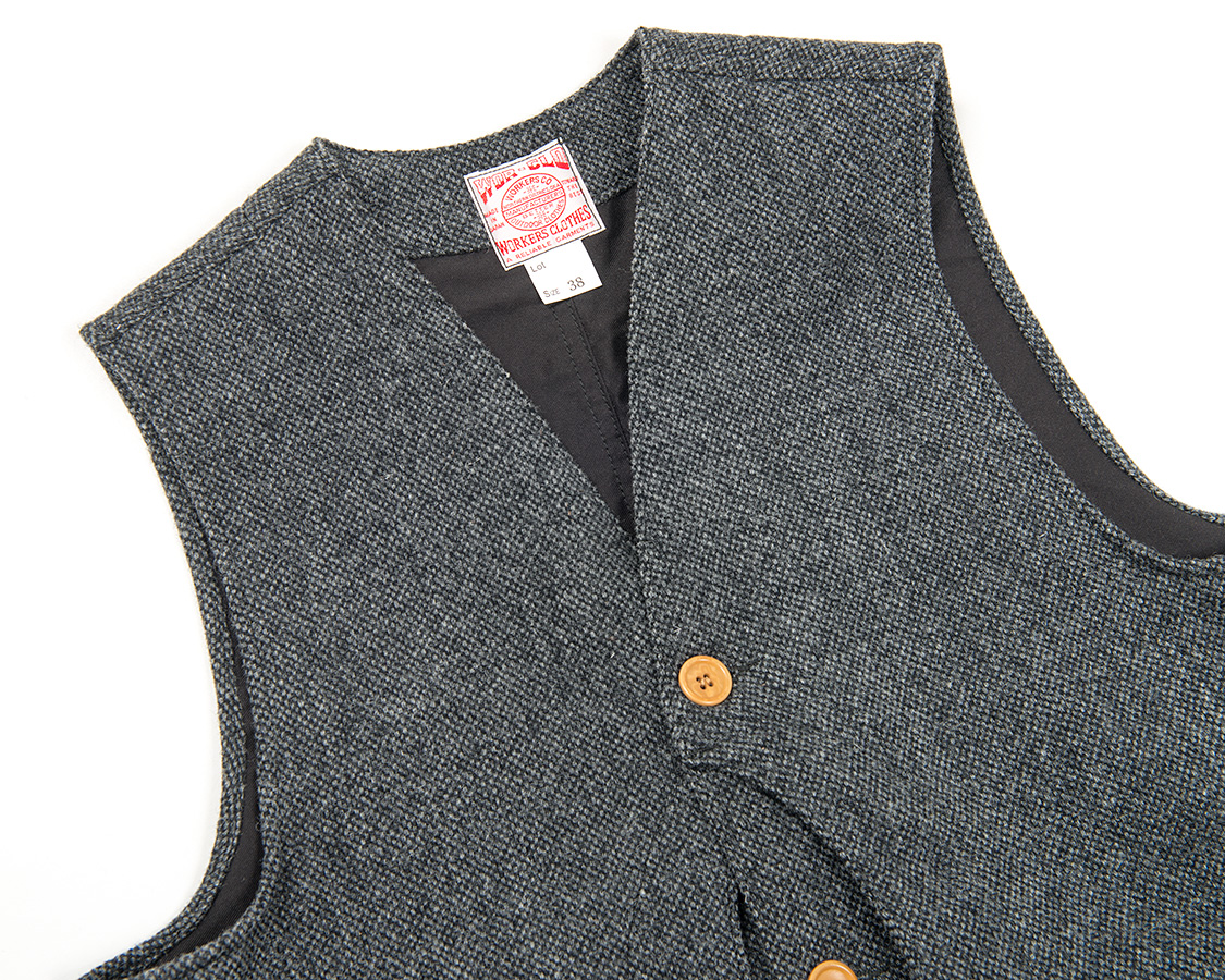 ビンテージのハンティングベスト をアレンジして作りました。まずVゾーン。比較的狭く、かつ直線的。HETTRICKのベスト がバランスとしては近いものがあります。