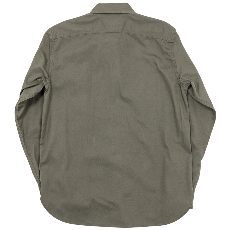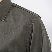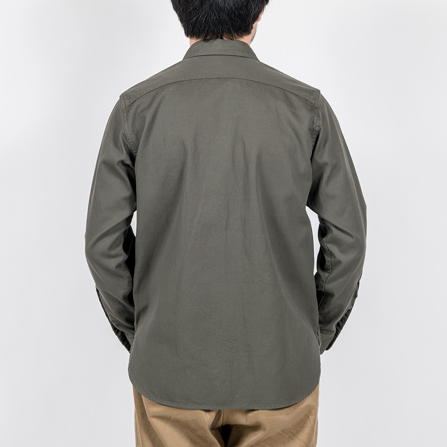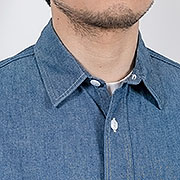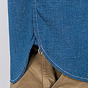 「ど」ベーシックなワークシャツ。チンスト無しの普通の台襟、各パーツのハギ合わせに使う巻縫いもあえてトリプルステッ チではなくダブルステッチの1/4 インチ幅。ただ、フロントは多本の環縫い、下前もスレキを使った多本環縫い。着こみ、 洗いこんだ後に「ワークシャツらしいな」と感じる部分はきちっと再現しています。
