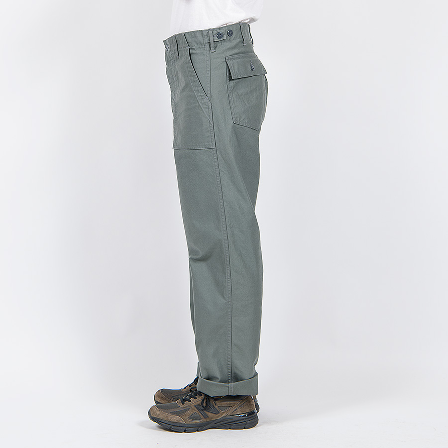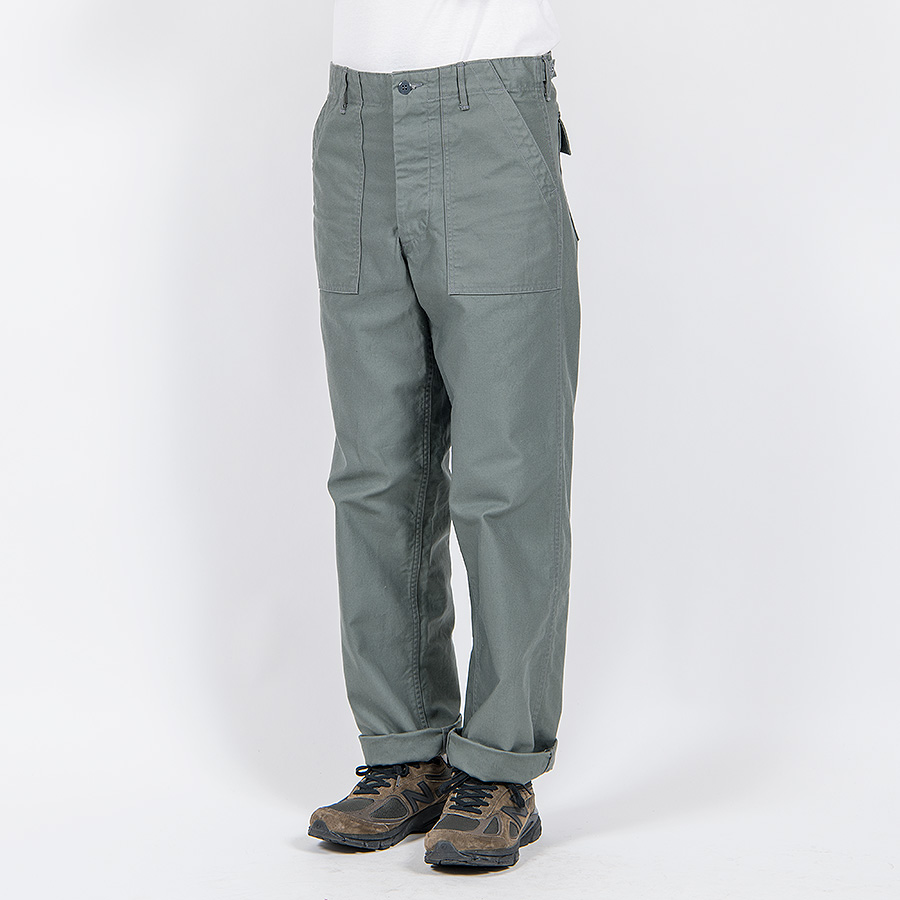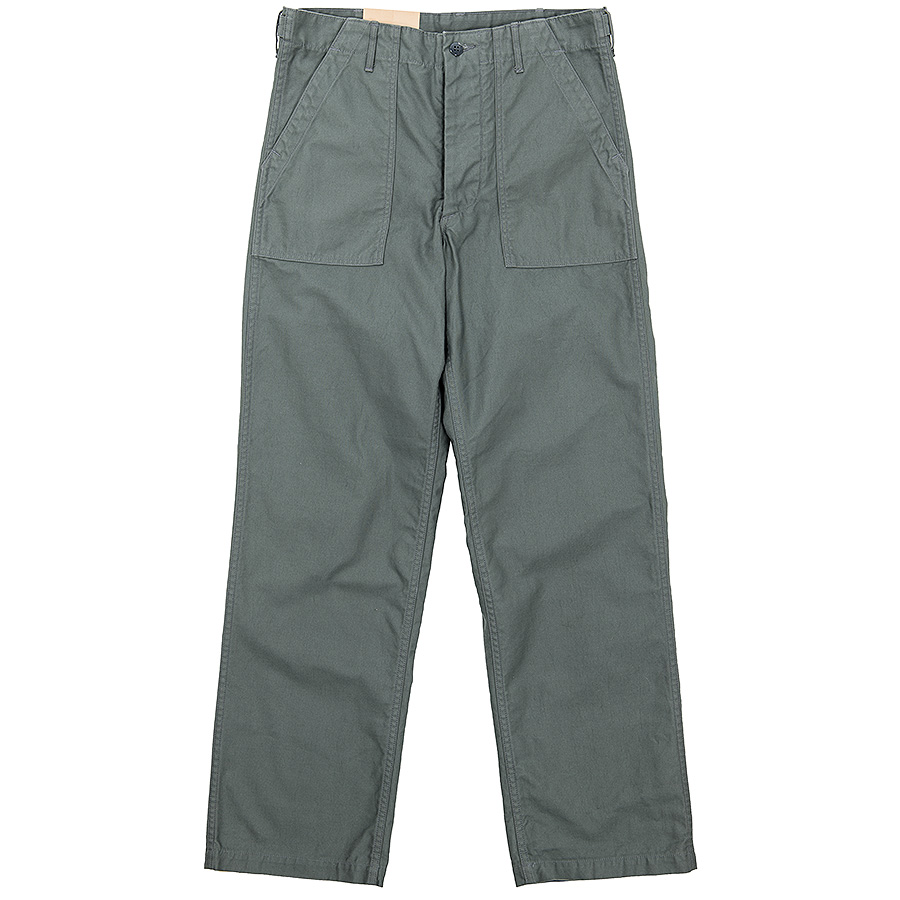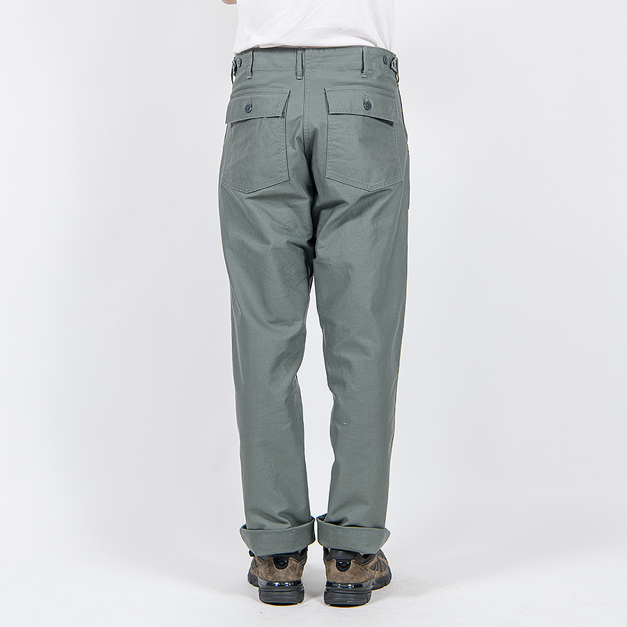 Sage Green は同じバックサテンでもベーカーパンツ定番の目の粗い物とは違う、M-5 に使われている物を再現したより細い糸で密に織られたもの。