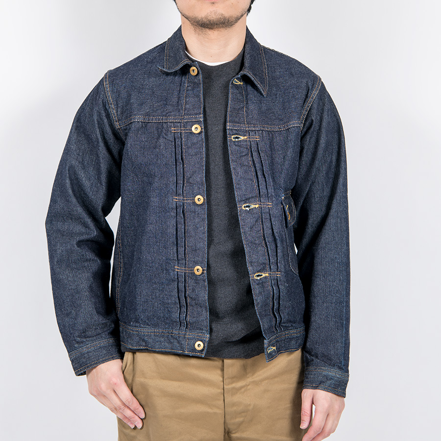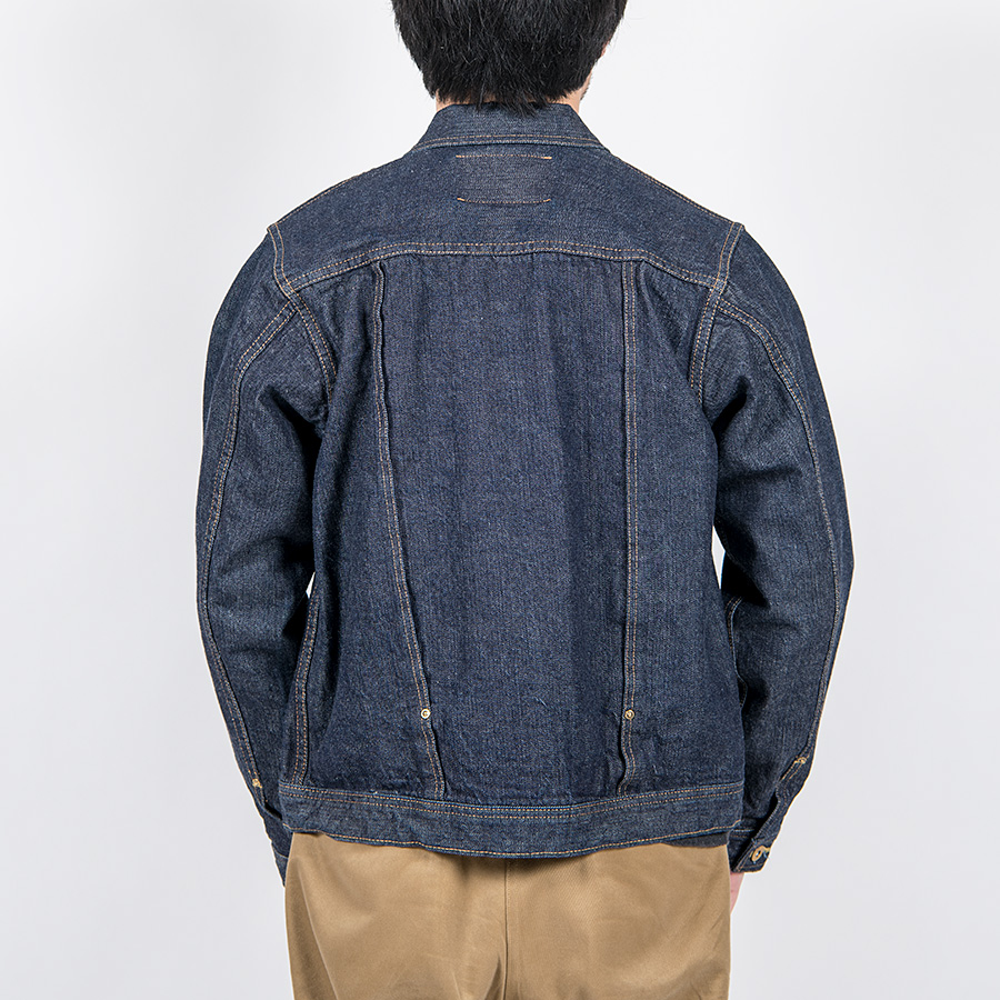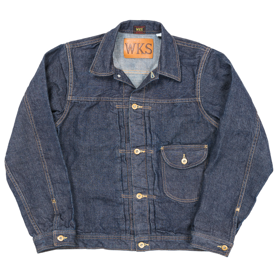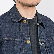 WORKERS、綿・糸からオリジナルのデニム生地。もともと右綾を最初に作りましたが、それをスペックはそのままで左 綾にしたらどんな色落ちになるのか?という実験の意味もあるデニムジャケット。
