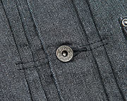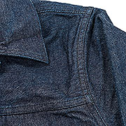 形はカンザス州のL社でおなじみ、カウボーイジャケット型。この新型に合わせてラベル・ボタンも作りました。革ラベルは防縮の入った牛革。ボタンは二本爪のドーナツにこれもそれ風にWORKERSの刻印を入れて。WORKERSらしいのは左綾デニムのフラップ裏で抜染生地を使っています。