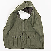 腰の大型ポケット、フロントの三日月型ポケット。フロント・バック共に裏地付。本来、ハンティングで獲物を入れたり、 道具を入れて両手をあけるための「道具服」。これを着やすい素材で作りバッグ代わりに。
