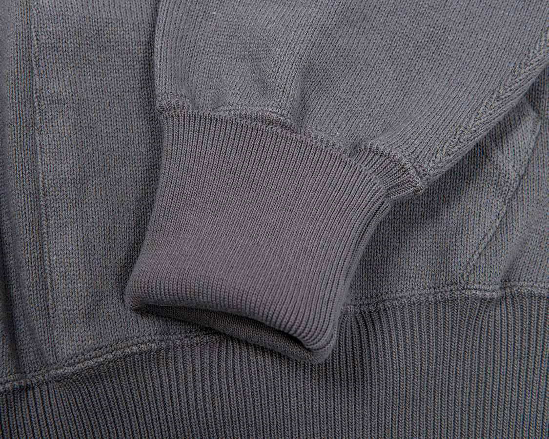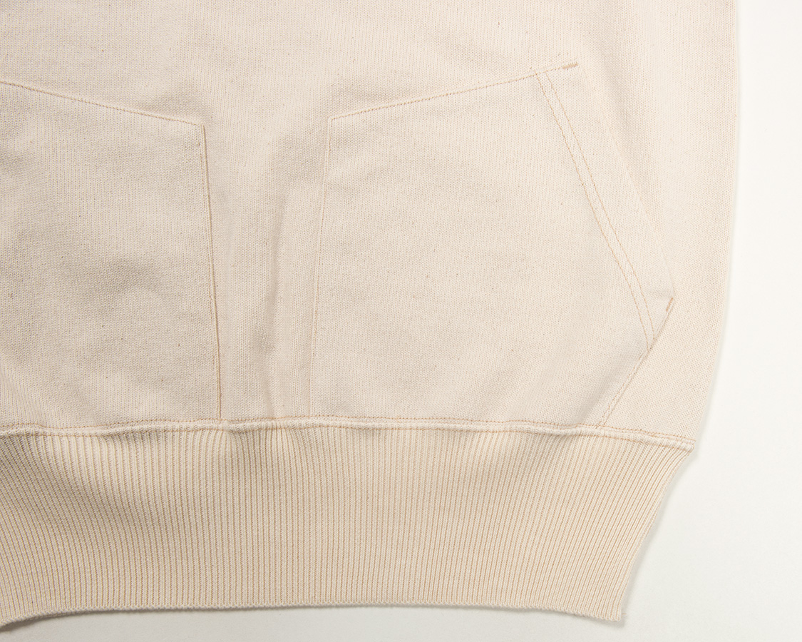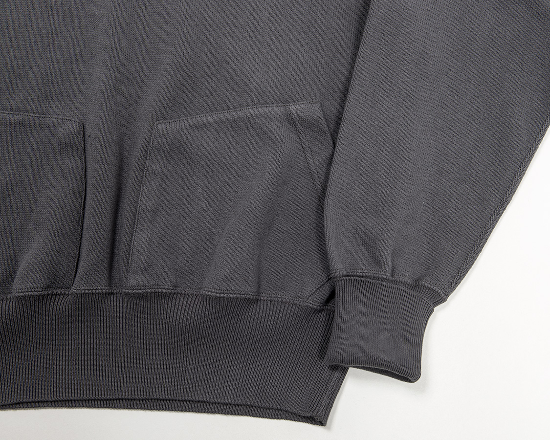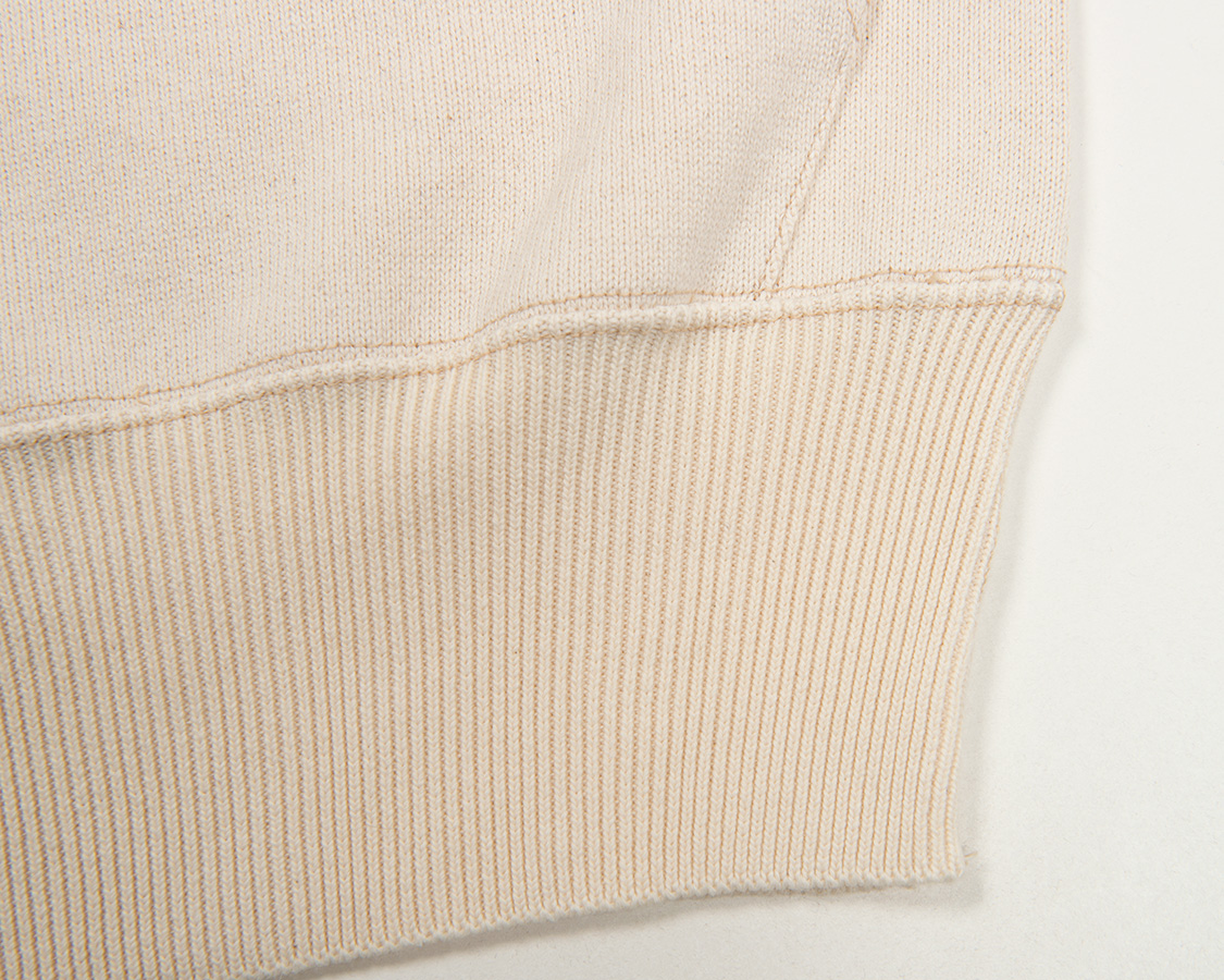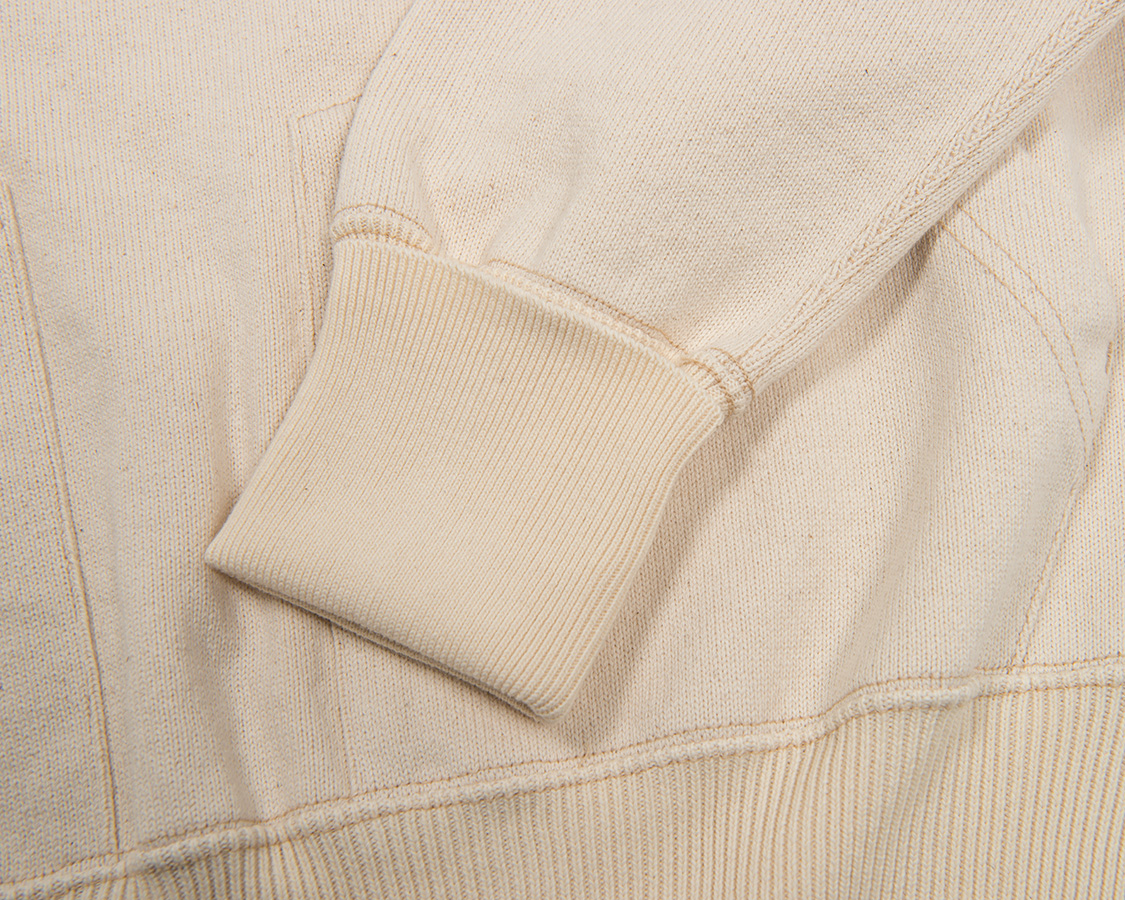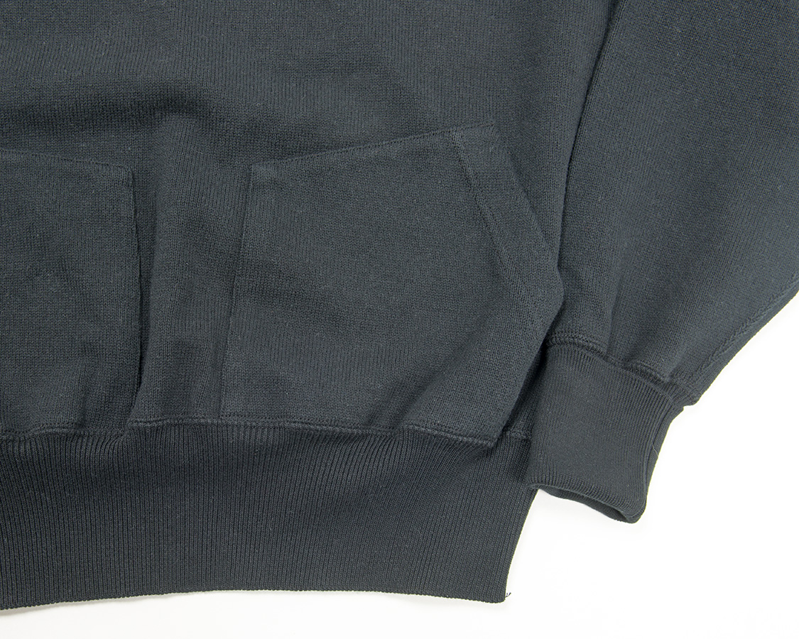 セパレートタイプのハンドウォーマーポケット。このあたりは「ビンテージ」的な仕様をやりたいだけやっています。古着を見て育った世代的にはセパポケはたまらんのです。ただ、そこにつく袖口リフはセーター風の折り返し。 デザインとしてビンテージ的な仕様を取り入れているわけです。