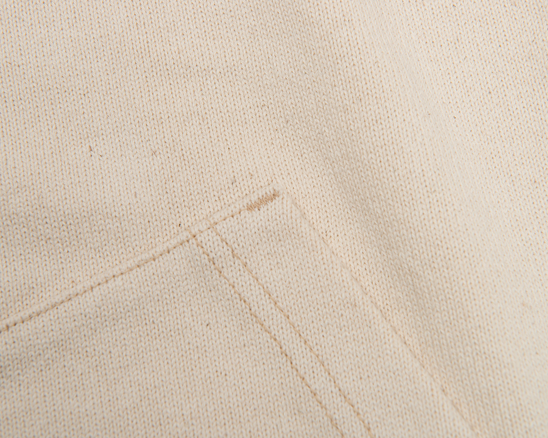 かなり太い糸、糸の取り本数も多くフライス(リブ)に厚みがあるので、編みだし部分、裾リブは一番下の部分がきれいに収まっています。