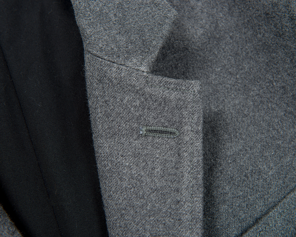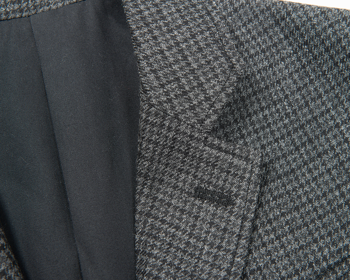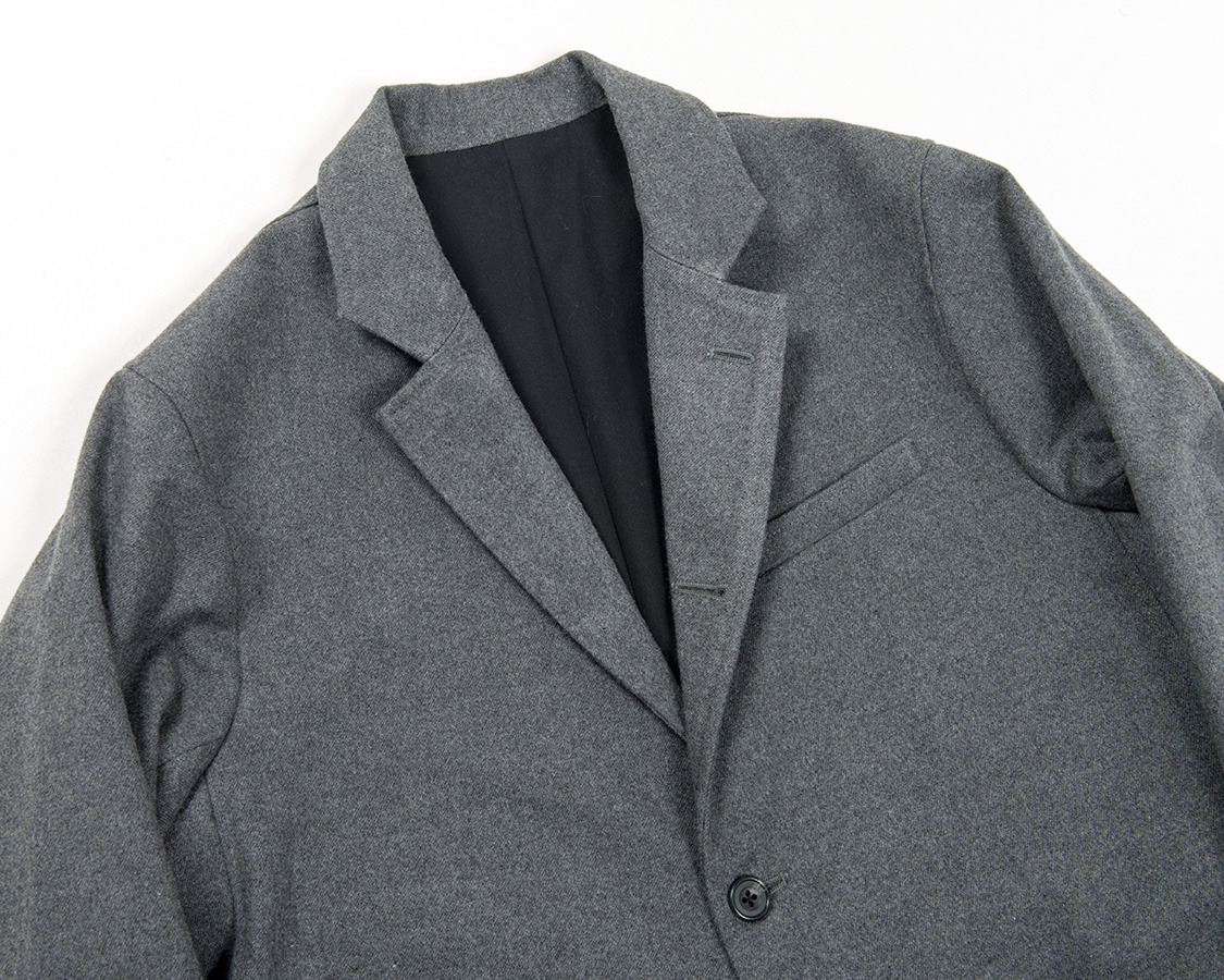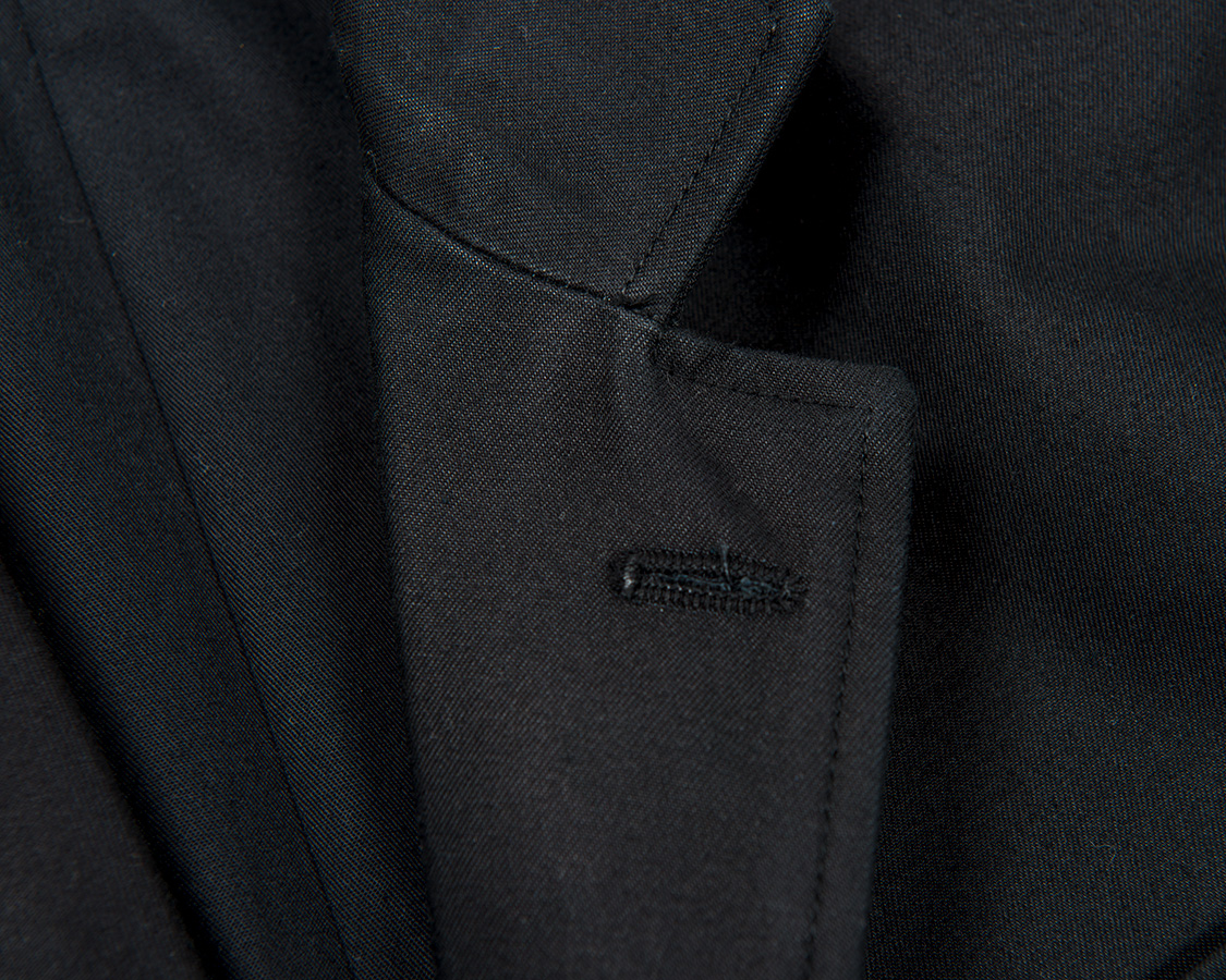 三つボタン段返り、ラペルは細すぎず太すぎず。胸は箱ポケット。