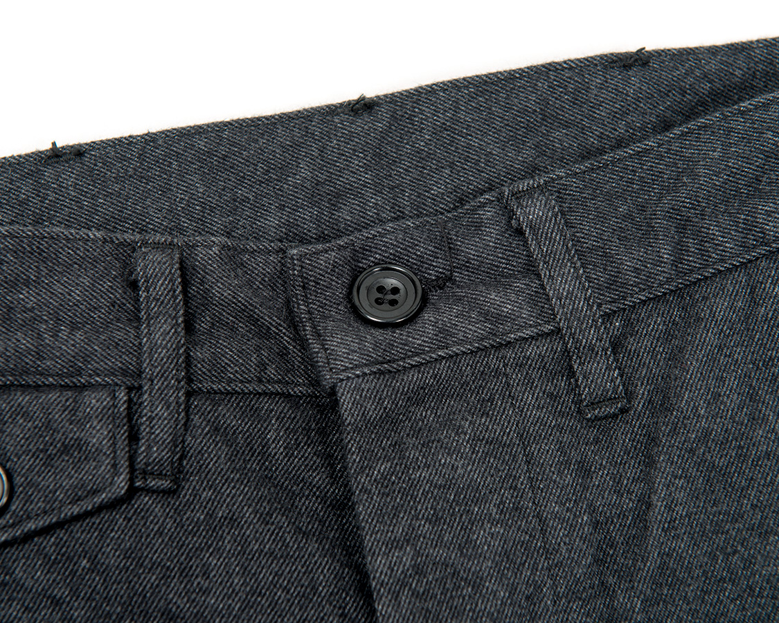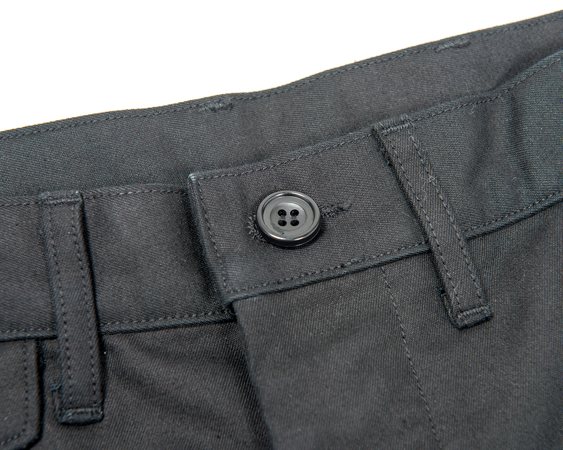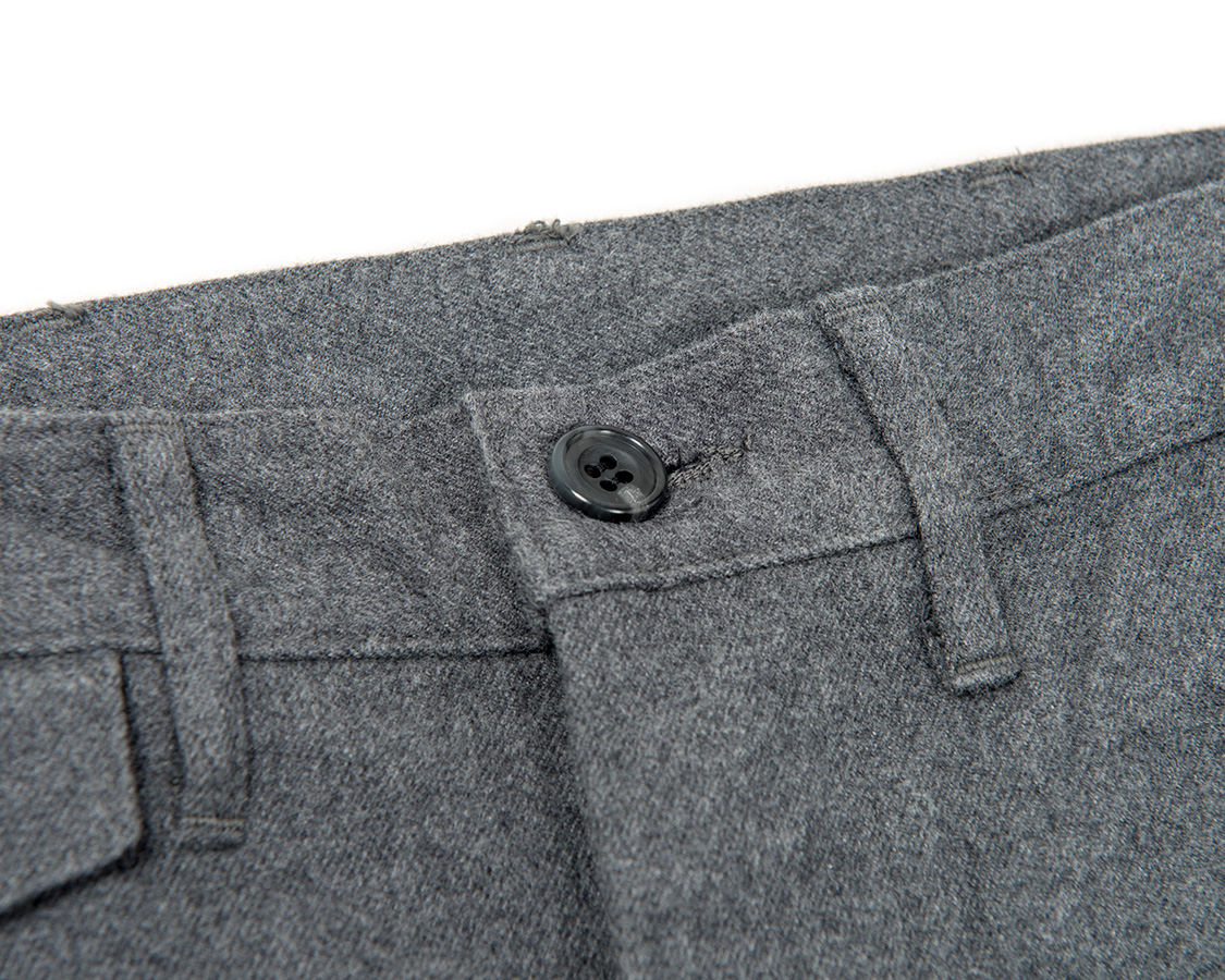 フロントボタンフライ。比翼ホールの間に比翼止めのある、いわゆるクラシックなトラウザーズ仕様。