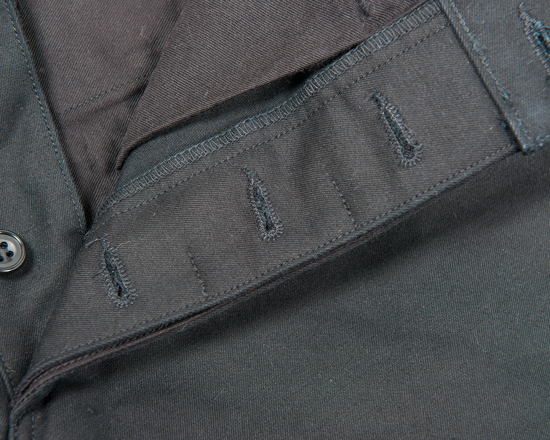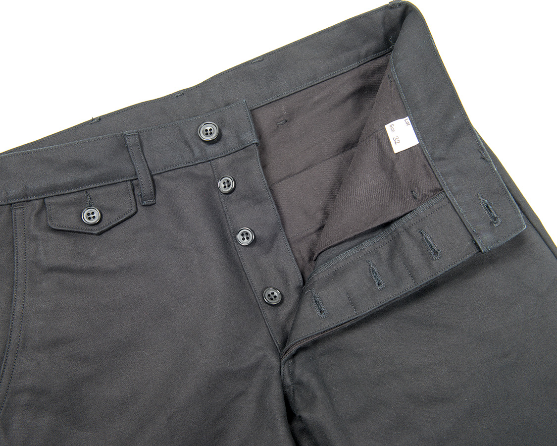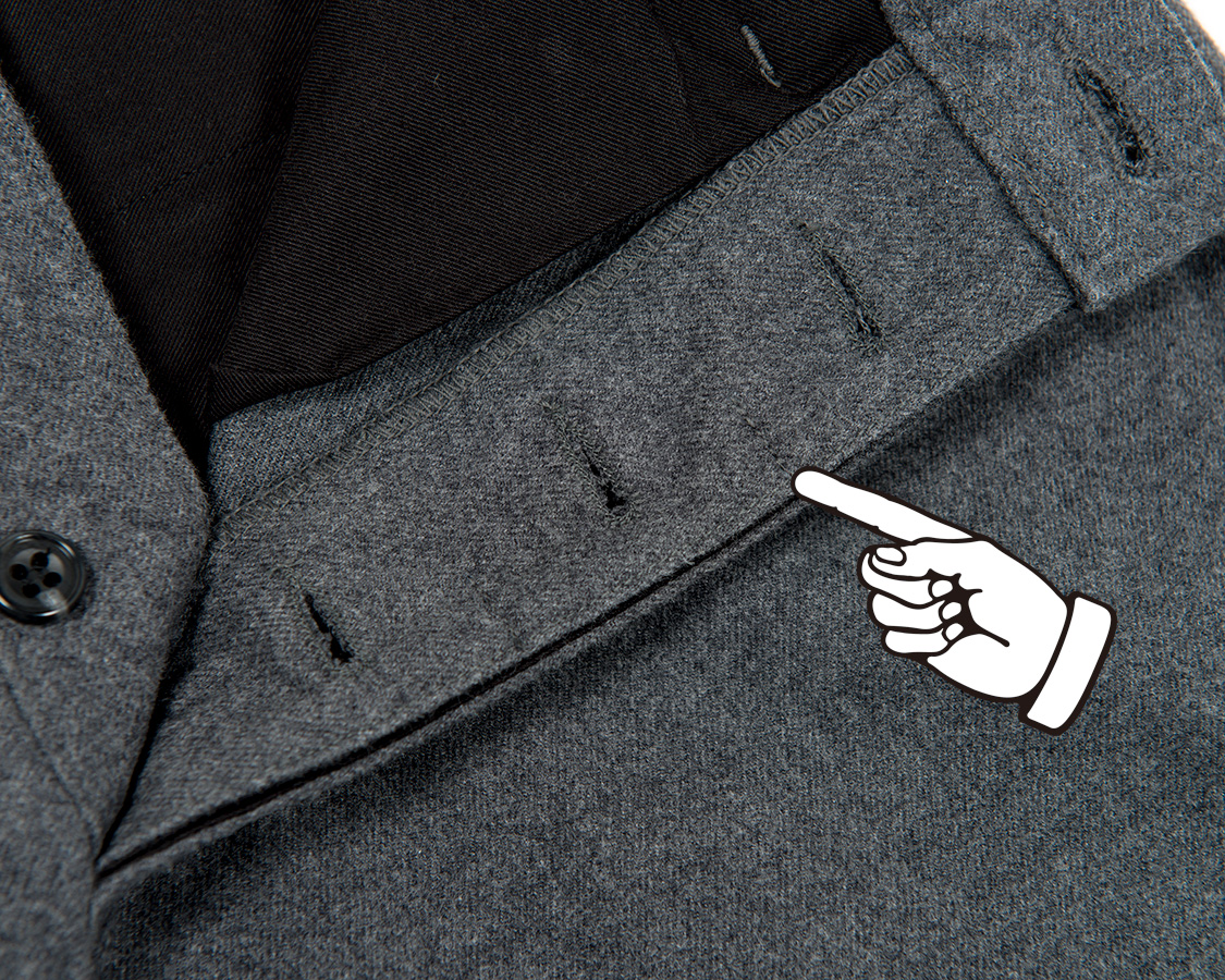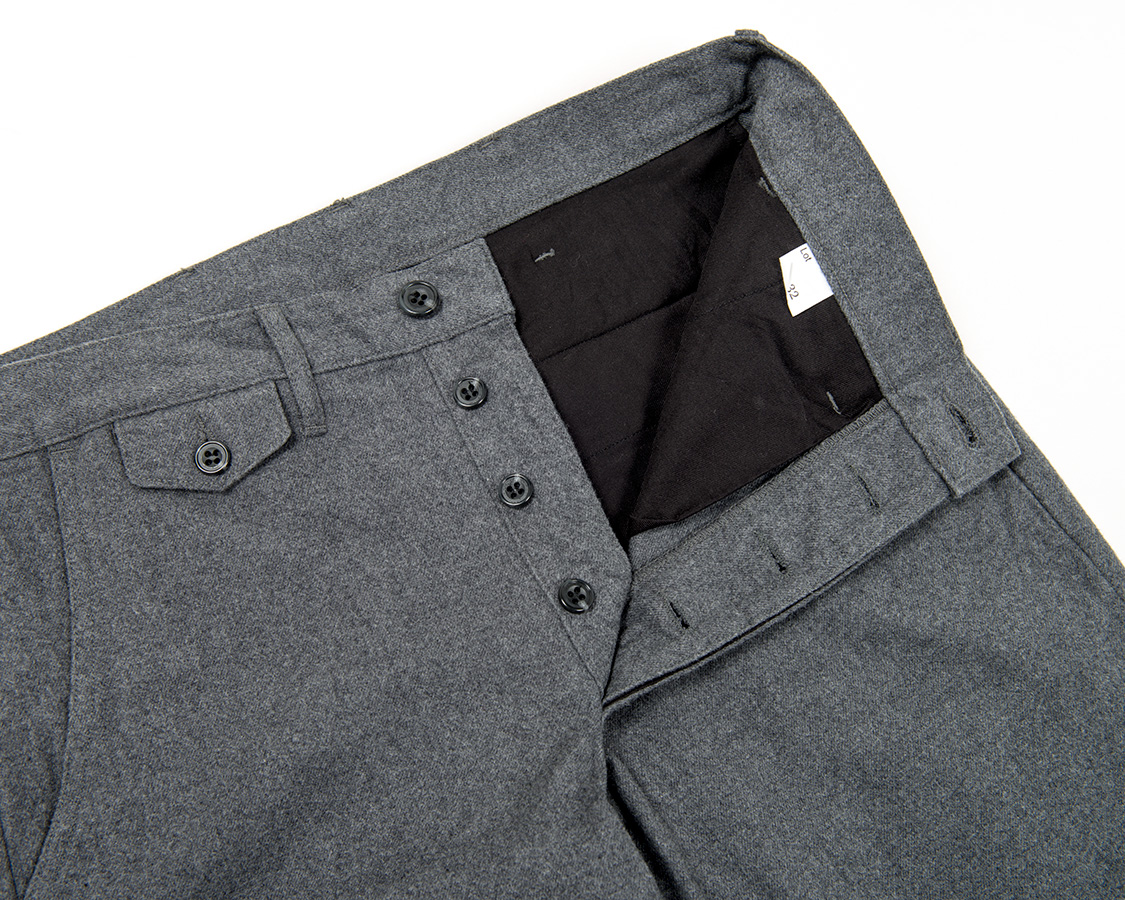 フロントボタンフライ。比翼ホールの間に比翼止めのある、いわゆるクラシックなトラウザーズ仕様。